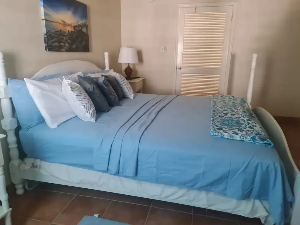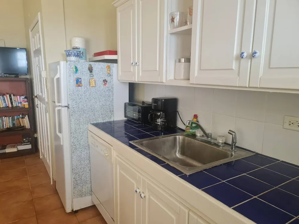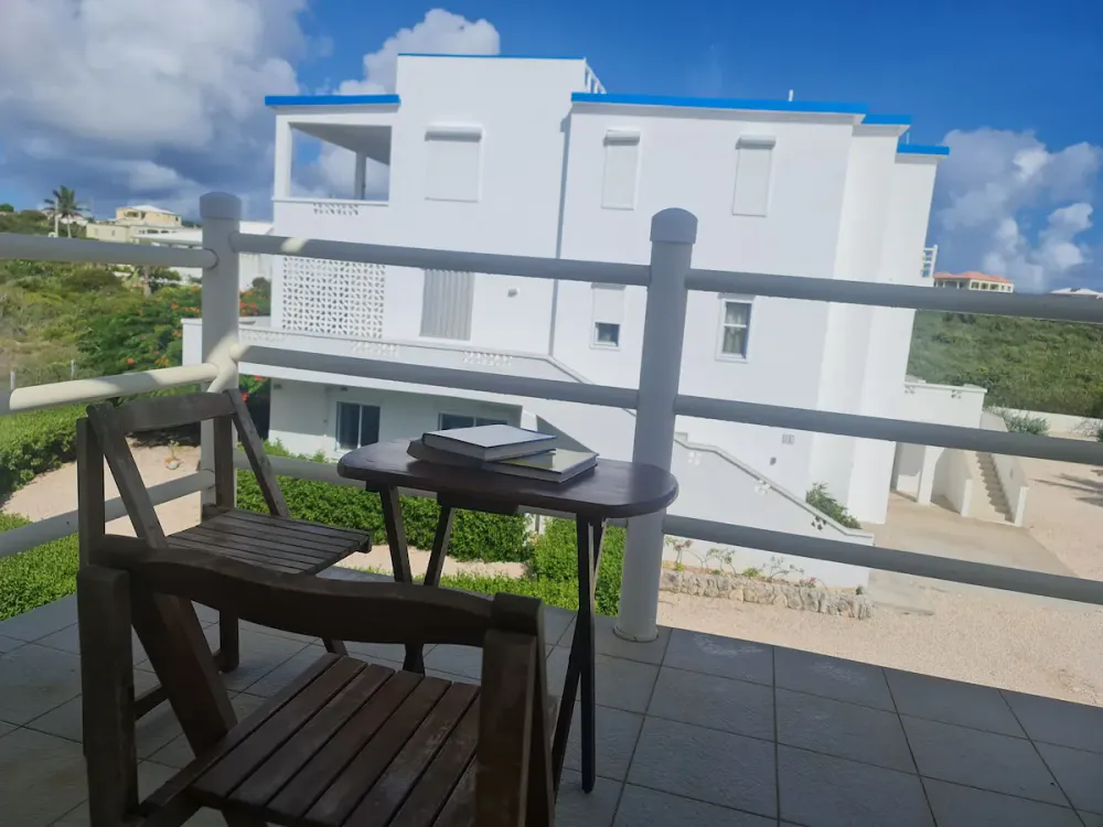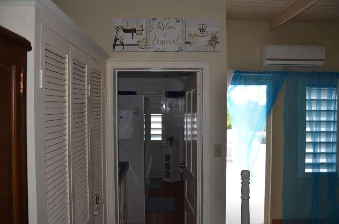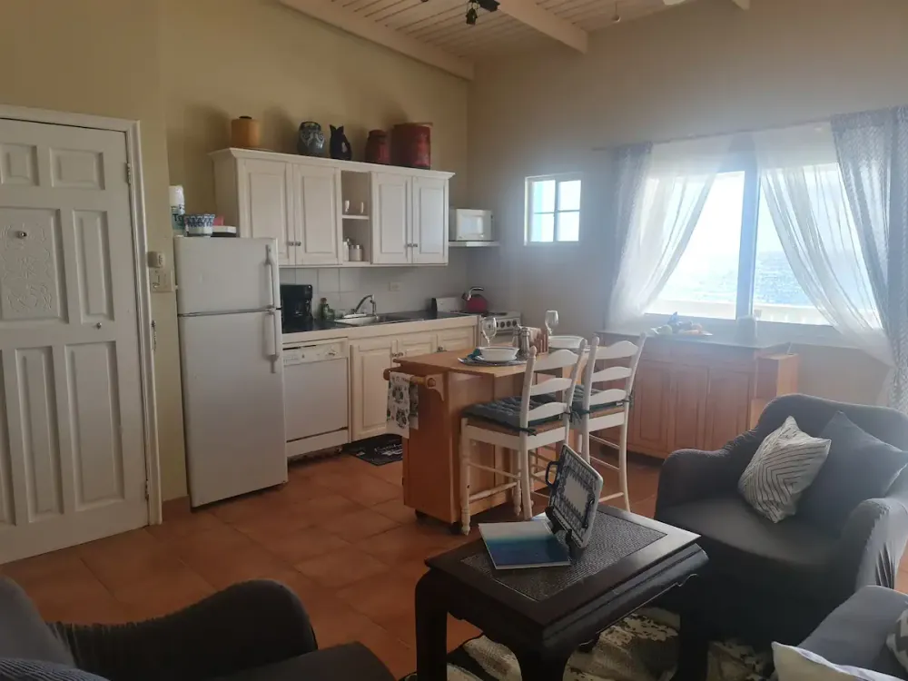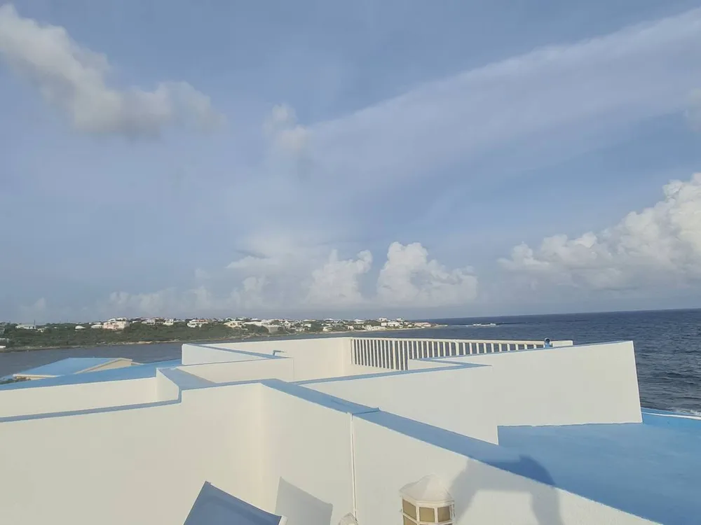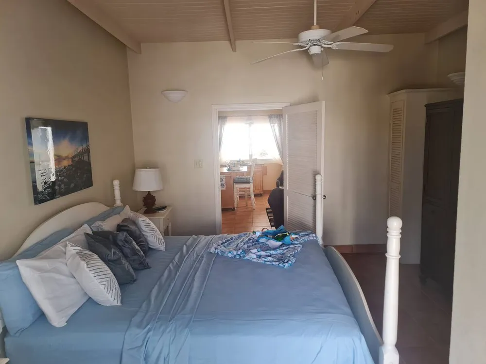 Me encanta este condominio. Situado en Sandy Hill Bay Club esta unidad de un dormitorio y un baño tiene unas vistas excepcionales de San Martin y sus alrededores desde el porche cubierto. Aunque no es grande, no le falta de nada, ya que la cocina está muy bien equipada y la acogedora sala de estar acogedora y confortable. El dormitorio alberga una cama king size y un rincón de oficina y desde allí se puede acceder a la segunda zona de porche donde hay una barbacoa y zona de almacenamiento. Unas escaleras conducen al solarium, perfecto para contemplar las estrellas. Toda la unidad tiene aire acondicionado, pero también hay una buena brisa.