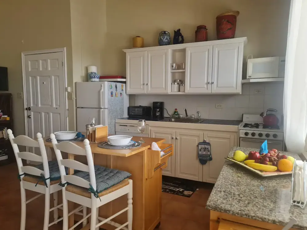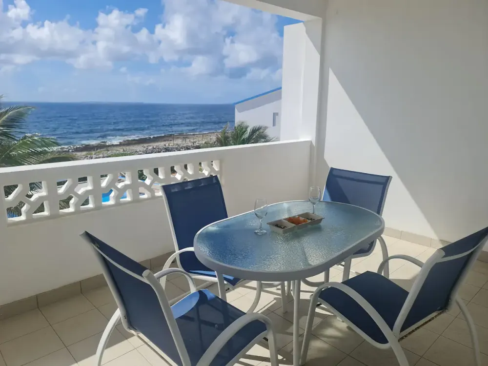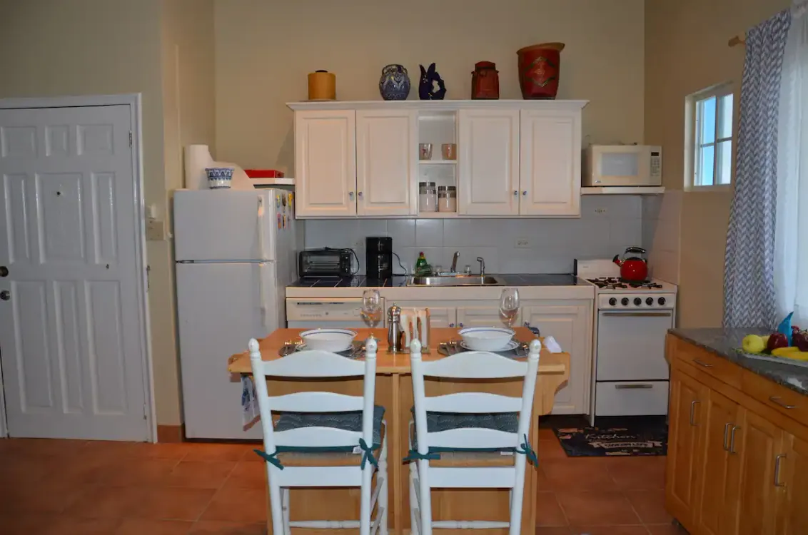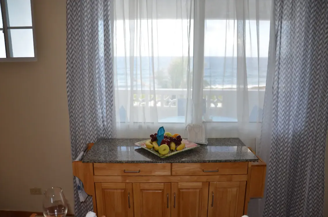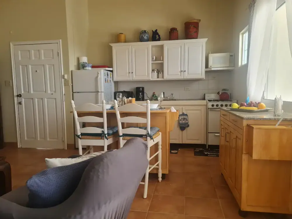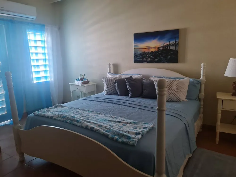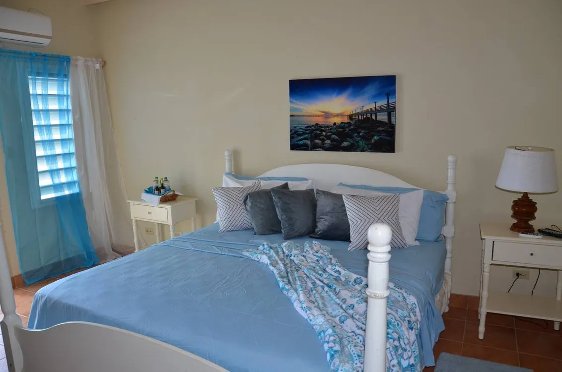 Me encanta este condominio. Situado en Sandy Hill Bay Club esta unidad de un dormitorio y un baño tiene unas vistas excepcionales de San Martin y sus alrededores desde el porche cubierto. Aunque no es grande, no le falta de nada, ya que la cocina está muy bien equipada y la acogedora sala de estar acogedora y confortable. El dormitorio alberga una cama king size y un rincón de oficina y desde allí se puede acceder a la segunda zona de porche donde hay una barbacoa y zona de almacenamiento. Unas escaleras conducen al solarium, perfecto para contemplar las estrellas. Toda la unidad tiene aire acondicionado, pero también hay una buena brisa.