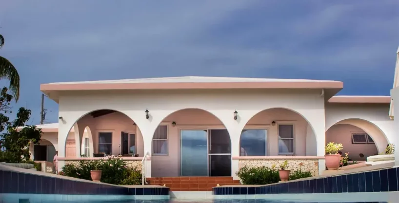 The single-story building consists of one master bedroom with ensuite bathroom plus two guest bedrooms, a separate bathroom, an open-plan living room and kitchen area, and a contiguous but independent studio with its own bathroom, kitchenette and sleeping quarters. Facing south and overlooking the picturesque inlet of Little Harbour, the main house opens to a protected gallery that leads to the gorgeous pool deck.