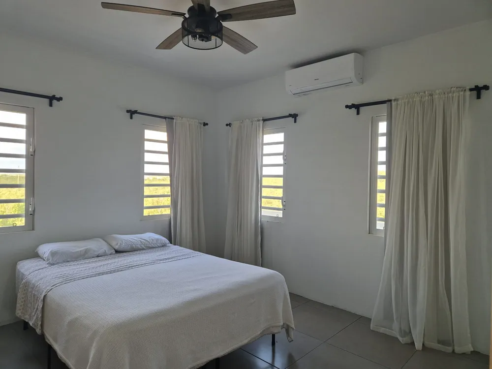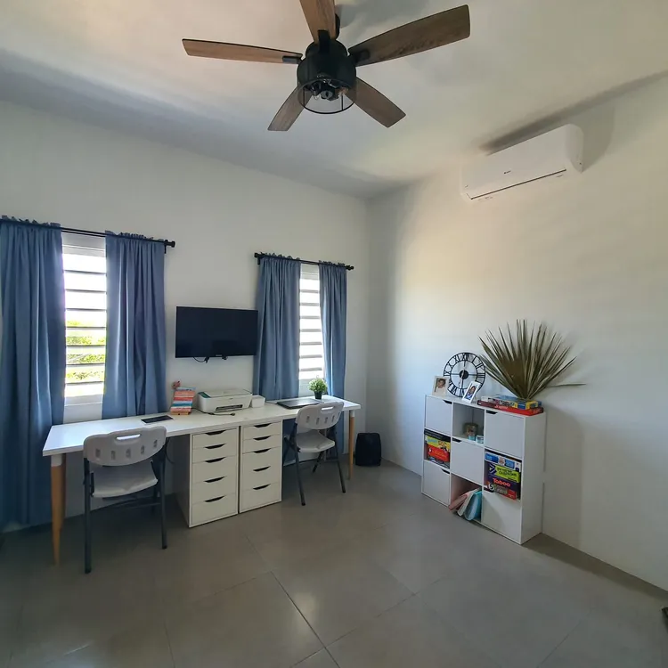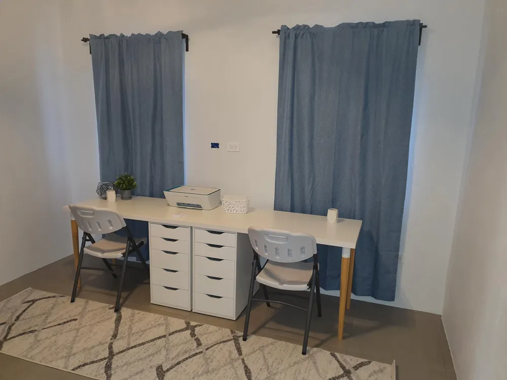 The ground floor features a versatile bedroom currently used as an office, a full bathroom, and convenient access to the one-car garage and utility area. An interior staircase leads to the second level, where you’ll find a spacious guest room with a king-size bed and a full bathroom.