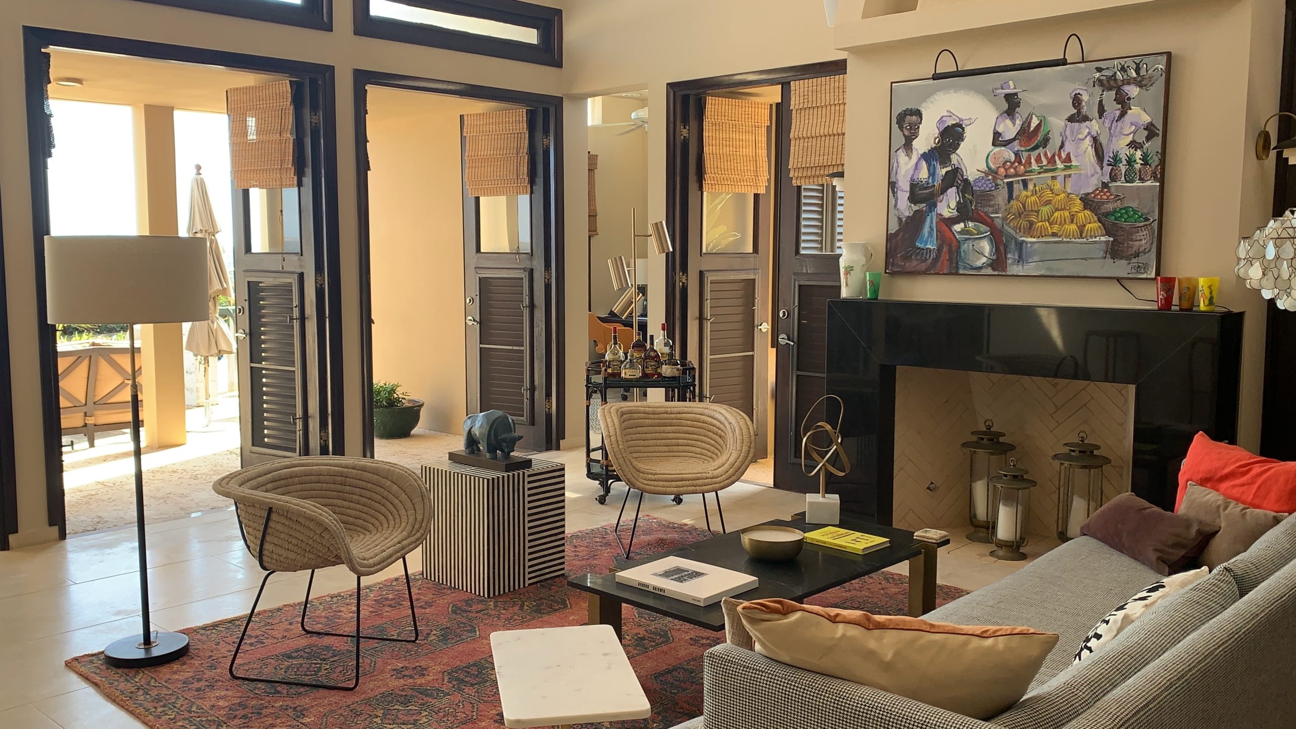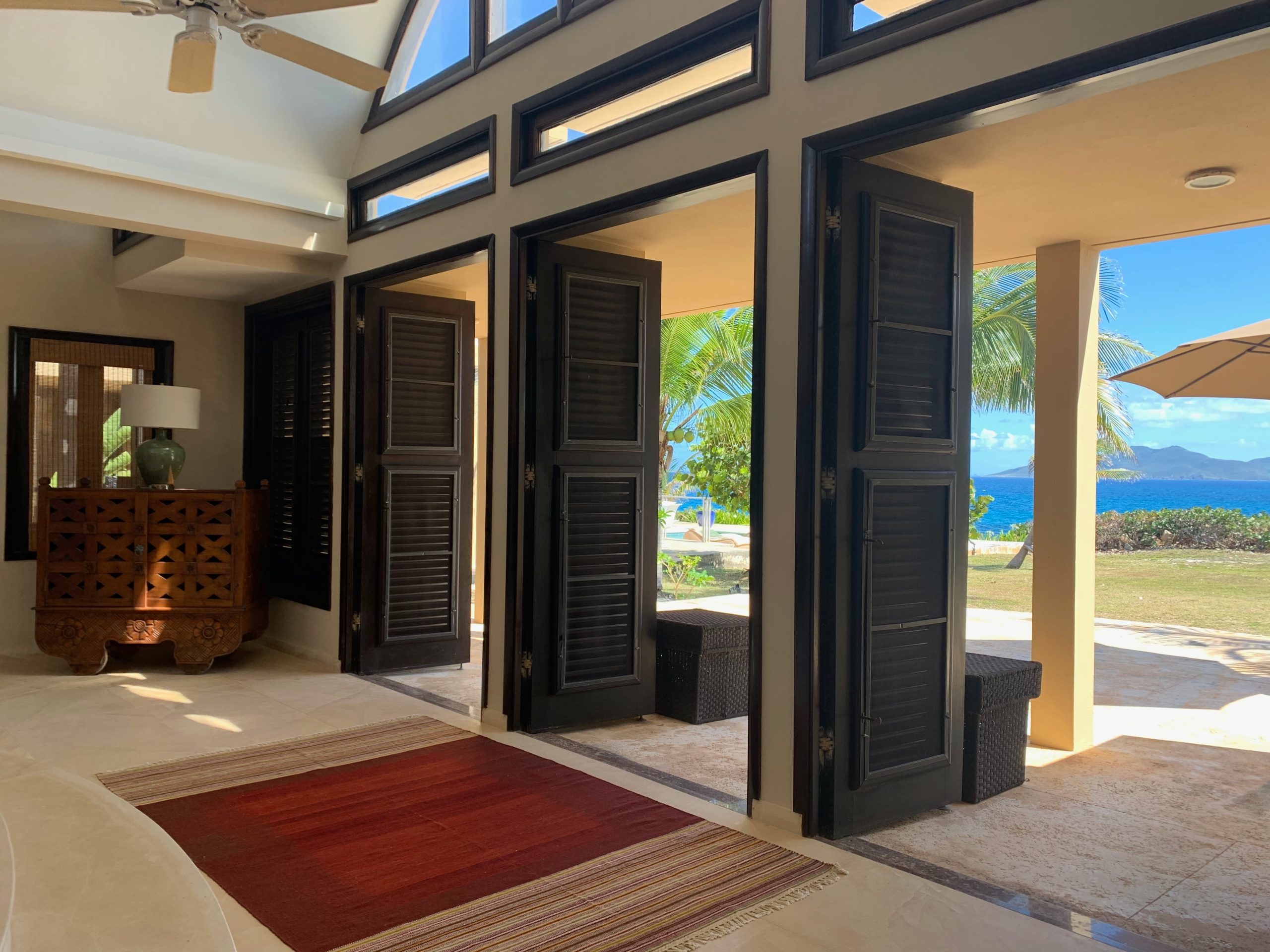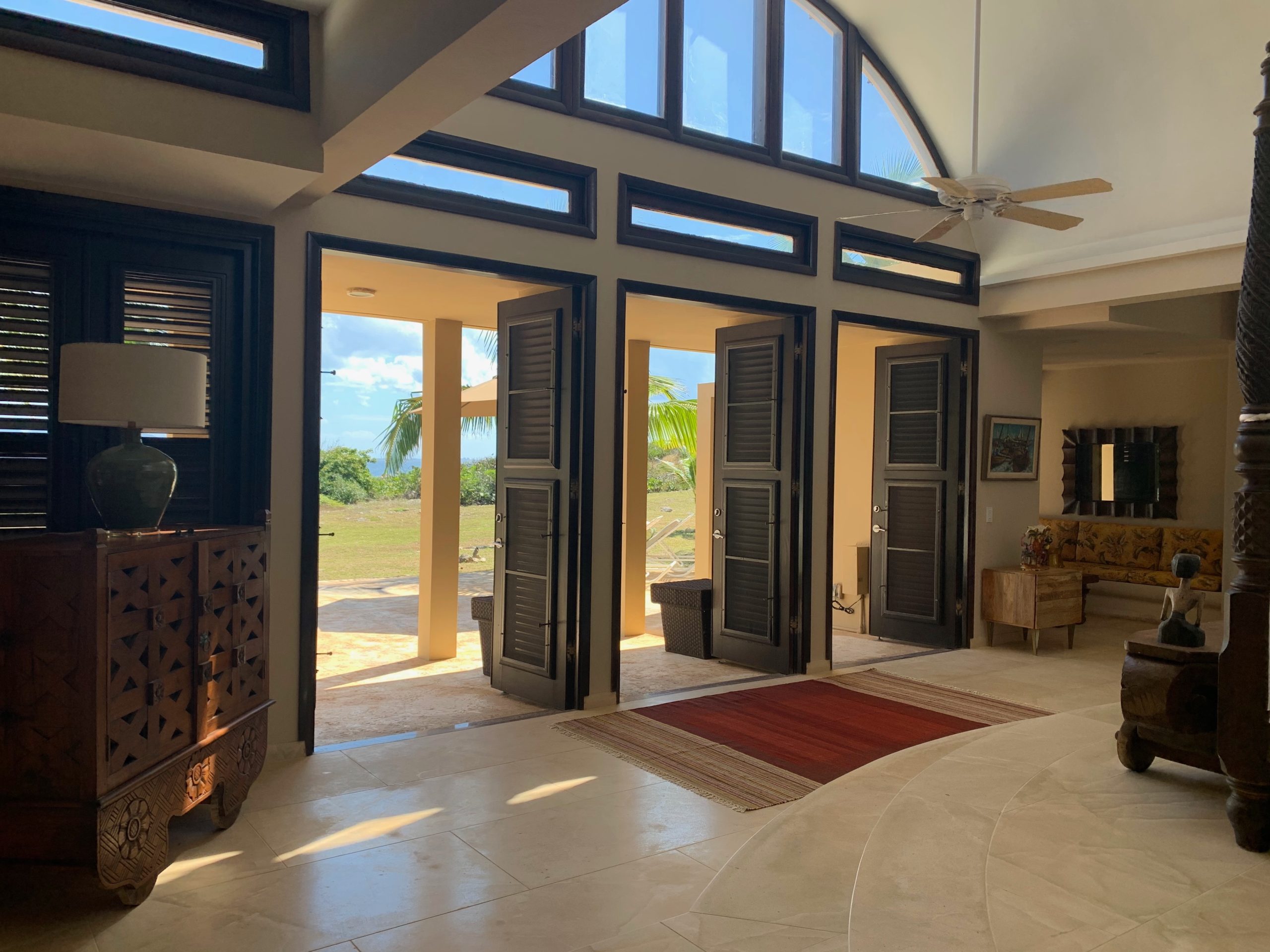 Capture the aquamarine of the Caribbean Sea and the ever changing grand vistas of St Martin by opening any of the operable hardwood louver doors that were custom designed to keep the constant caress of the trade winds flowing inside while inviting you outside. French limestone floors cool and refresh. Custom cabinetry, a notable private art collection with many listed artists, Moroccan and Indonesian furnishings are to be discovered and relished throughout.