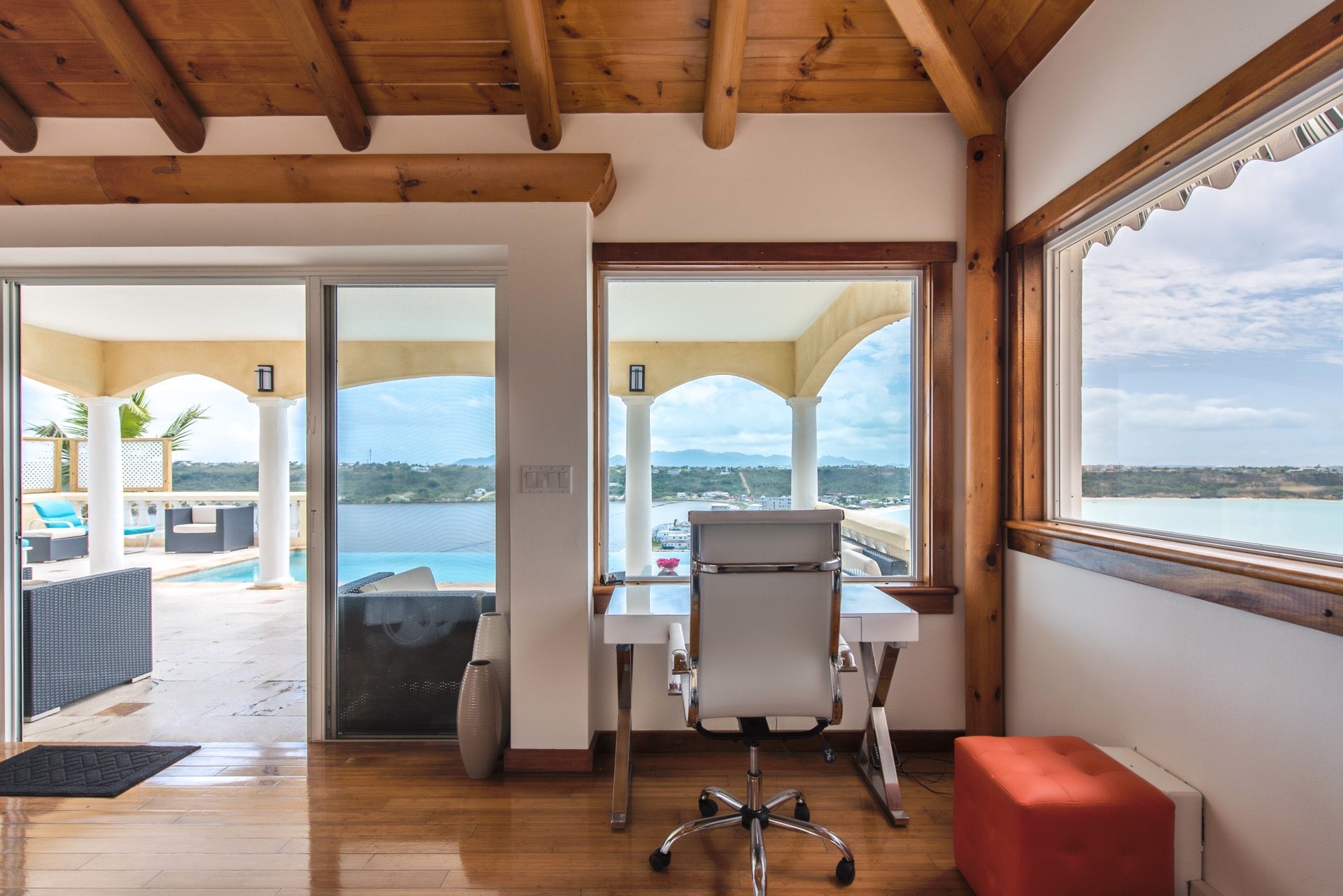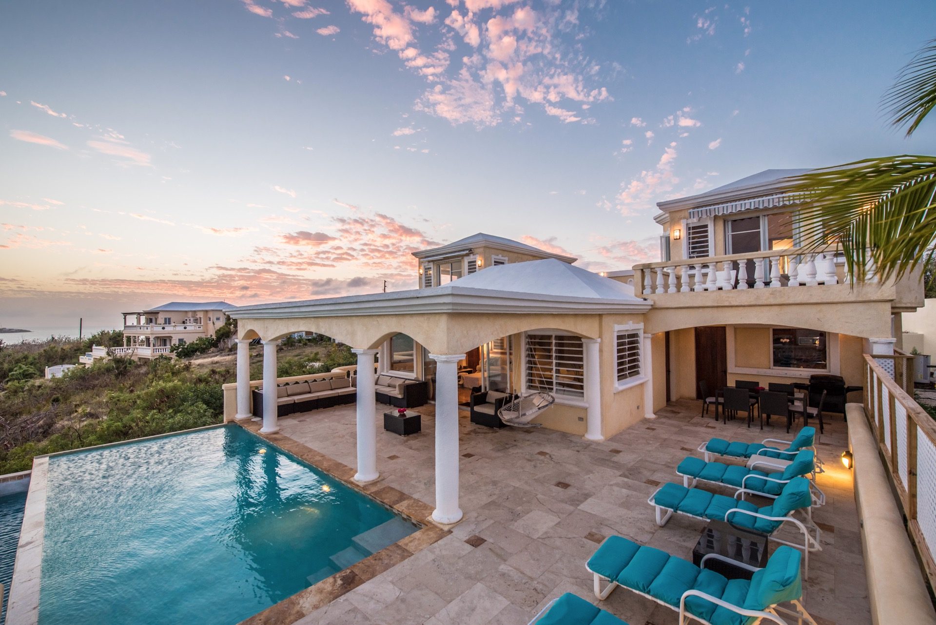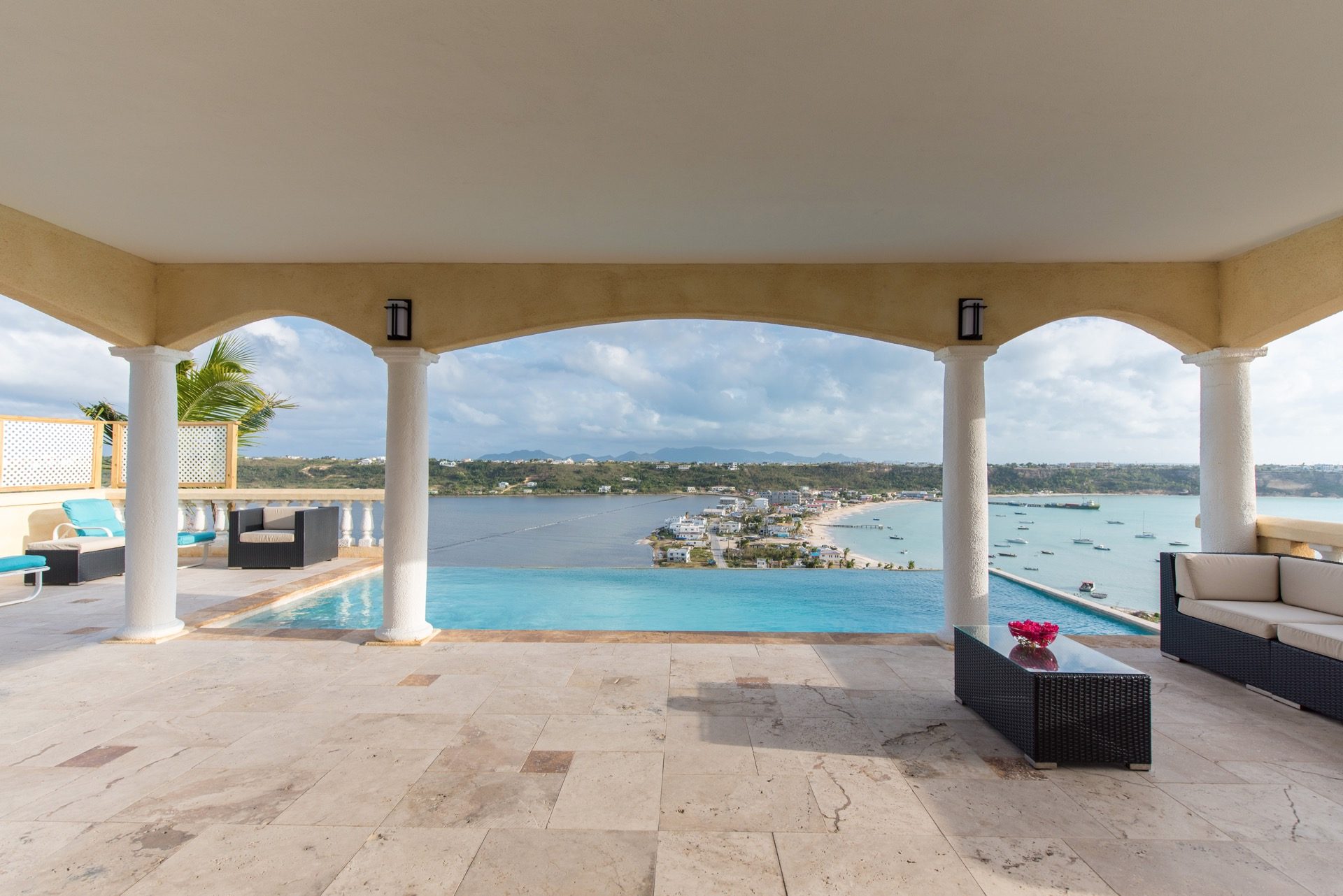 En Spyglass Hill abundan las opciones para disfrutar al aire libre. El patio al aire libre da una cálida bienvenida a la villa y trae la refrescante atmósfera del exterior al interior. Los adoquines de travertino y las paredes de piedra de Anguila talladas a mano contribuyen a un ambiente elegante y acogedor. Una piscina de borde infinito crea la ilusión de una cascada de agua en el mar Caribe, mientras que la amplia terraza ofrece diversas opciones para relajarse junto a la piscina, entretenerse o cenar bajo las estrellas.