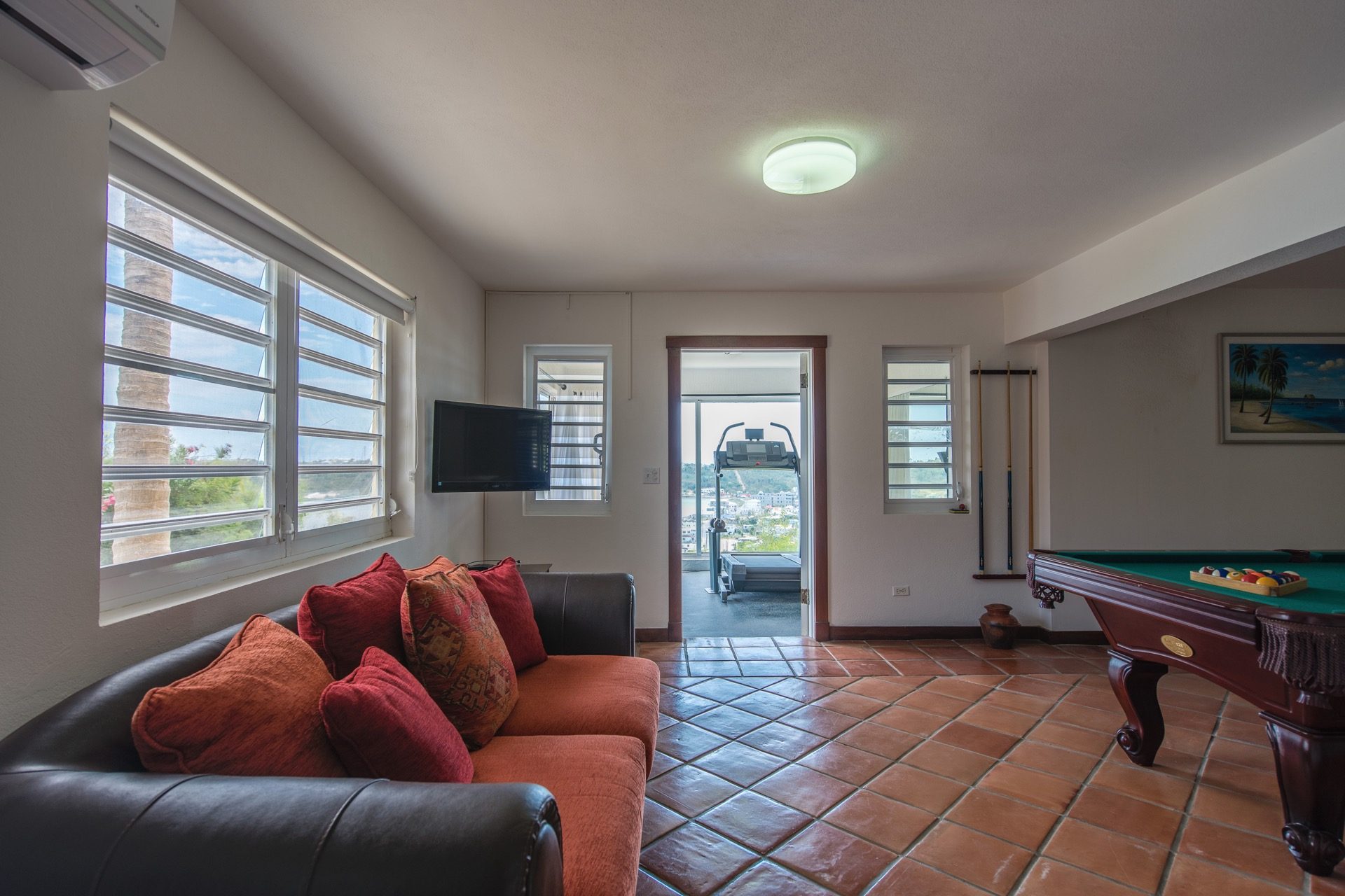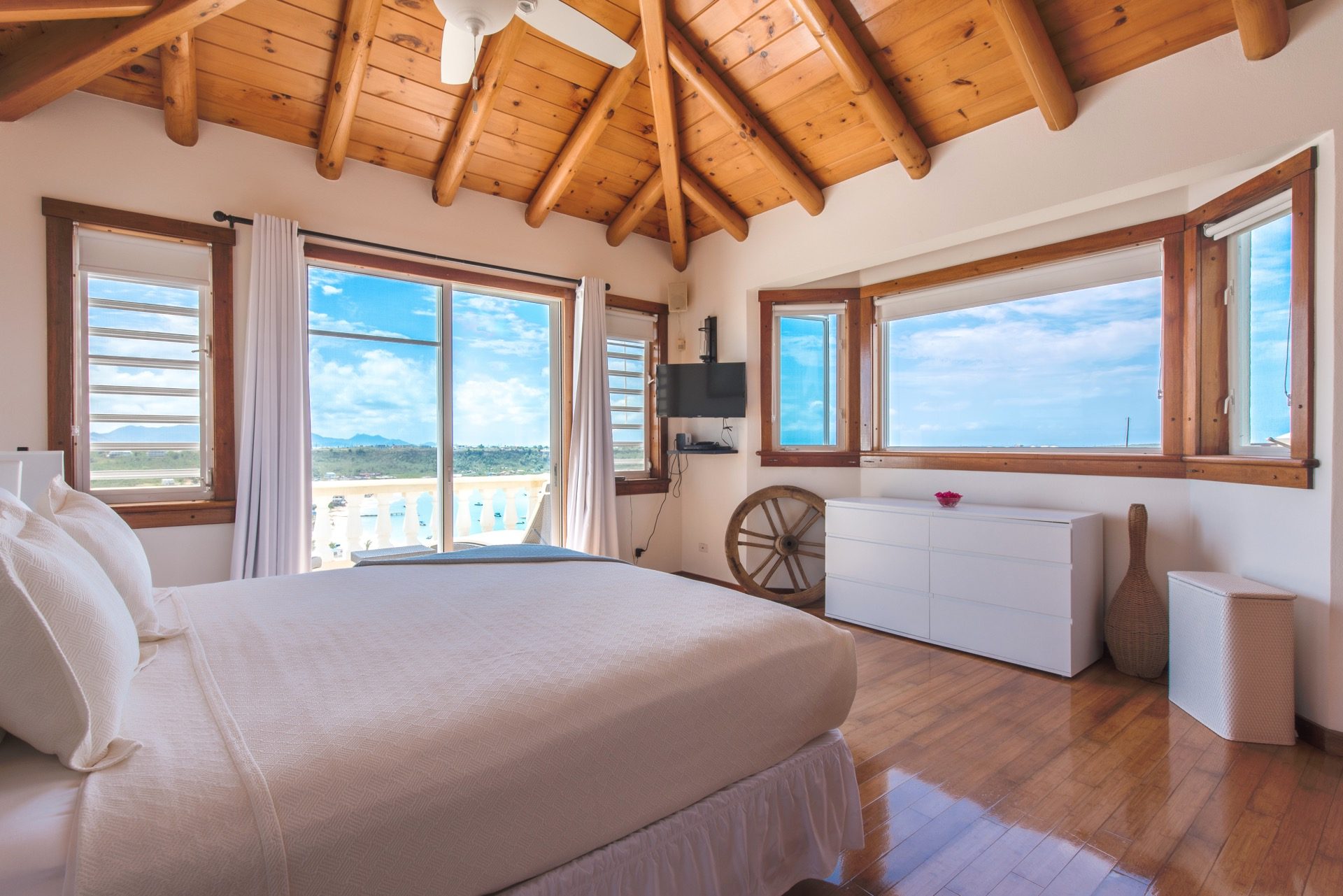 Spyglass Hill captura la esencia del estilo y diseño caribeño con sus relajantes y rejuvenecedores espacios interiores y exteriores. Esta residencia está inspirada en un gran atrio interior y luce la calidez natural de la madera en todas sus estancias, desde auténticos suelos de bambú hasta techos de troncos redondos y decoración con madera de deriva de la playa. La villa cuenta con cuatro amplios dormitorios, incluyendo dos suites principales con baño en suite en la planta superior y dos habitaciones adicionales para invitados, una en la planta principal y la otra en la planta baja. Las suites principales ofrecen magníficas vistas de la bahía y un estilo de vida elegante, cada una con patio privado y baño de piedra natural con ducha exterior y jacuzzi. La planta principal alberga un dormitorio de invitados con baño en suite que da a un patio privado junto a la terraza de la piscina. La Suite del Dormitorio de Entretenimiento cuenta con baño independiente y zona de entretenimiento. Junto a la suite se encuentra un gimnasio diseñado específicamente para este fin, con paneles corredizos de vidrio que ofrecen vistas panorámicas y brisas refrescantes. Una cocina totalmente equipada de última generación, acogedoras áreas de estar y comedor, tocador, lavandería y garaje, generosos patios cubiertos y abiertos completan el piso principal.