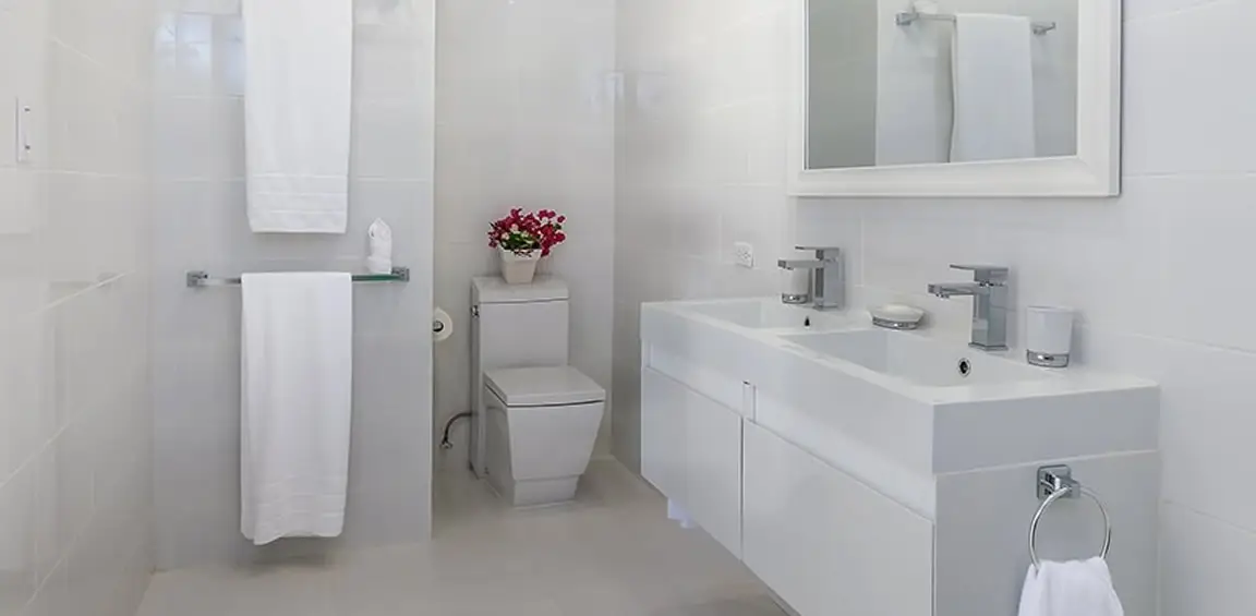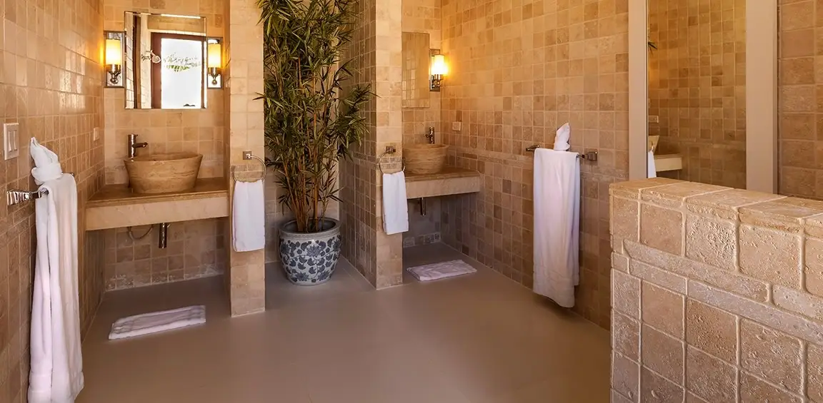 The main house features a chef’s kitchen and spacious, open plan living room and dining room with floor to ceiling sliding doors opening on to a terrace and offering panoramic views of the turquoise sea. The large terrace overlooks 1 of the 2 pools and is ideal for relaxing outside in the sunshine.