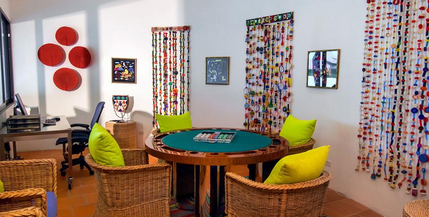 • Sitting room with African sculpture and chandelier with over 1 million beads