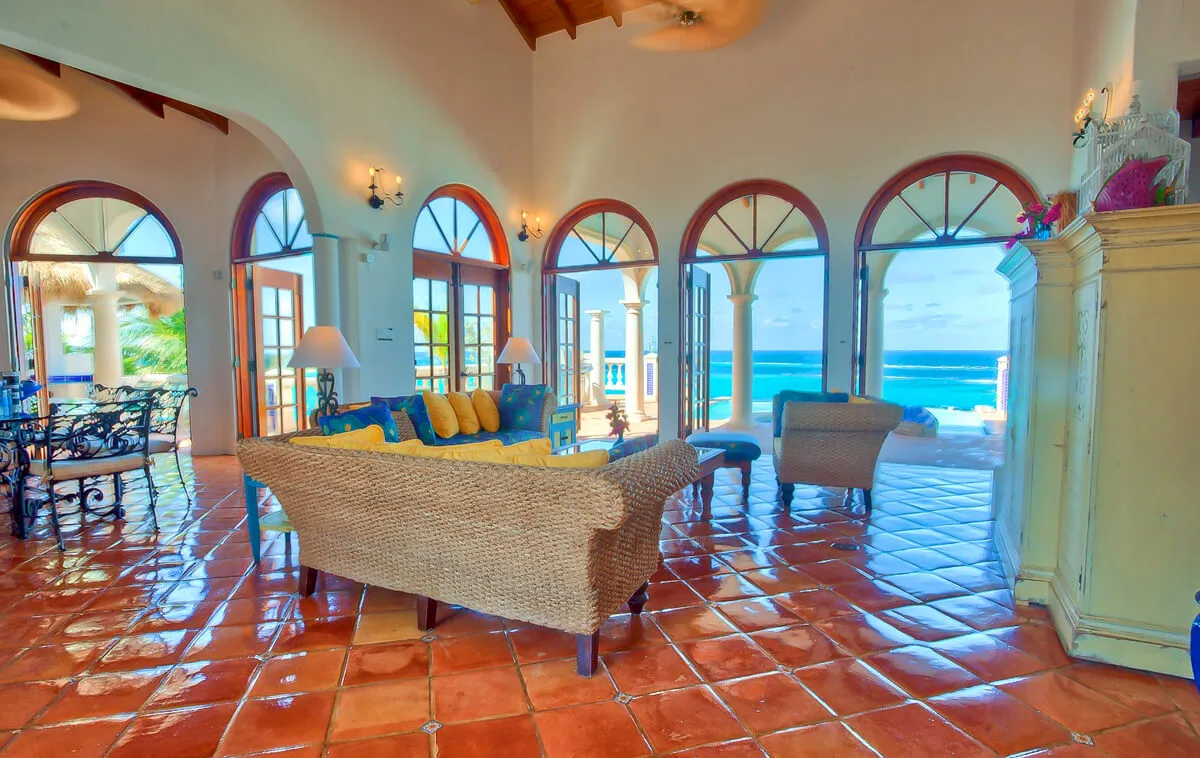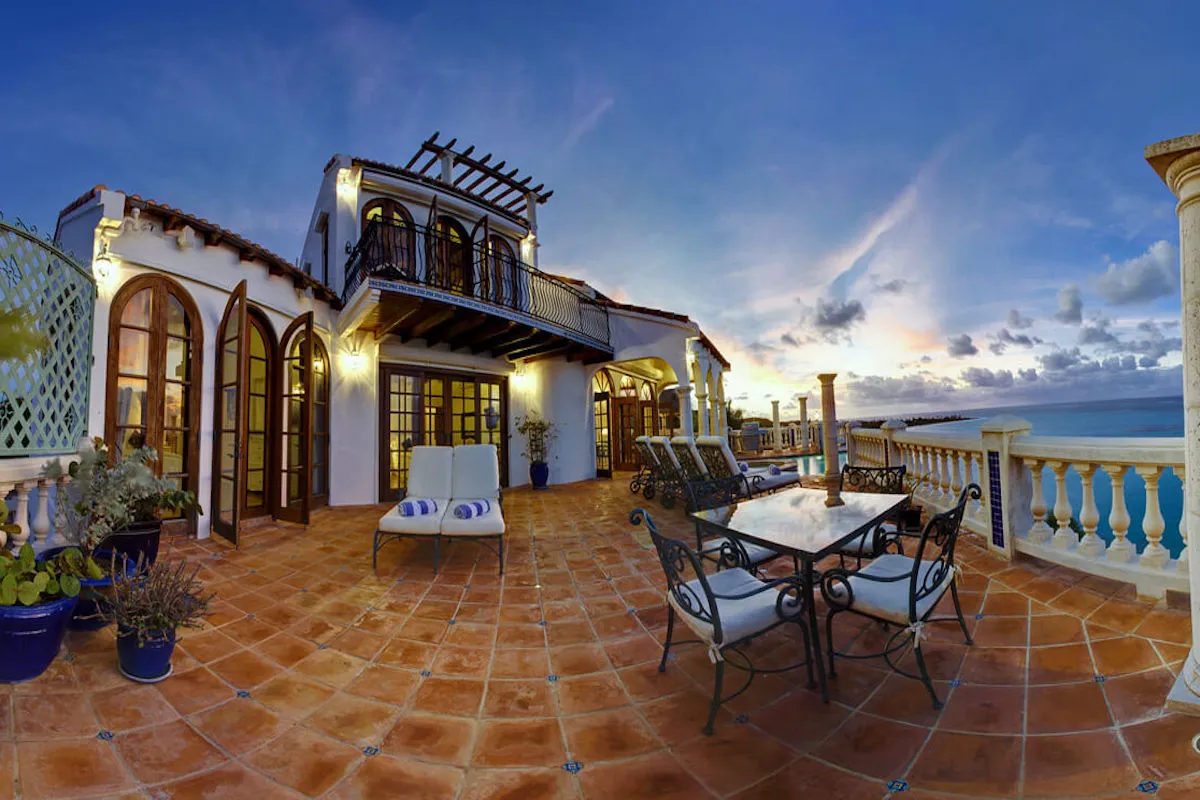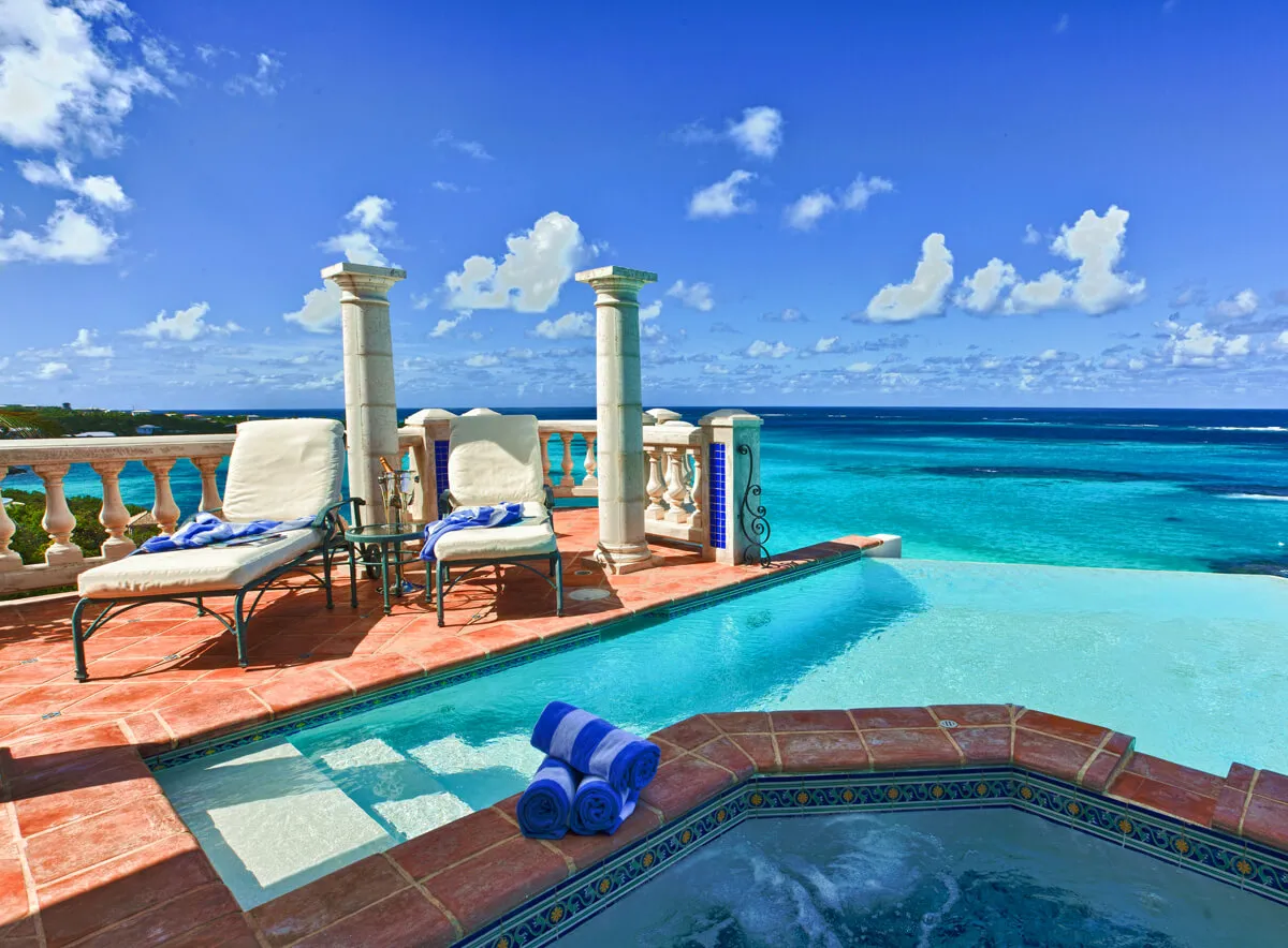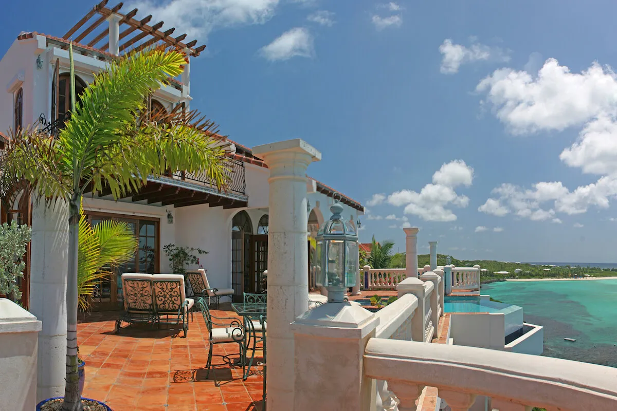 Azure Villa is a true Italian villa with 9,000 square feet of Mediterranean architecture, like columns and arches. In addition to the 5 bedrooms and 4.5 bathrooms, there’s tons of outdoor space– 6 large decks and 3 outdoor showers. Shoal Bay is nearby, and there’s several restaurants in the area.