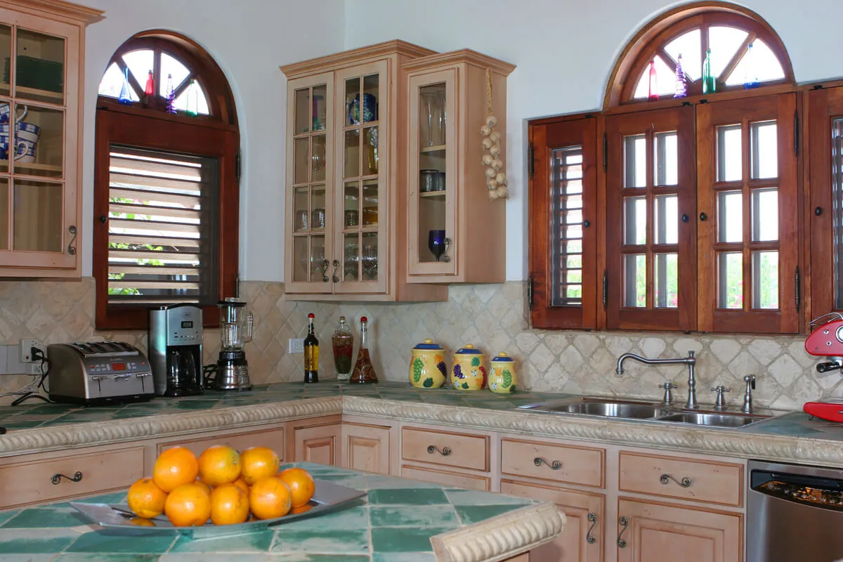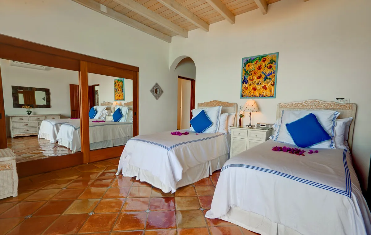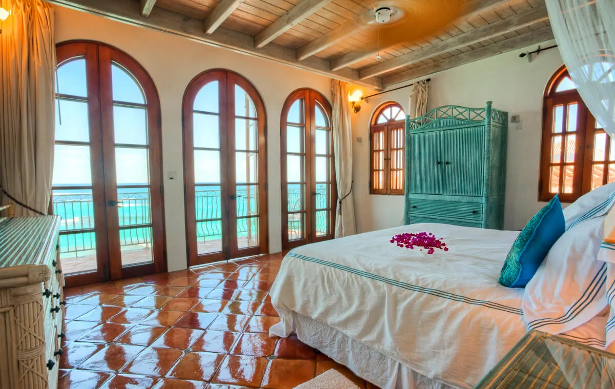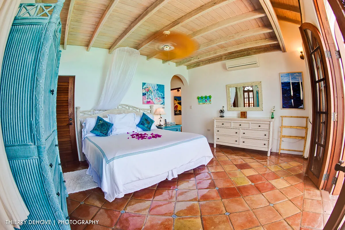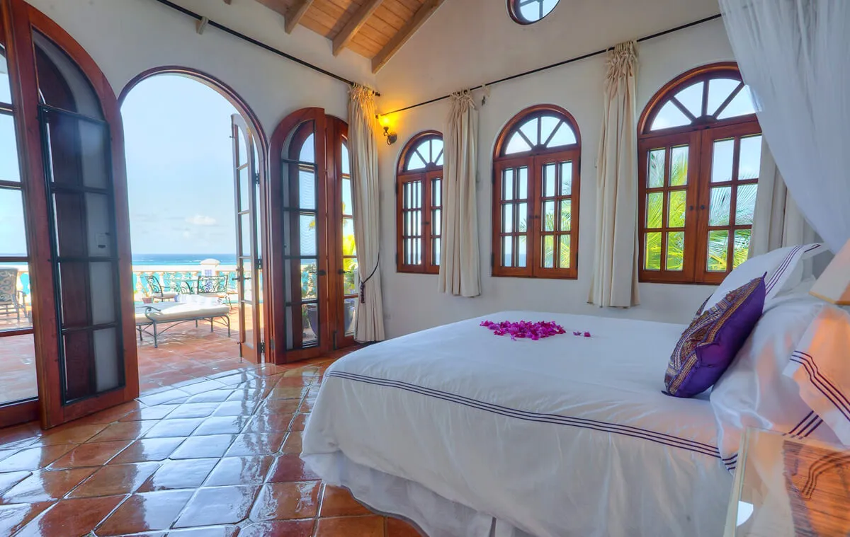 Azure Villa is a true Italian villa with 9,000 square feet of Mediterranean architecture, like columns and arches. In addition to the 5 bedrooms and 4.5 bathrooms, there’s tons of outdoor space– 6 large decks and 3 outdoor showers. Shoal Bay is nearby, and there’s several restaurants in the area.