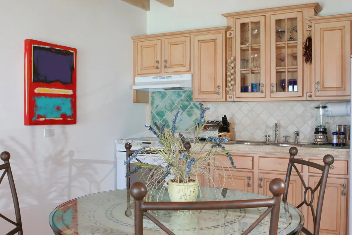 Azure is near amazing snorkeling and swimming, and the beach is 500 yards away. There are reserved beach chairs at Shoal Bay East, so guests can sunbathe by the sea with ease. At the villa, there’s an infinity edge pool with a spa tub and wading areas. Its surrounded by a large sundeck with 360º views of Shoal Bay Beach, St. Martin, Island Harbour, and the sea. The dining area on the pool deck has a thatched roof and an inlaid glass-tiled wet bar. Guests can grill fresh-caught fish from the market on the gourmet barbecue. There are three open-air showers spread throughout the home.