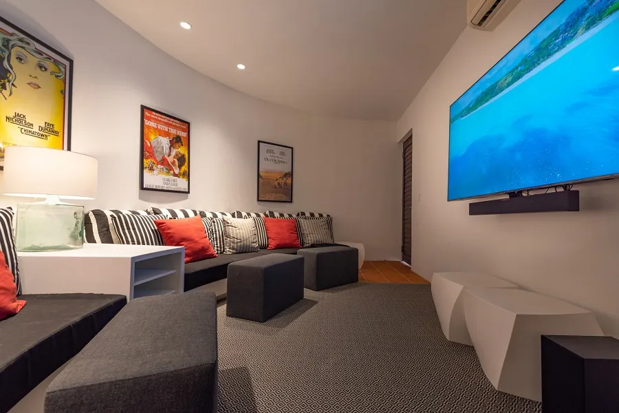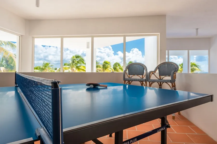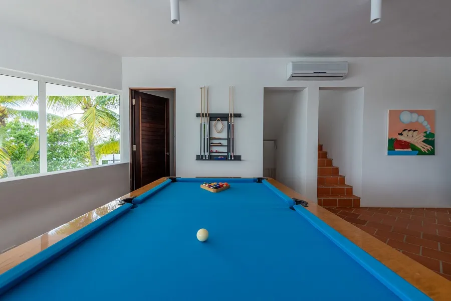Blue Diamond features a grand ballroom-like area with 21-feet ceilings and French windows, in addition to a triangular, glass topped table in the formal dining room that can seat up to fourteen people. A custom-built semi-circular bar with cooktop and refrigerator leads into the gourmet kitchen, and there are private powder rooms in each of the surrounding alcoves. On the second floor there is a fully stocked entertainment room, which comes with its own pool table, two card tables, and a table tennis table. Serious gamers should be aware, though, that any attempt at concentrating in the entertainment room are likely to be ruined by the spectacular ocean view.