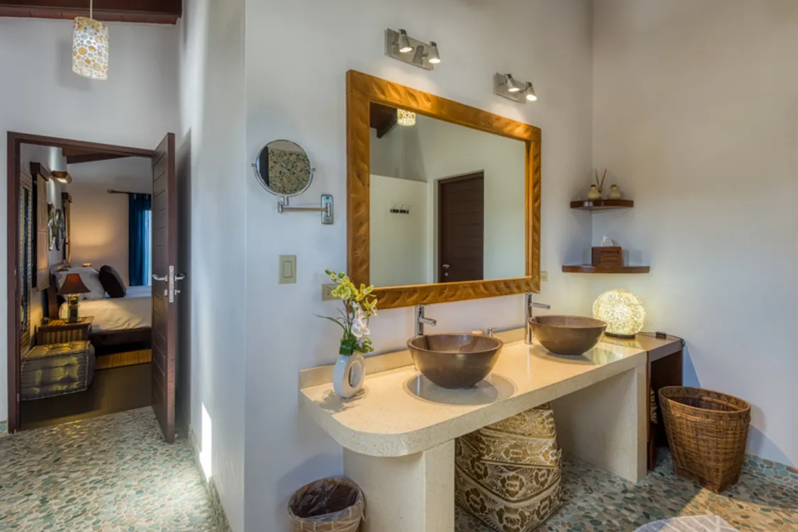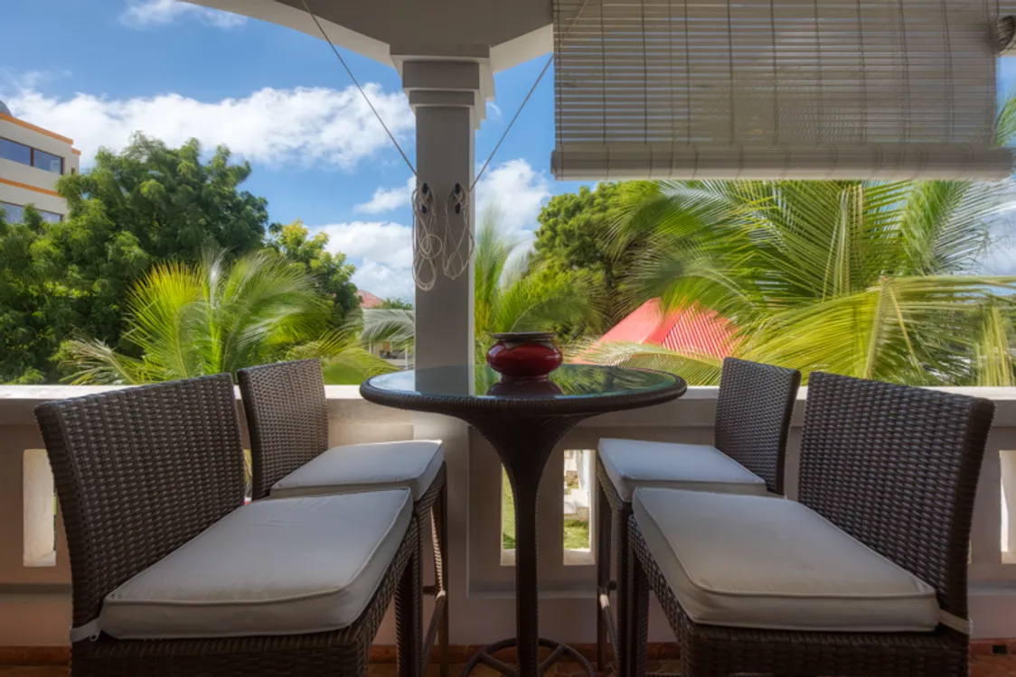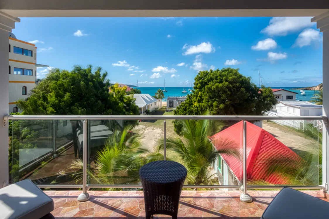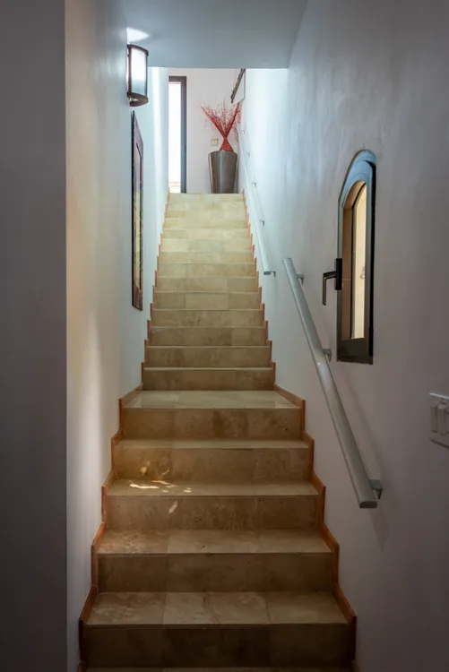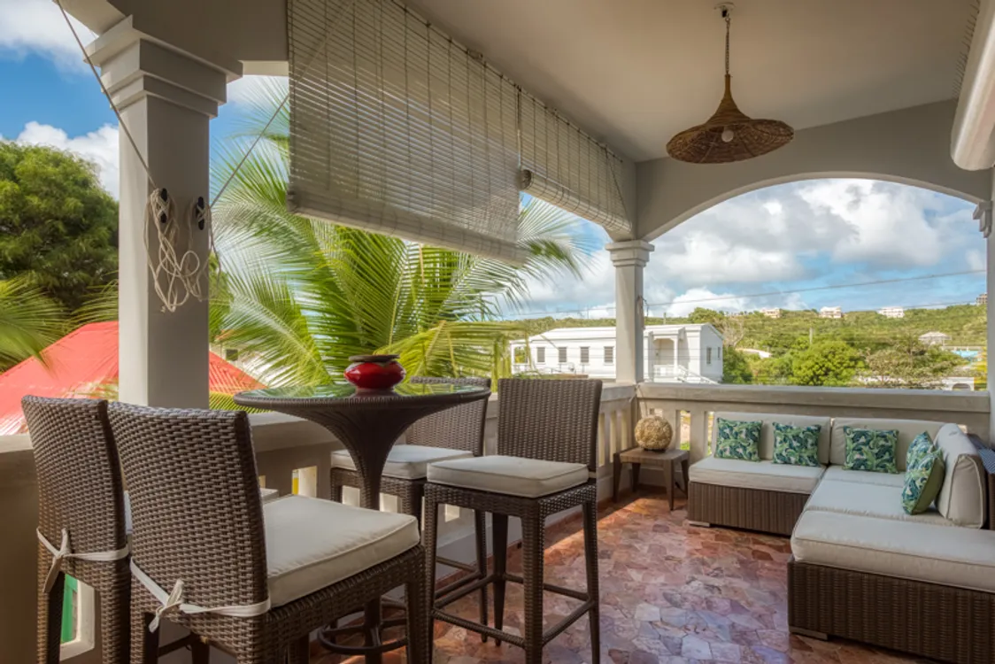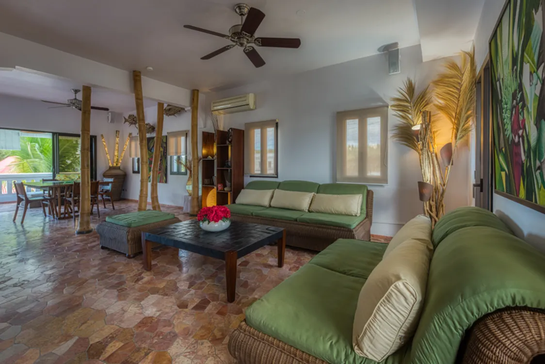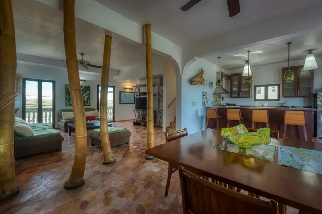 On the second floor is a modern, well furnished and spacious 2 bedroom apartment. As you enter there is a comfortable living area, dining table and will equipped kitchen as weil as a large porch with outside furnishing for dining and lounging. Up a set of stailrs are the two king size, ensuite bedrooms both with private porches and great views of the sea and beach. This apartment is also suitable as a rental.