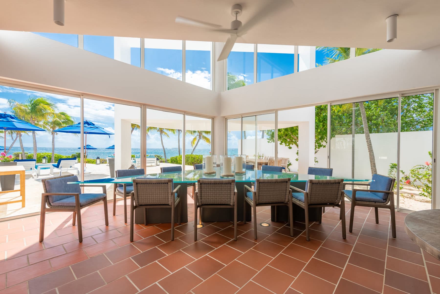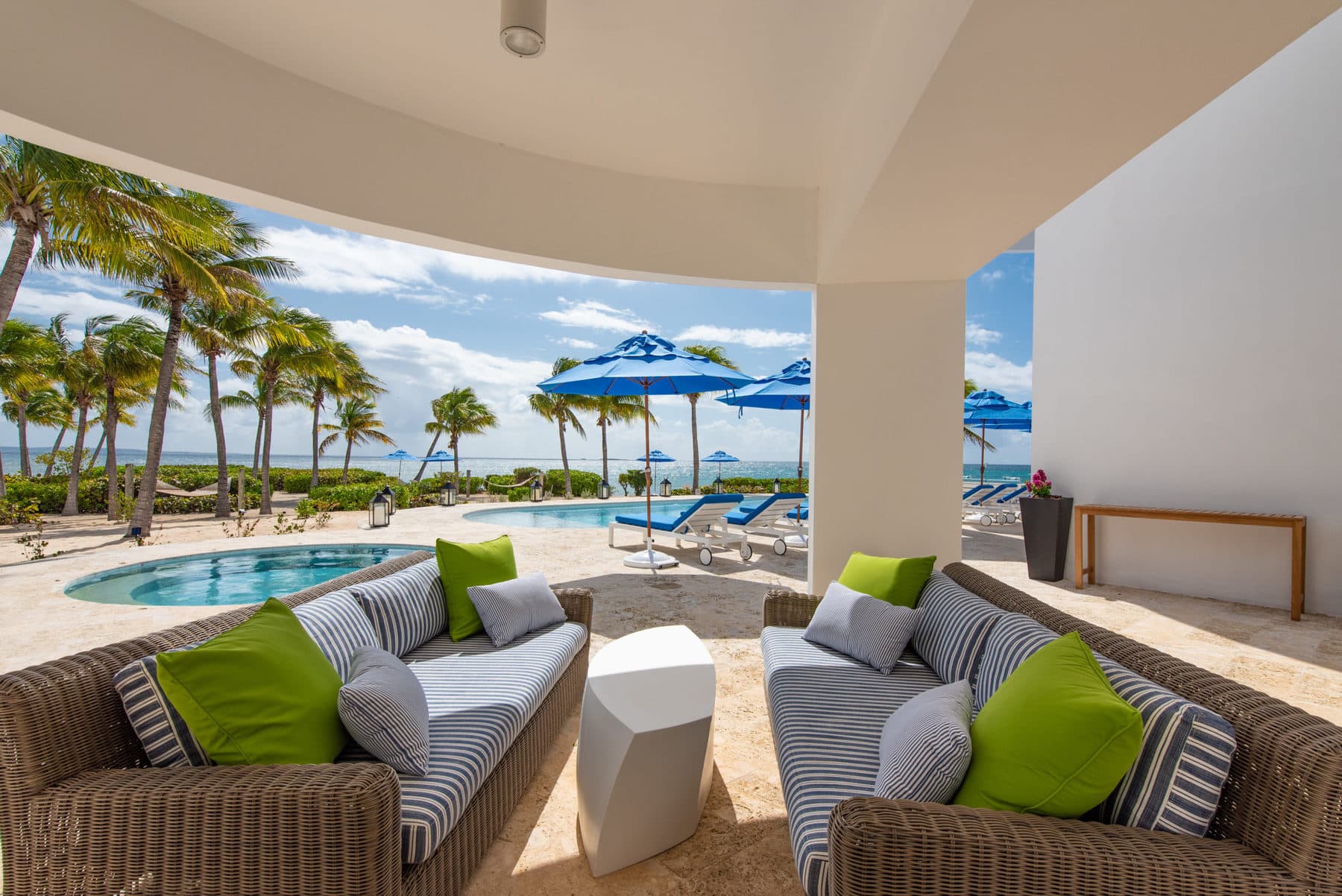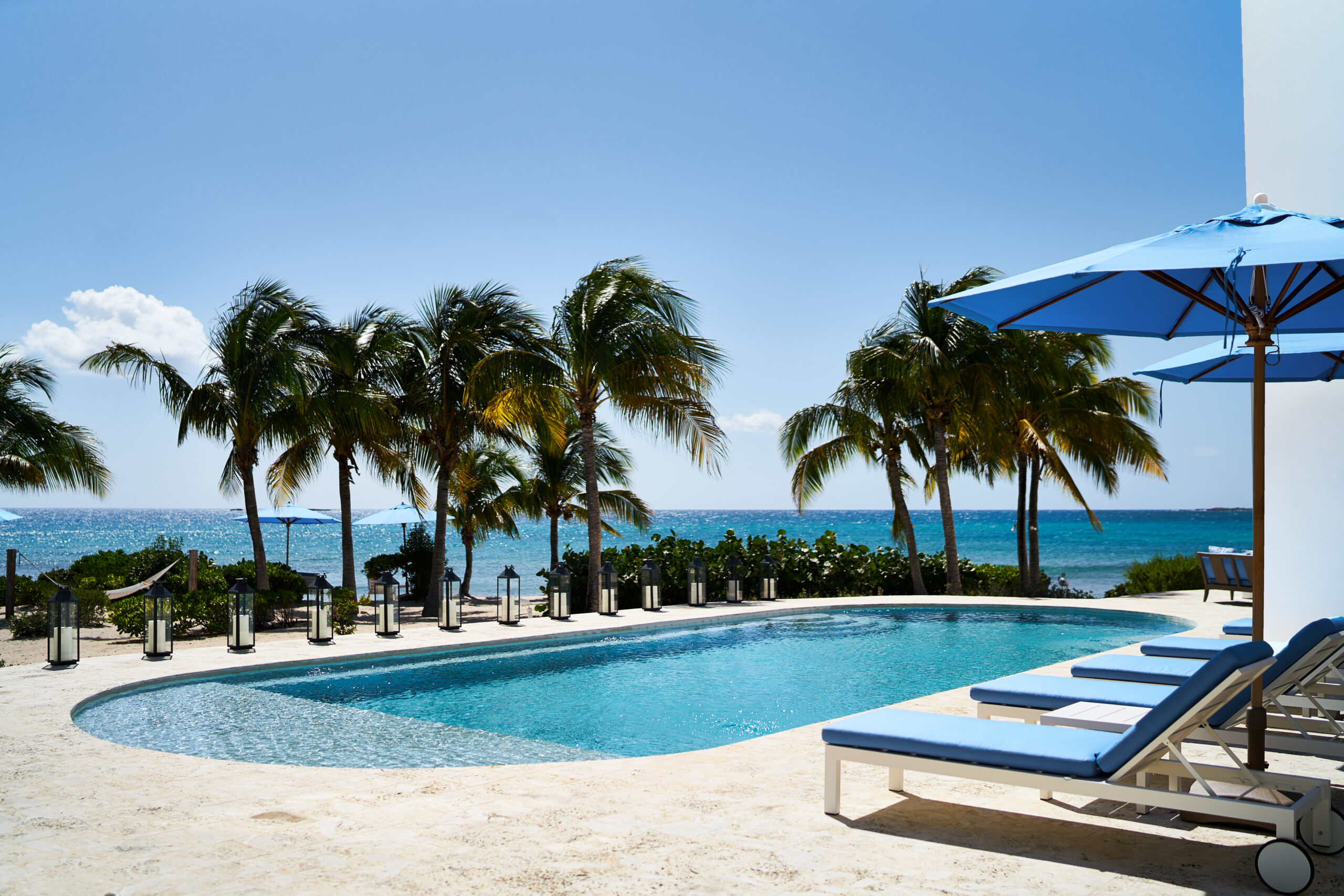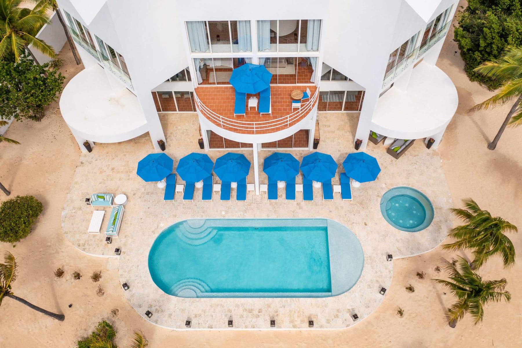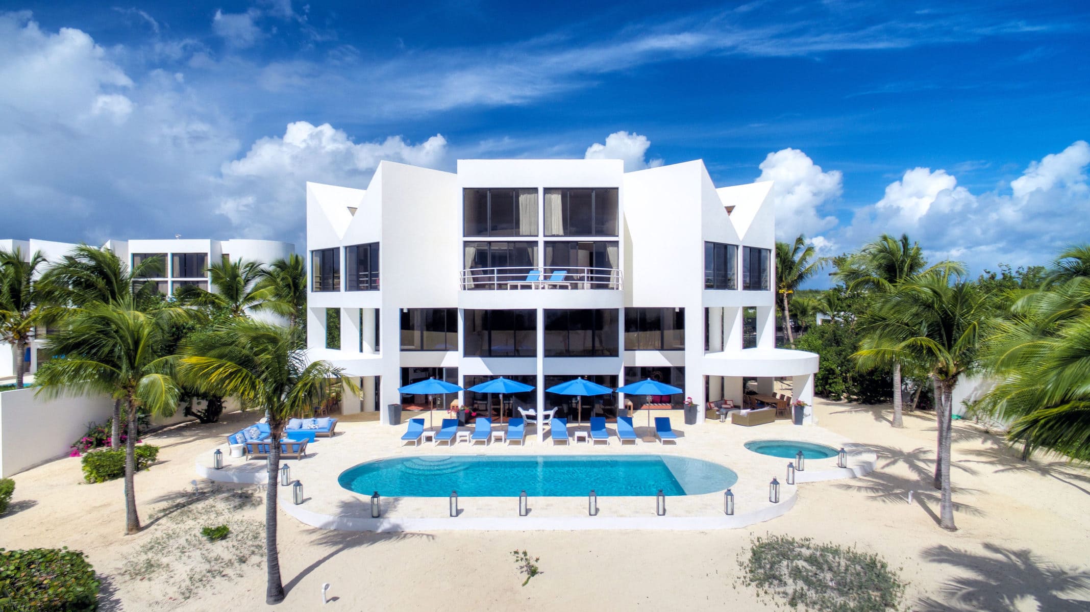 Blue Diamond is a 13,000 sq. ft. villa with modern interiors, spacious floor plans, five full bedrooms plus an additional room with a day bed, a swimming pool, and a heated jacuzzi for up to twelve people. The Villa underwent a full reconstruction, renovation, and interior redesign in the Winter of 2021. It is sold as a fully furnished villa and is available for purchase with the following features: