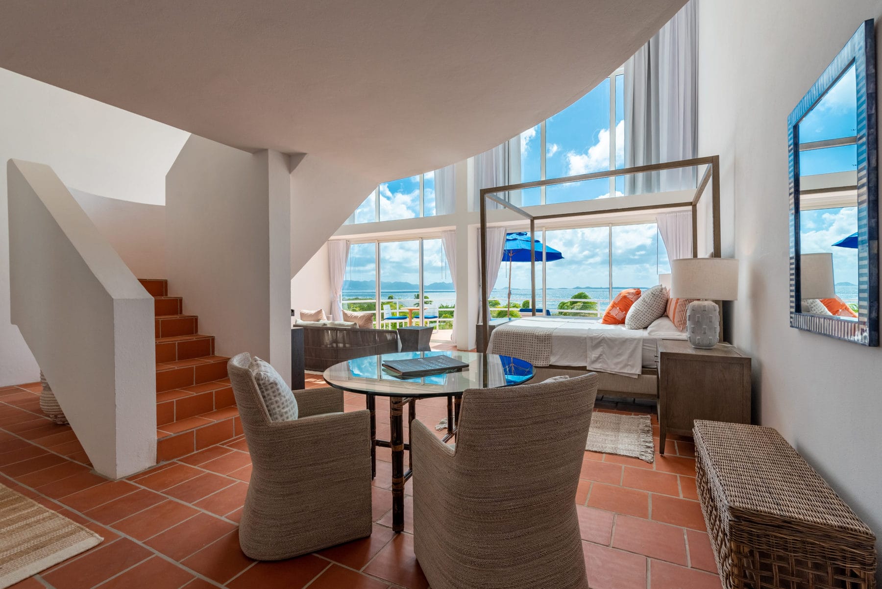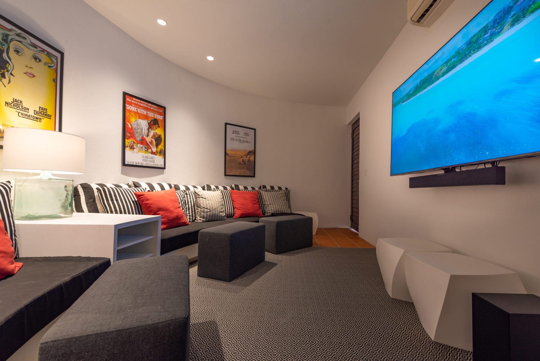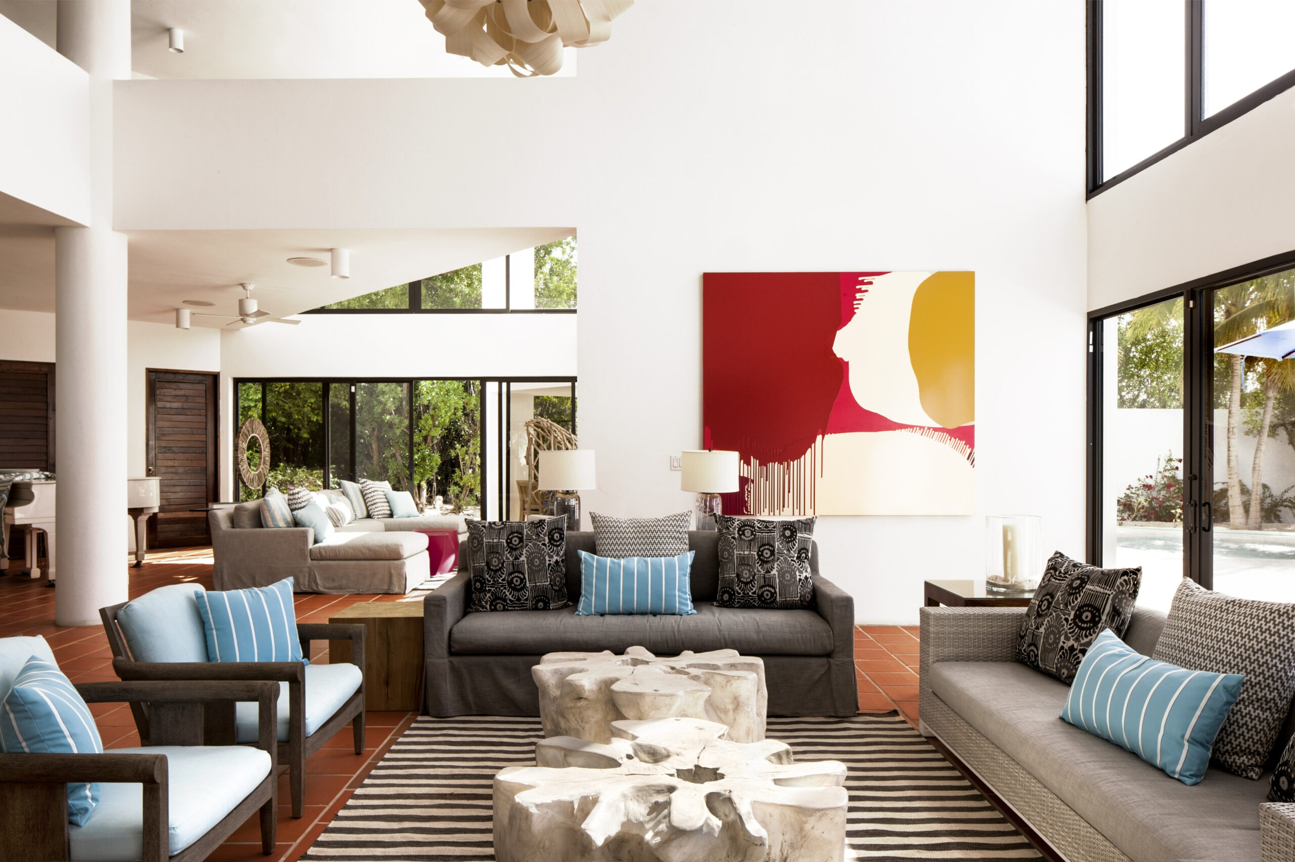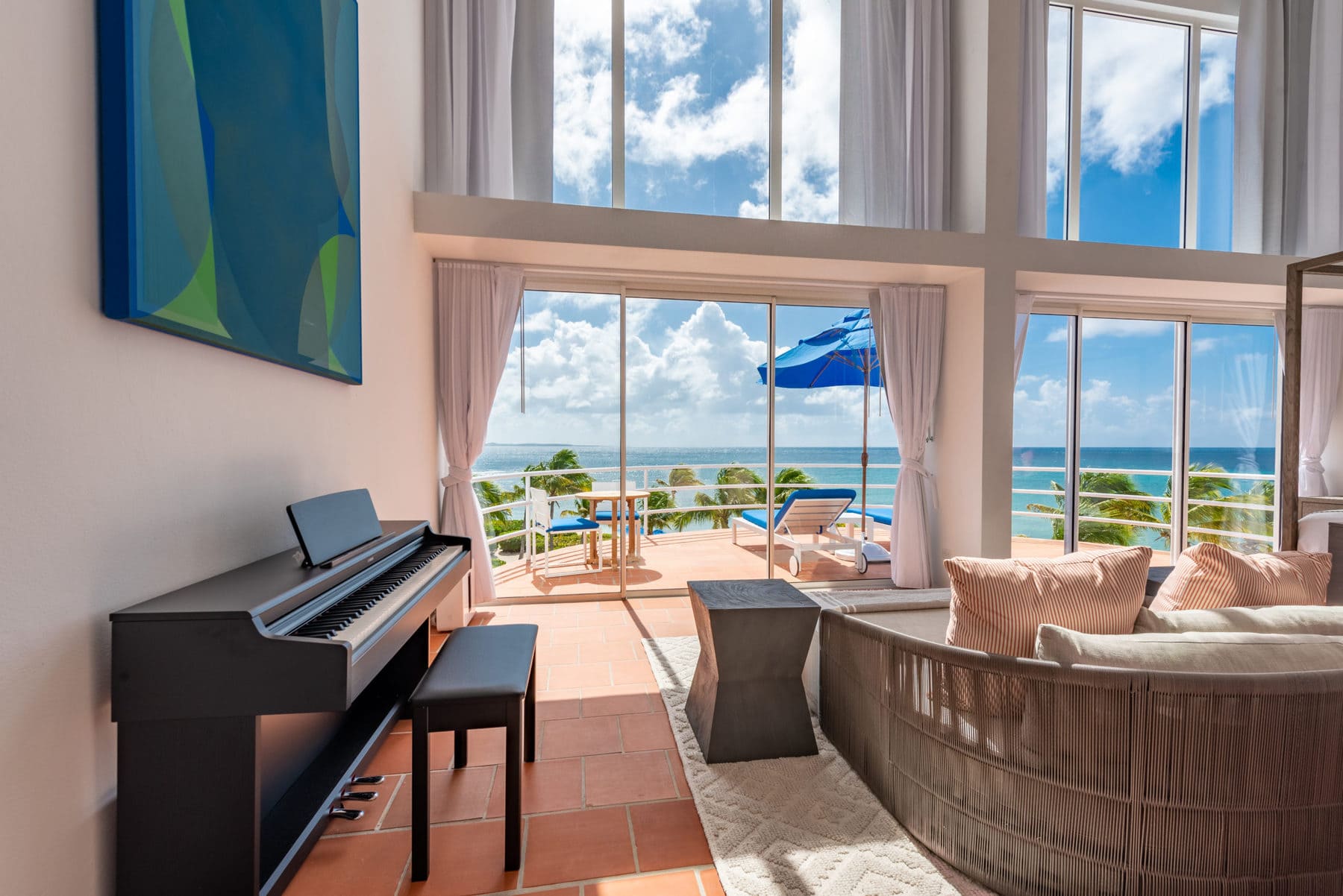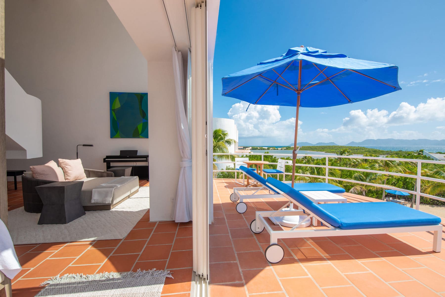 Blue Diamond is a 13,000 sq. ft. villa with modern interiors, spacious floor plans, five full bedrooms plus an additional room with a day bed, a swimming pool, and a heated jacuzzi for up to twelve people. The Villa underwent a full reconstruction, renovation, and interior redesign in the Winter of 2021. It is sold as a fully furnished villa and is available for purchase with the following features: