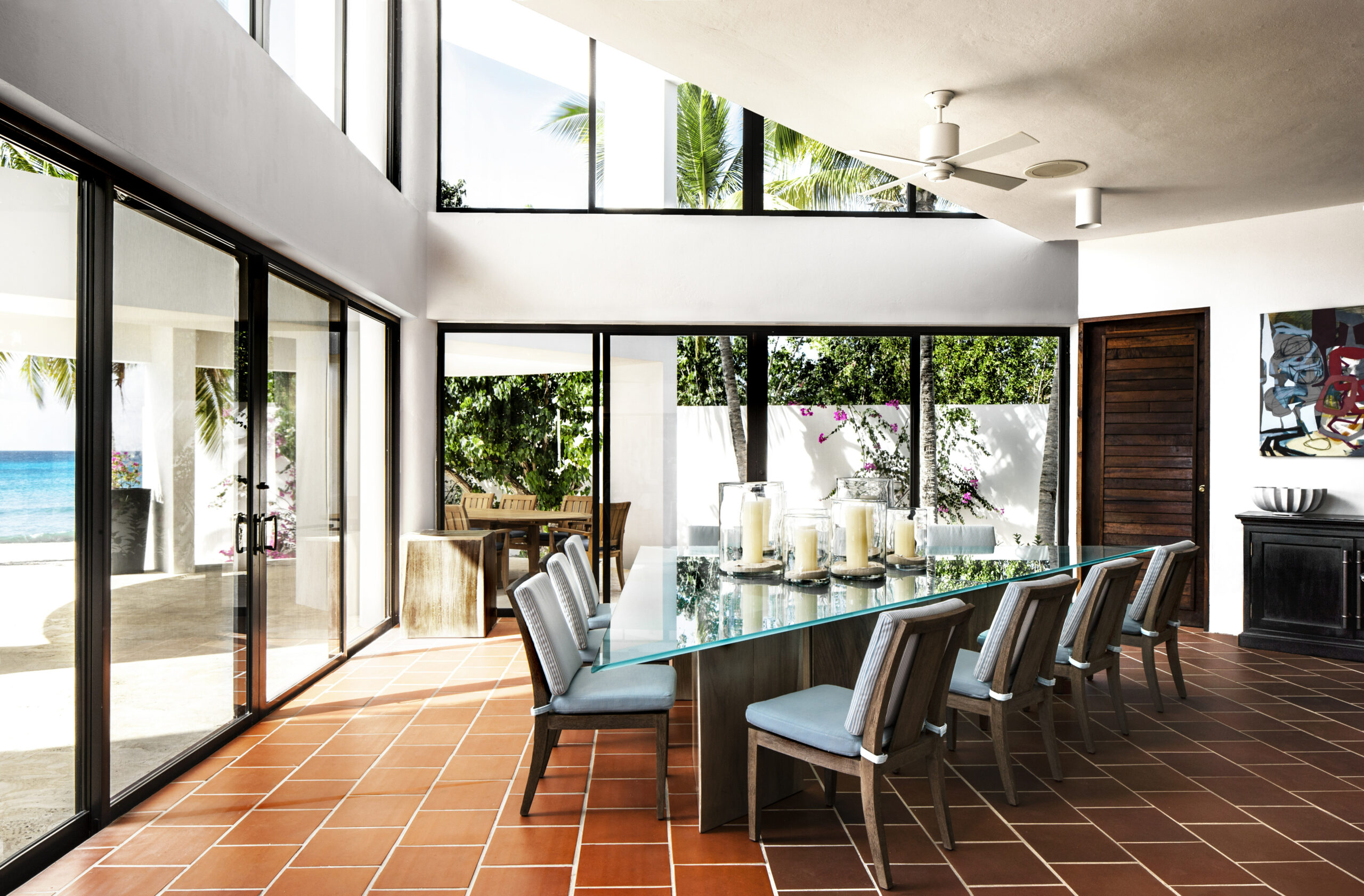 Blue Diamond features a magnificent Grand Room with 21-foot high ceilings and floor-to-ceiling windows in addition to a triangular, glass-topped table in the formal dining room that can seat up to fourteen people. A custom-built semicircle bar that includes a cooktop and refrigerator leads into the gourmet kitchen, and private powder rooms lie in the surrounding alcoves. On the second floor, there is a fully-stocked entertainment room with a custom-made pool table, two card tables, a ping pong table and an ocean view.