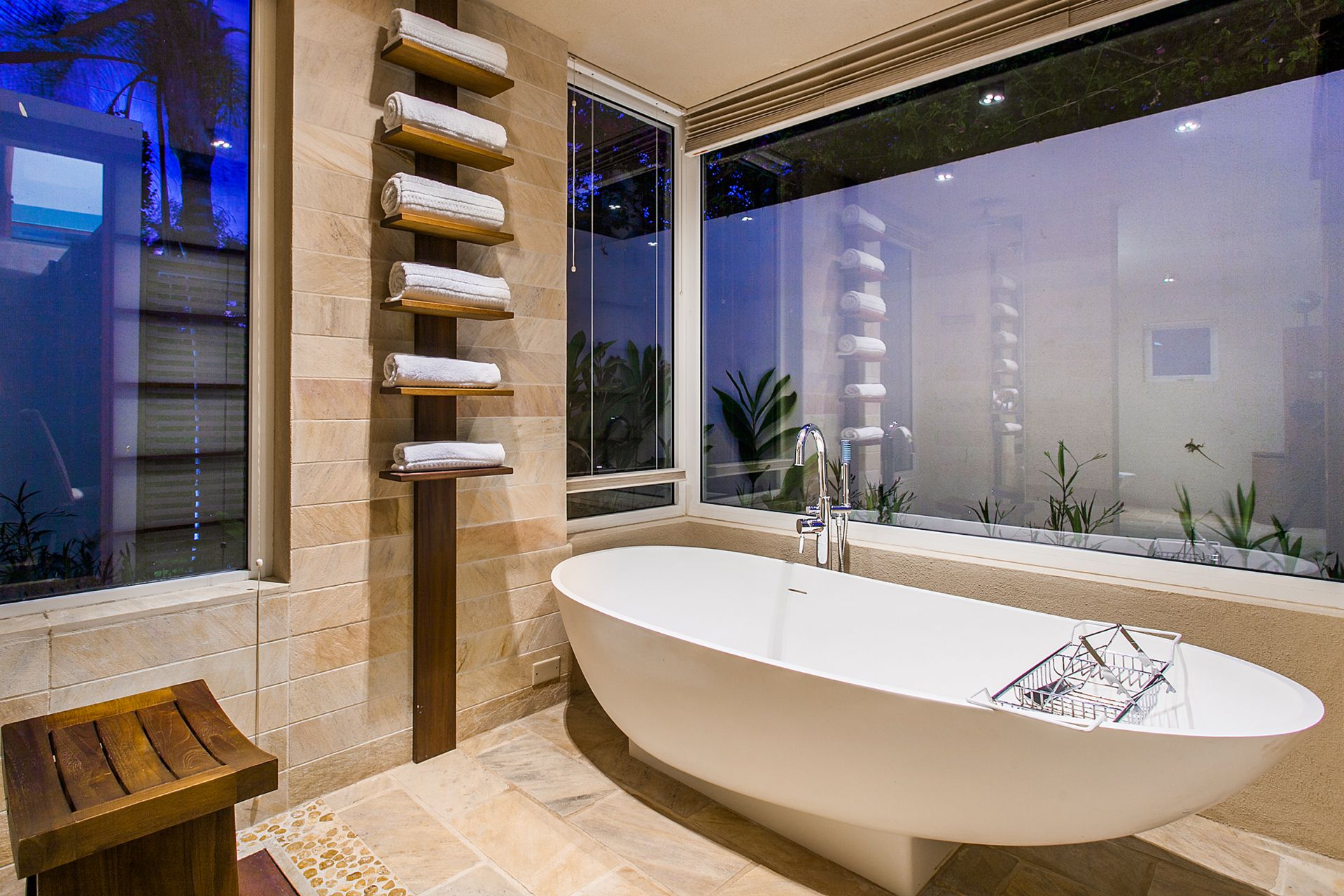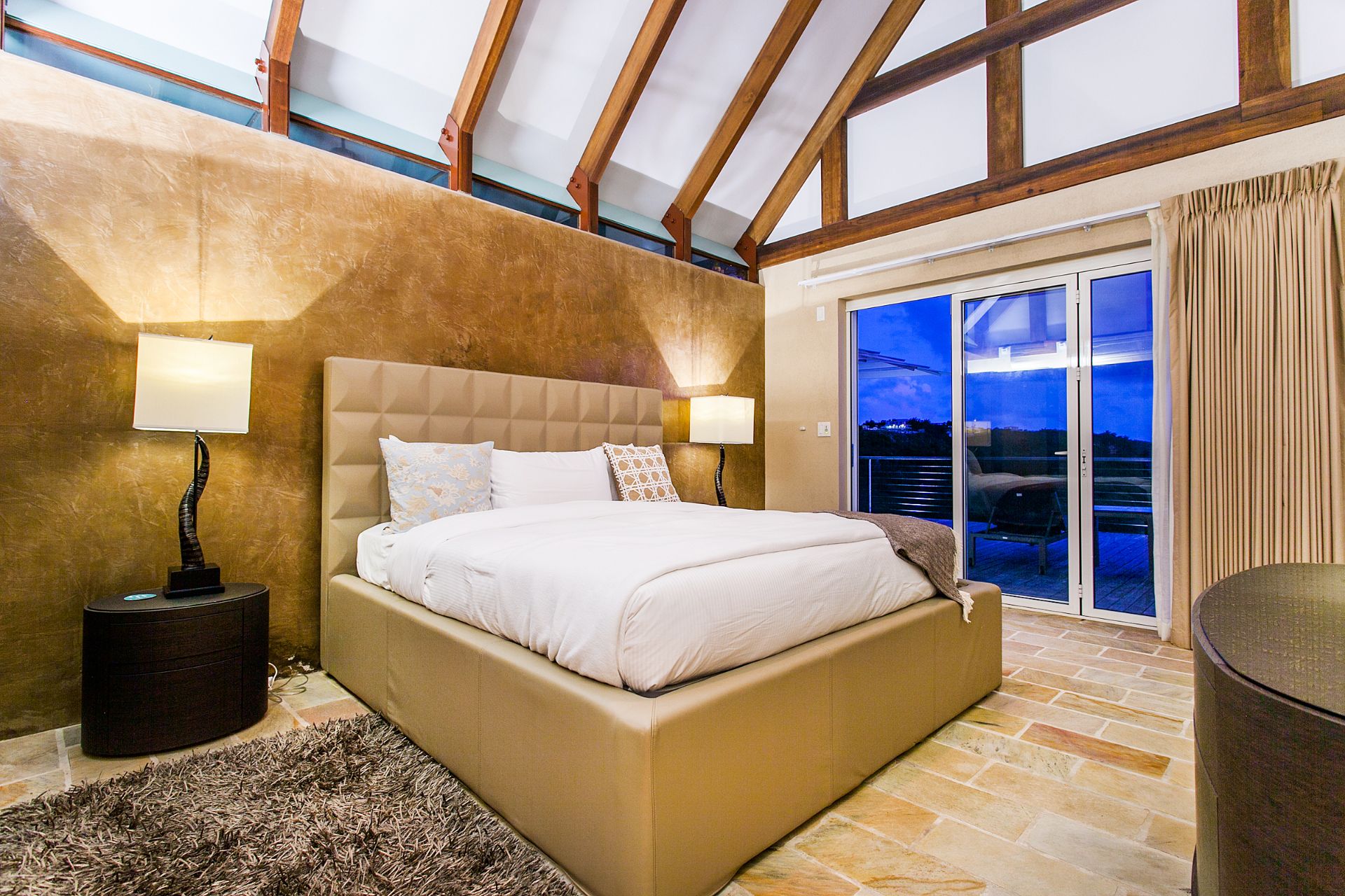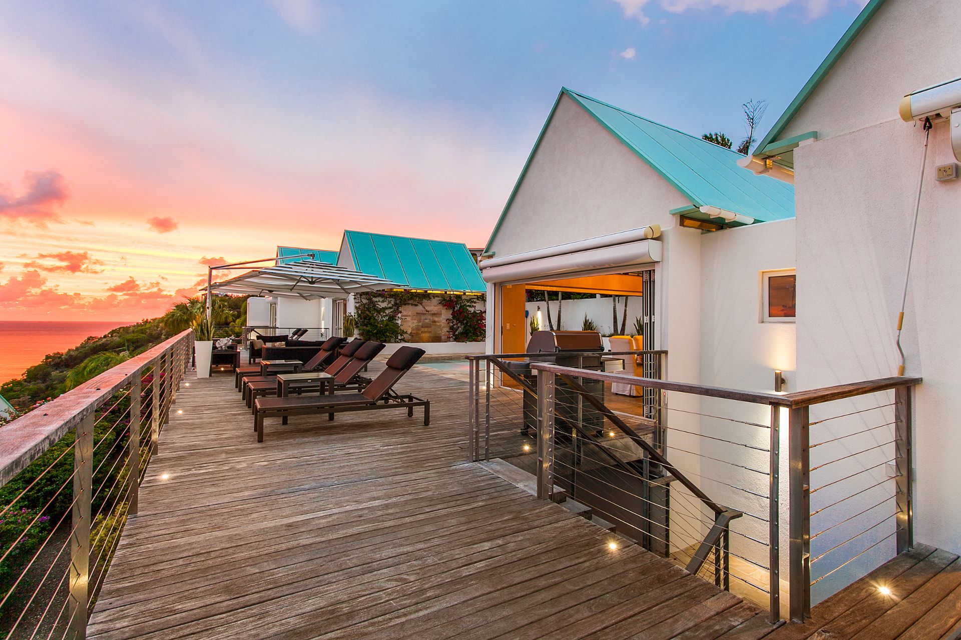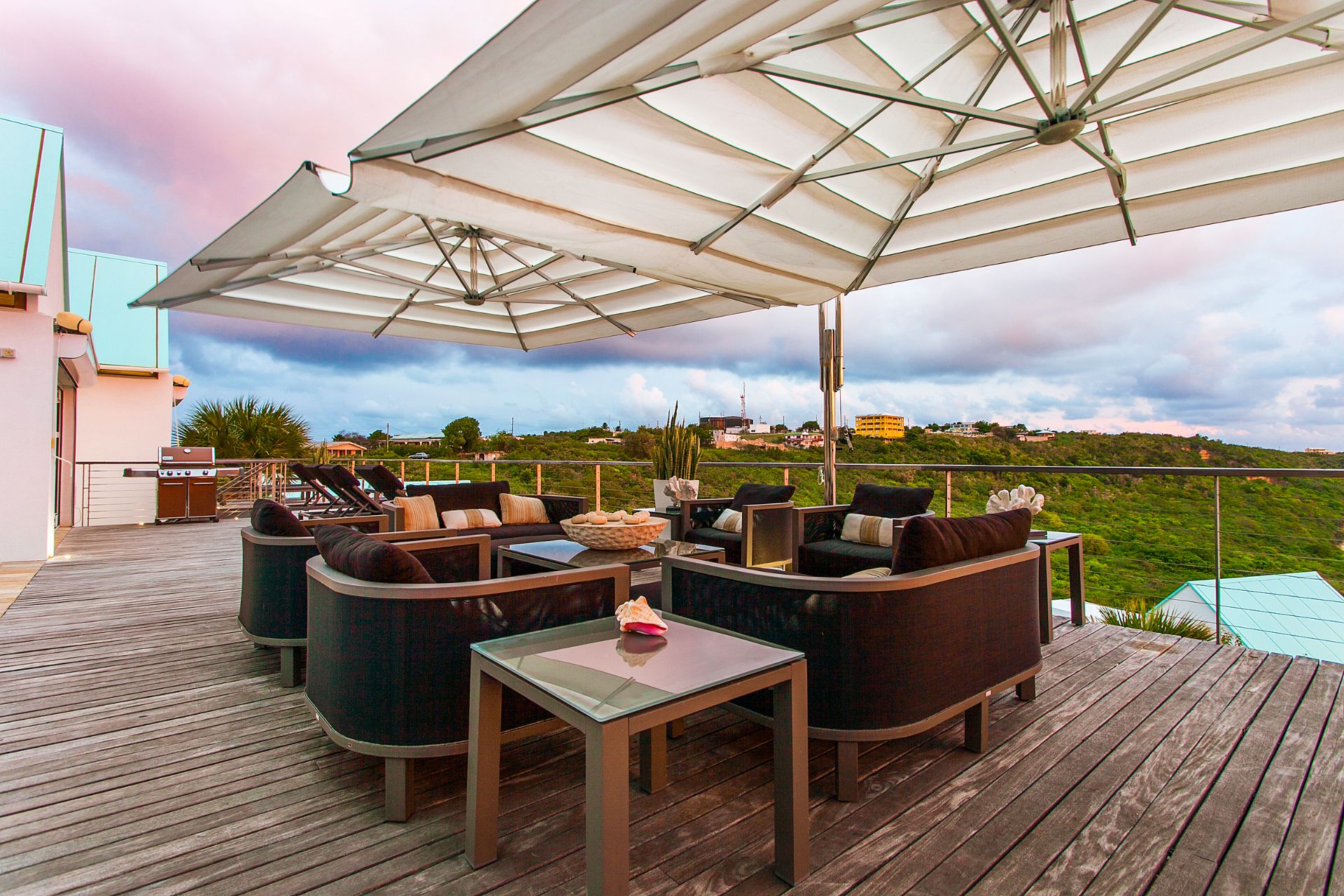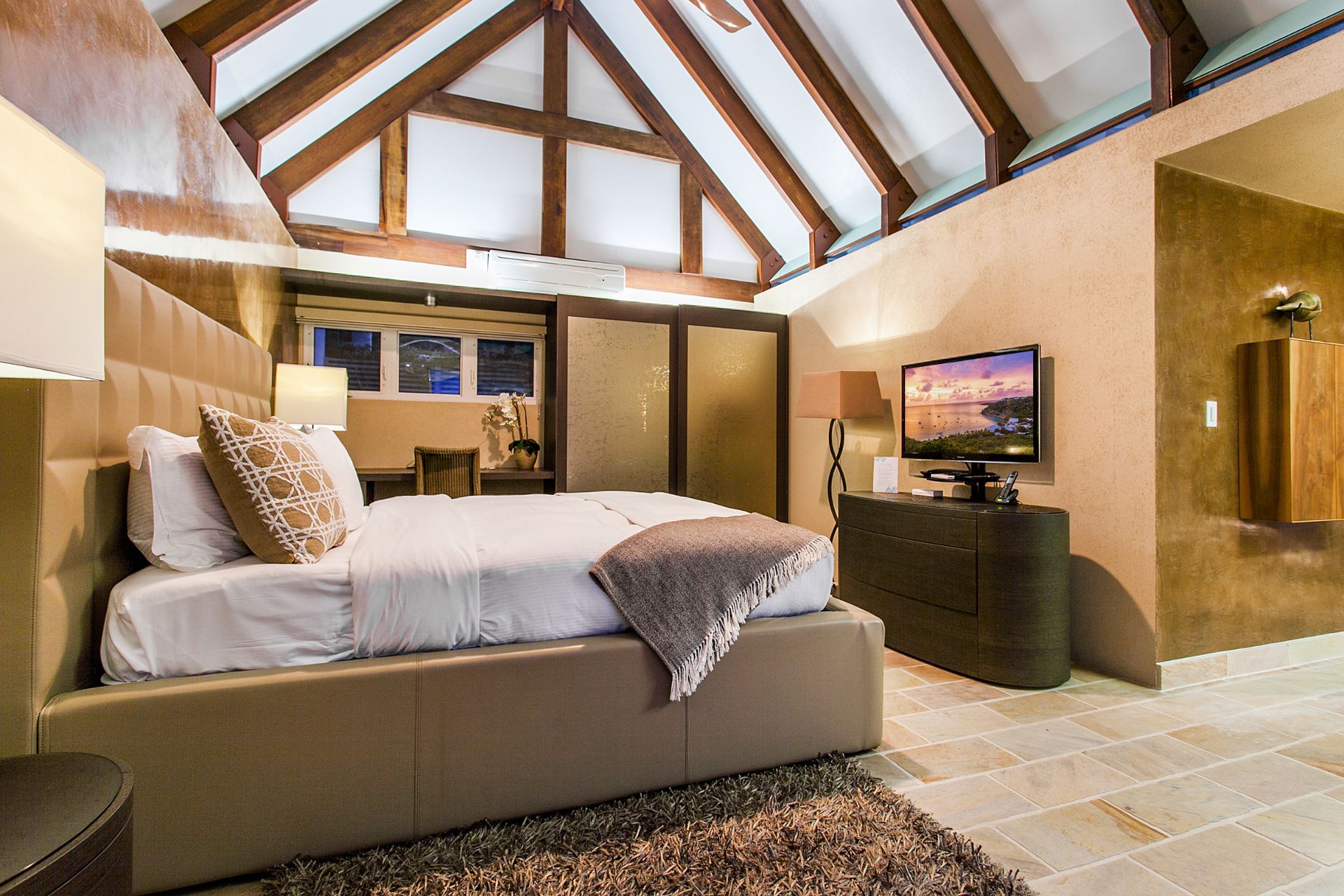 Each villa features 5 ensuite bedrooms, each with spacious and well-appointed bathrooms. The premier suites go a step further by offering a luxurious bathtub. The design emphasizes comfort and luxury, with a large open living area and pool deck, a separate kitchen/dining building, and breathtaking views of the bay. The lower level, where two of the bedrooms are situated, includes an additional deck, a media room, and a convenient washer and dryer room.