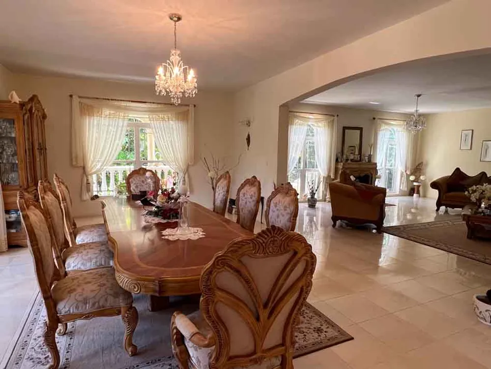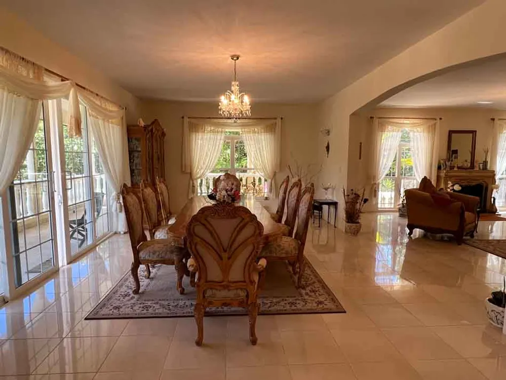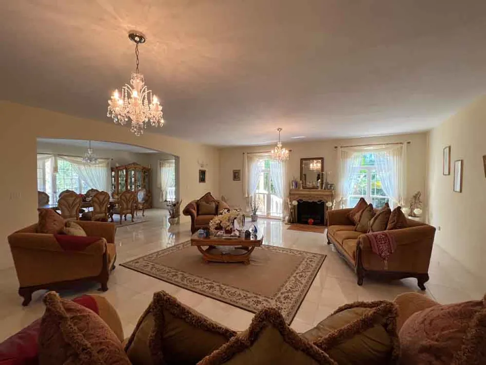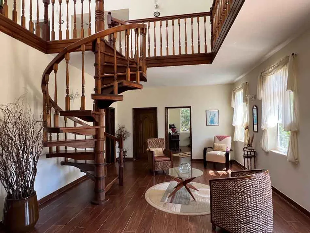The impressive grand entrance opens onto a large foyer area with a wooden spiral staircase as an option to get to the second floor. On ground level to the right is the generous sized office and full bathroom and a door that leads into the spectacular living space complete with fireplace and ajoining formal dining room all with quality furnishings imported from Miami. There are porches off almost every room so plenty of outdoor space to sit. As you circle around the ground level you see the more formal staircase leading up to the bedrooms. There is also a media room/casual living area along with a bonus room that can be used as a gym or a playroom for children. A powder room is also available in this area that then leads to the gourmet kitchen with quality appliances and a second spacious but more casual dining space.