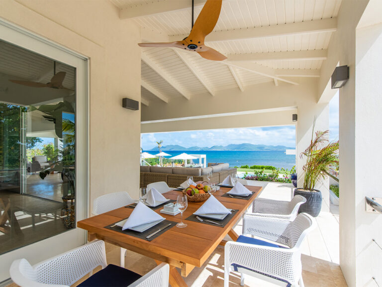 Sit by the private pool under pristine white umbrellas and gaze at the cool Caribbean Sea against the enchanting views of neighboring St. Martin. Everything you might desire is poolside — covered seating and dining, a heated pool, poolside bar with ice maker and fridge, BBQ grill, ample lounges and a large terrace. The elevated veranda is outfitted with cushioned furnishings, ceiling fans, and mood lighting for any time of day. A changing room and restroom are available off the pool deck.