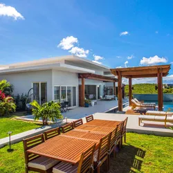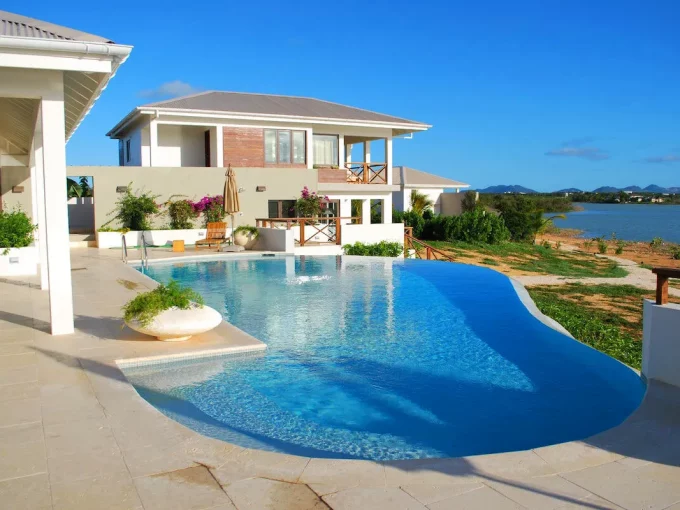 Hughes’ Hideaway’s grandeur belies its warm and intimate feeling. While being one of the largest and most imposing villas on Anguilla, with plenty of room to spread out and relax, Hughes Hacienda offers many secluded spots for quiet reflection and peaceful meditation. An impressive gated entrance and lush tropical gardens welcome guests to paradise. A carriage drive and tiled walkways lead to the protected national marine park at the property’s edge. Resplendent in hues of the Caribbean, Ultimacy Villa is tastefully decorated in cool tropical style, and provides a staggering 20,000 square feet of indoor and outdoor living space for guests to enjoy. The villa boasts 9 bedrooms, 3 kitchens, 11 bathrooms, 3 living rooms, a large recreation room, a fitness room, a formal dining room, 3 al fresco dining alcoves, 3 outdoor lounge areas and a magnificent pool pavilion.