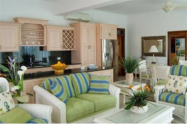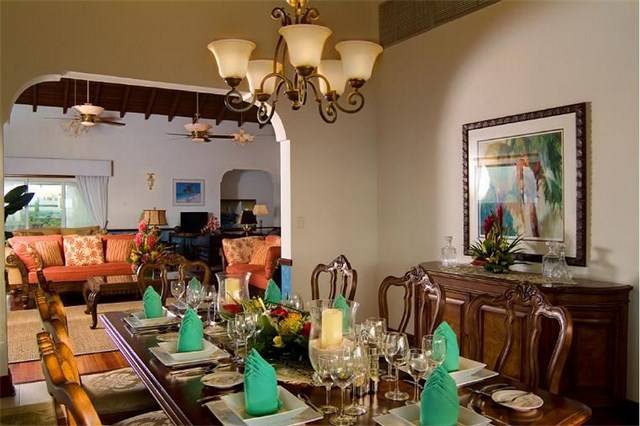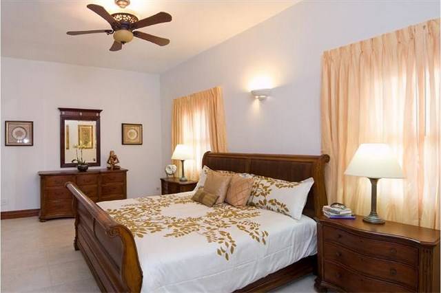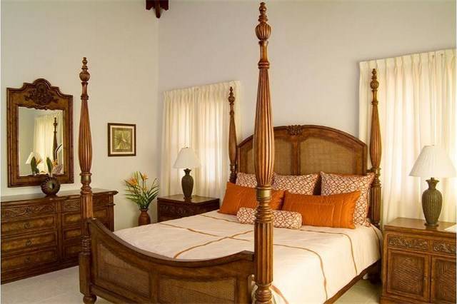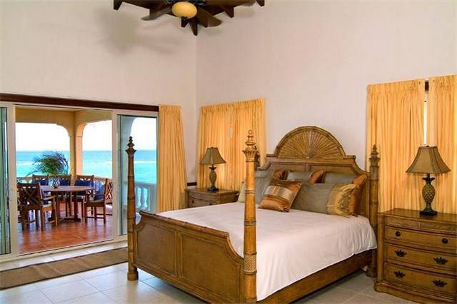 The great room offers a gracious and inviting place to entertain visitors and friends. Plush, oversized furniture presents luxurious comfort in various seating arrangements that allow for friendly and lively conversation between friends and family or a place for quiet solitude with a good book. Two spacious master suites with en-suite bathrooms are located off of the great room. Both air-conditioned rooms feature fine wood furniture, a king size four poster bed and a beamed wooden ceiling with fan to create a luxury ambiance.