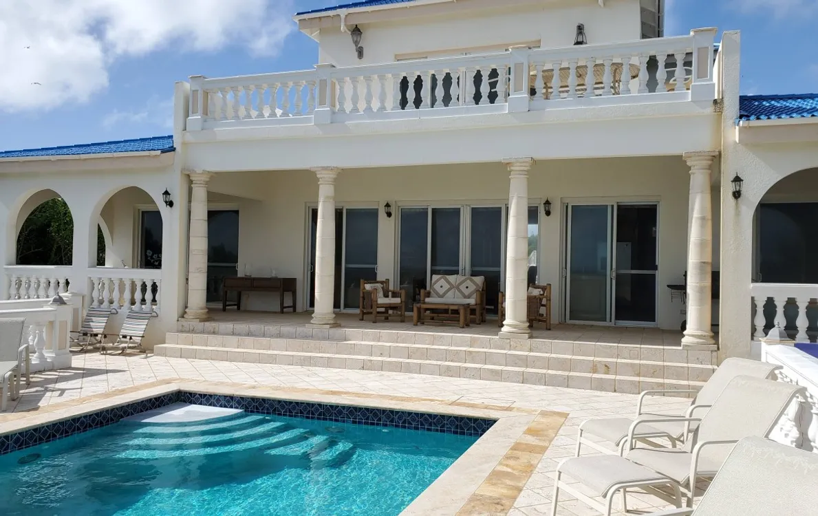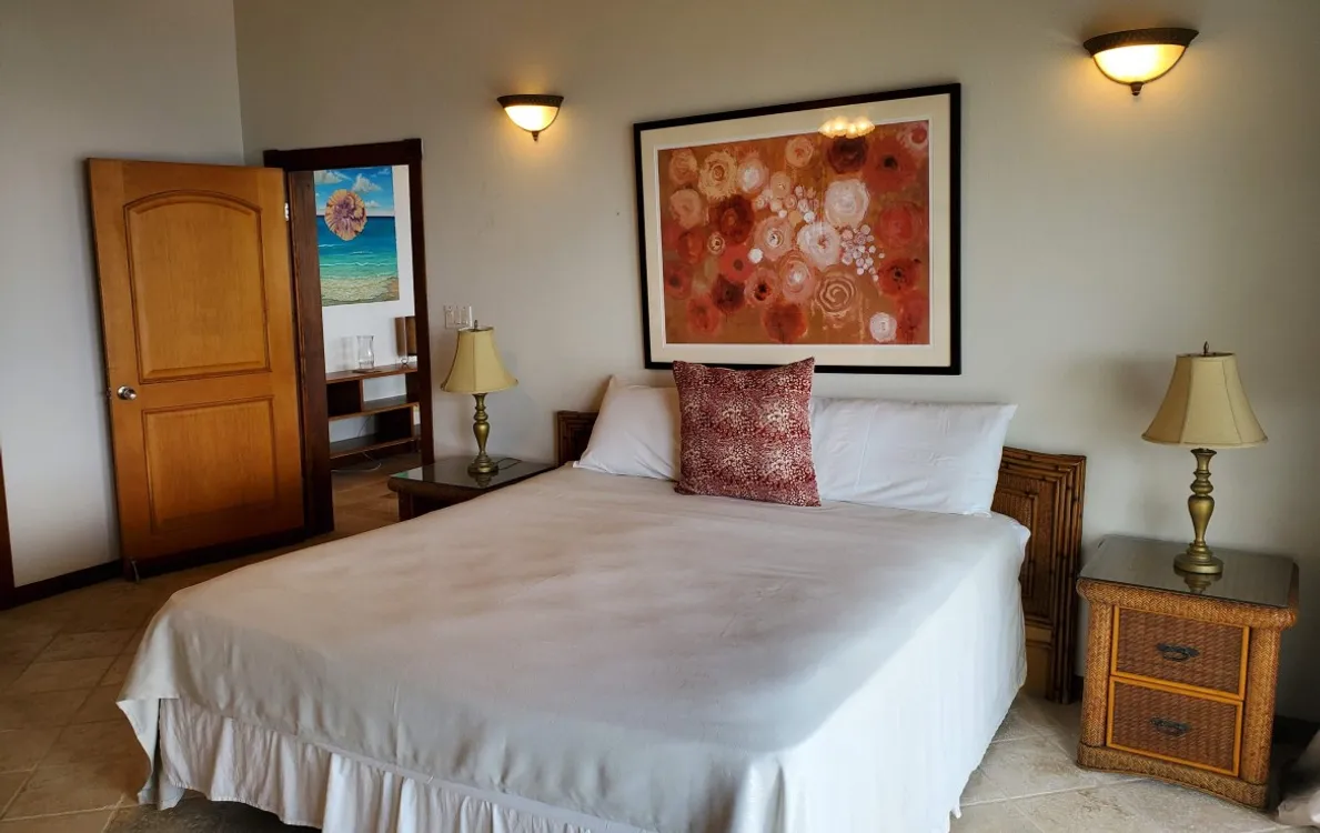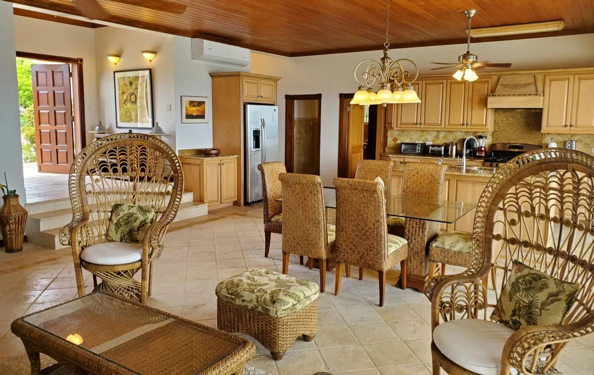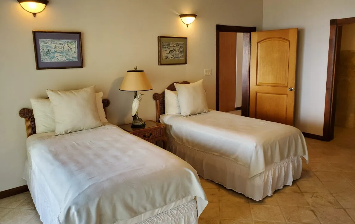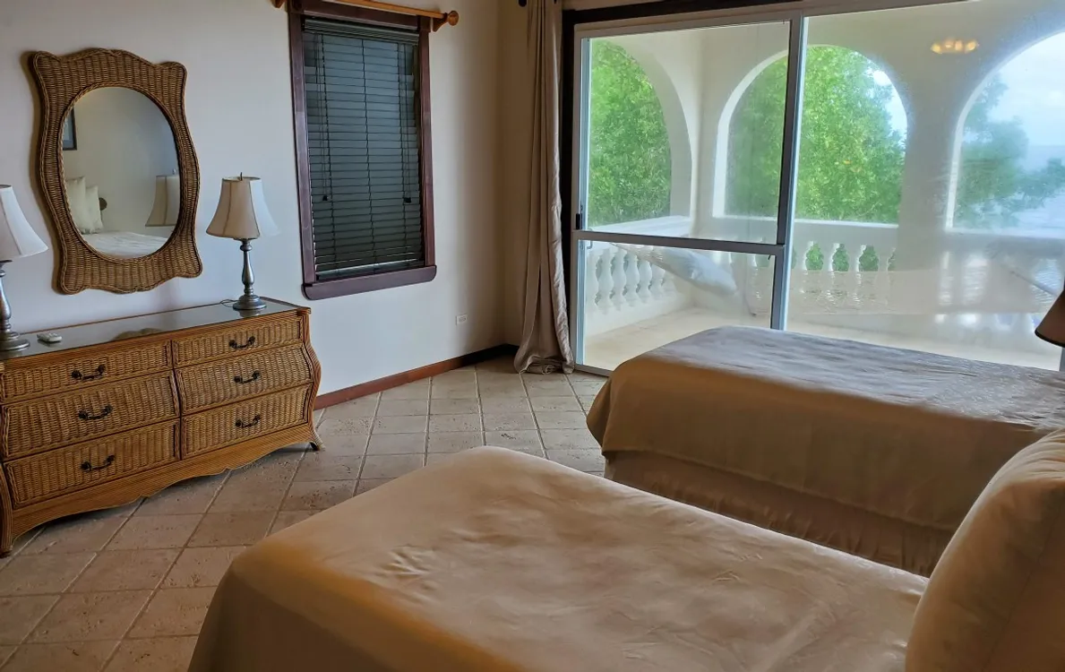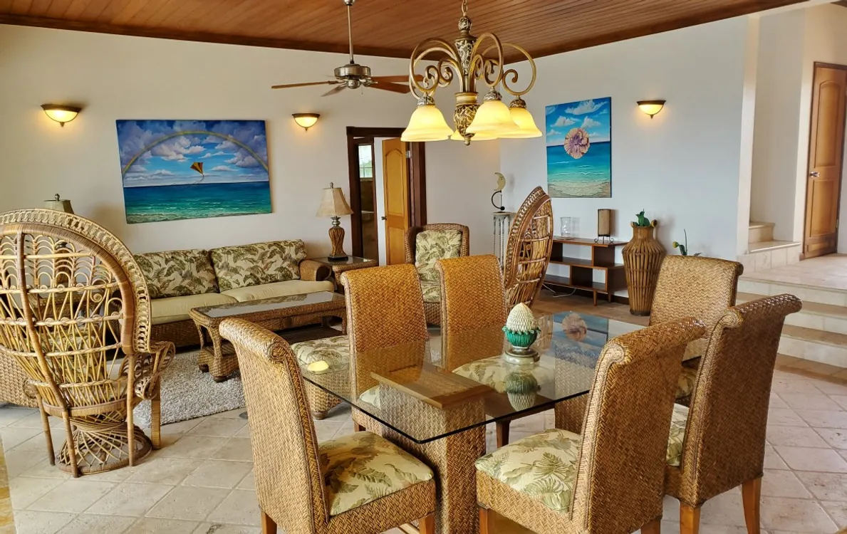 A gracious two story home with 3 bedrooms with ensuite bathrooms: the lower level is comprised of two bedrooms on either side of an open plan “kitchen / dining room / living room” arrangement with the master penthouse bedroom on the upper level. All rooms face onto the Caribbean sea and overlook the fresh water pool that extends beyond the covered patio. All rooms are fully screened and air conditioned and graciously decorated in a Caribbean motif