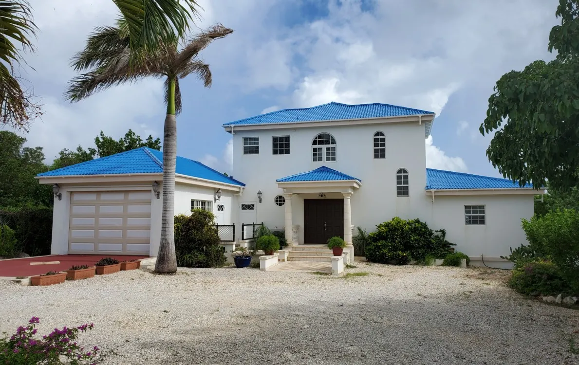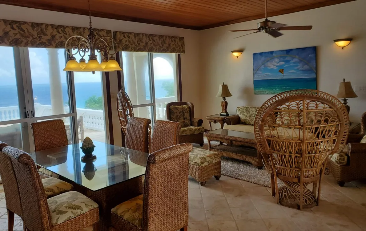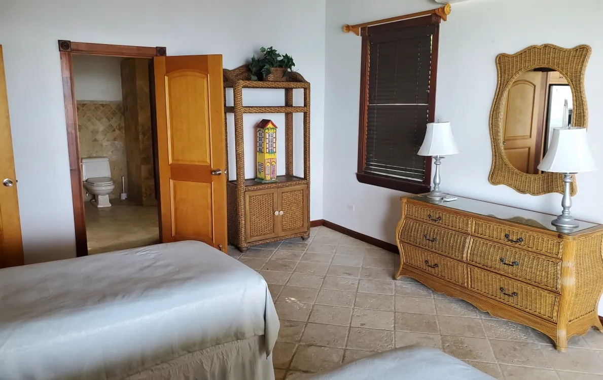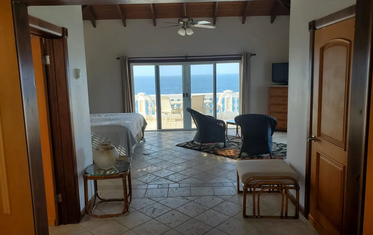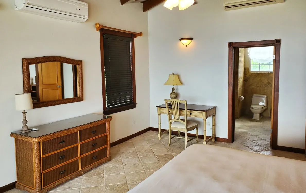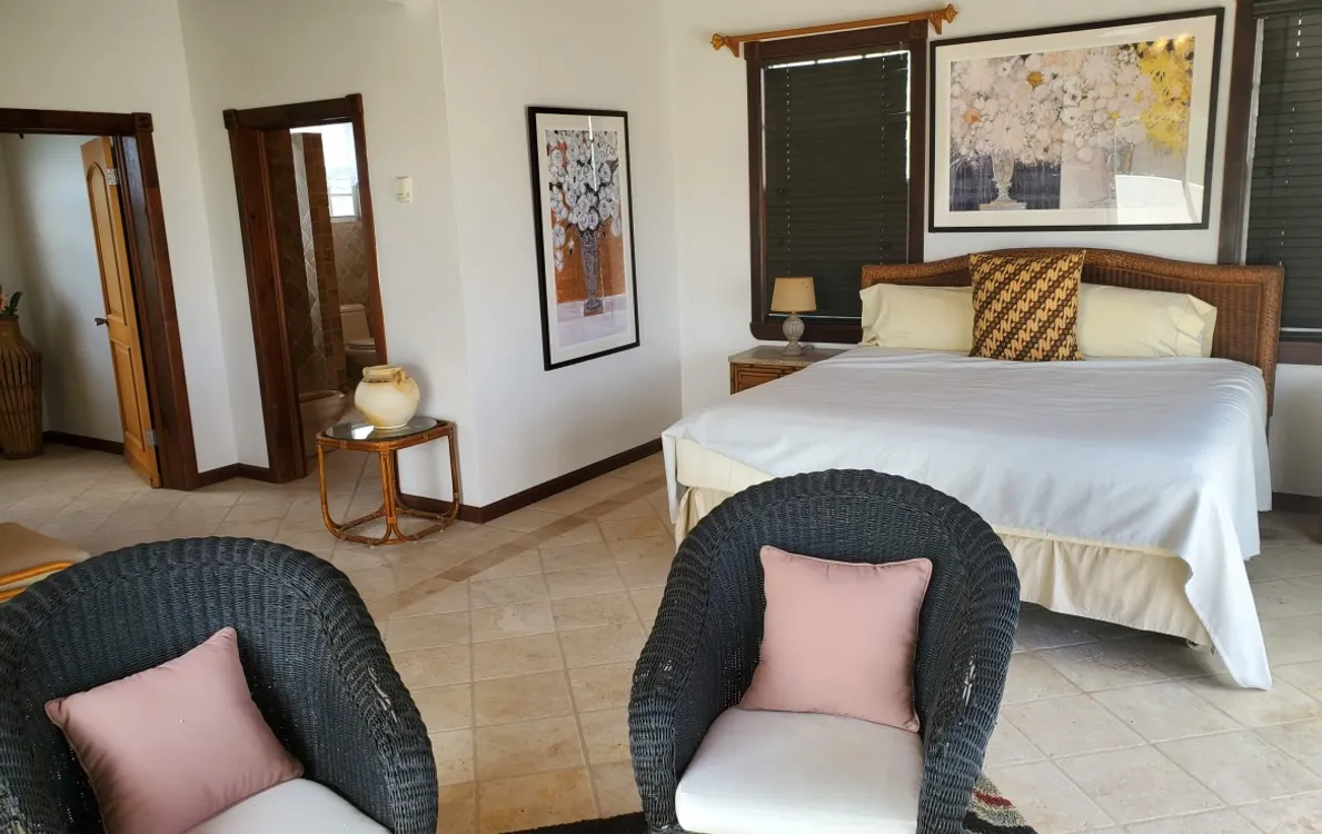 A gracious two story home with 3 bedrooms with ensuite bathrooms: the lower level is comprised of two bedrooms on either side of an open plan “kitchen / dining room / living room” arrangement with the master penthouse bedroom on the upper level. All rooms face onto the Caribbean sea and overlook the fresh water pool that extends beyond the covered patio. All rooms are fully screened and air conditioned and graciously decorated in a Caribbean motif