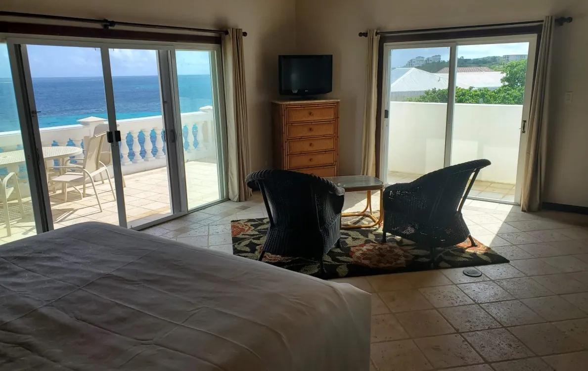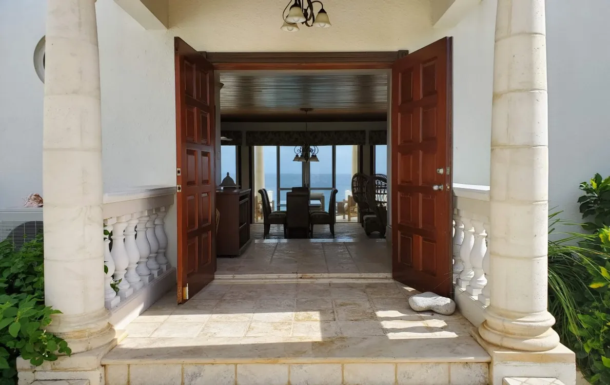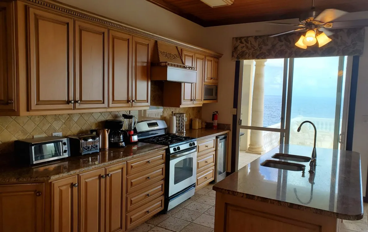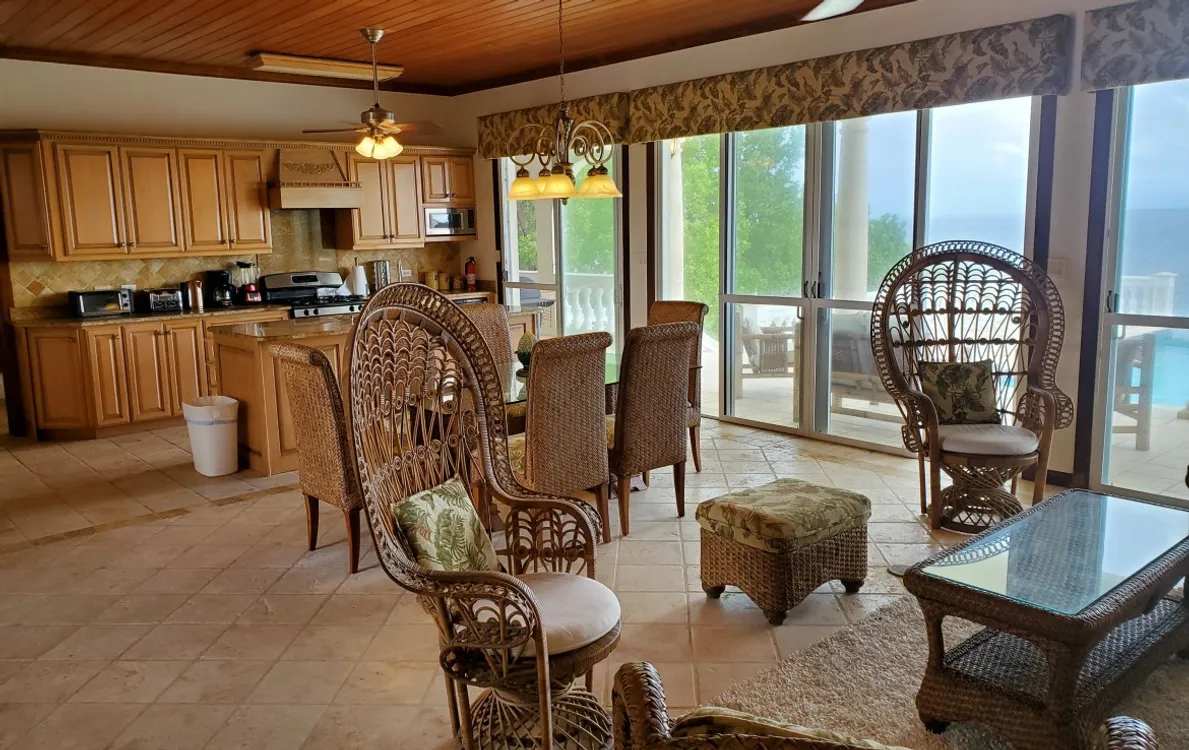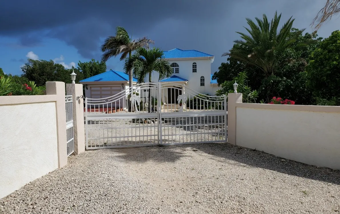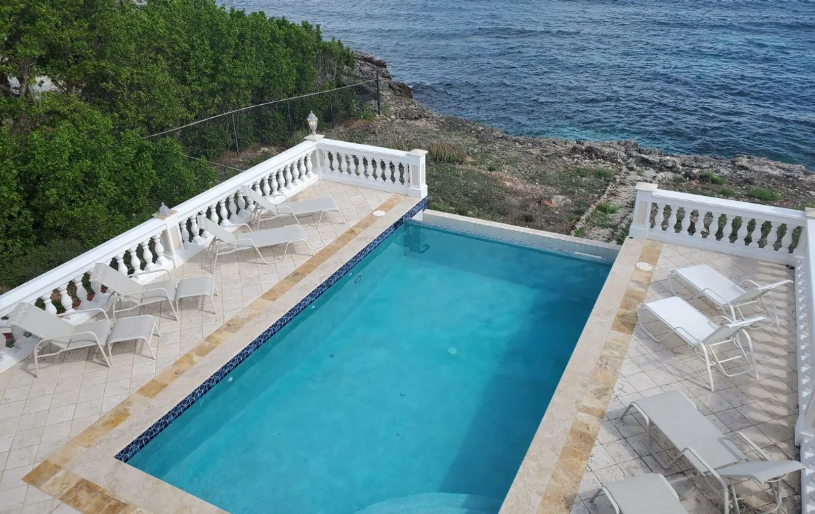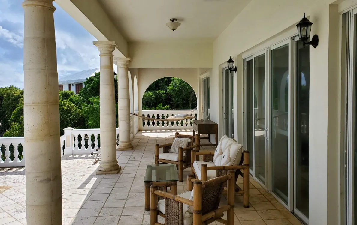 A gracious two story home with 3 bedrooms with ensuite bathrooms: the lower level is comprised of two bedrooms on either side of an open plan “kitchen / dining room / living room” arrangement with the master penthouse bedroom on the upper level. All rooms face onto the Caribbean sea and overlook the fresh water pool that extends beyond the covered patio. All rooms are fully screened and air conditioned and graciously decorated in a Caribbean motif