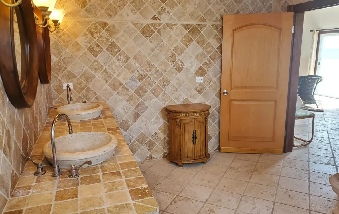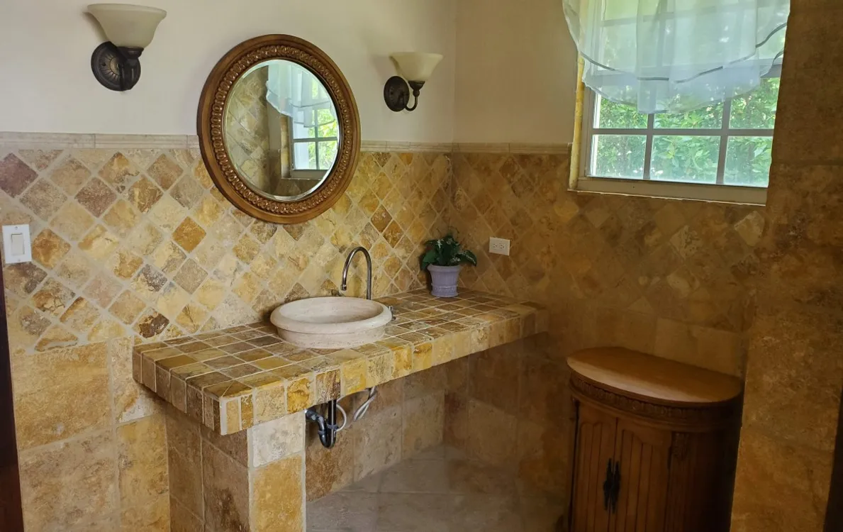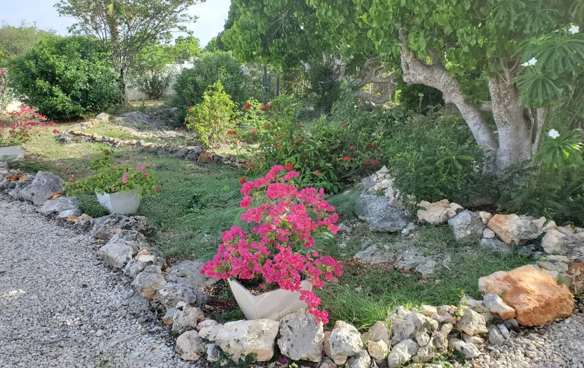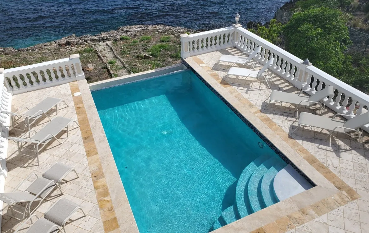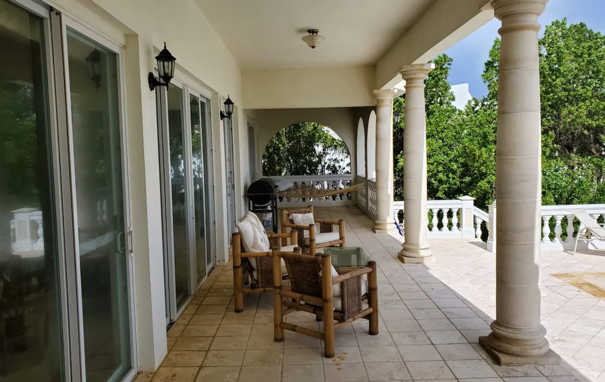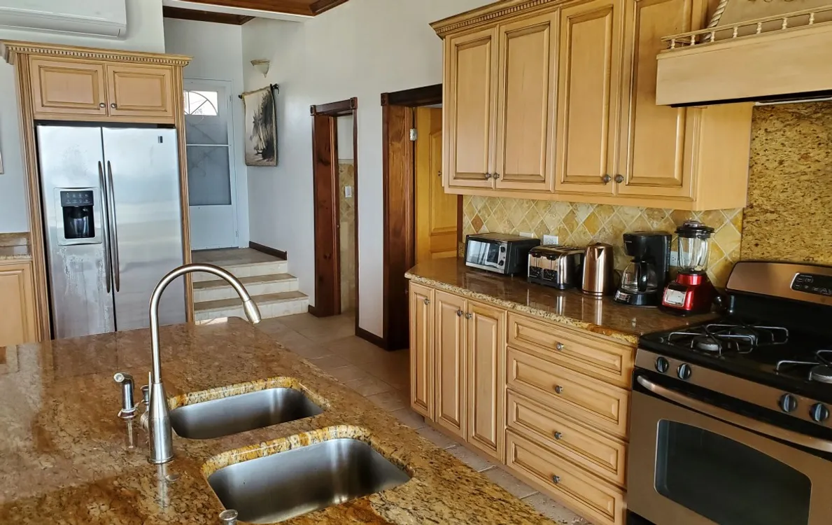 A gracious two story home with 3 bedrooms with ensuite bathrooms: the lower level is comprised of two bedrooms on either side of an open plan “kitchen / dining room / living room” arrangement with the master penthouse bedroom on the upper level. All rooms face onto the Caribbean sea and overlook the fresh water pool that extends beyond the covered patio. All rooms are fully screened and air conditioned and graciously decorated in a Caribbean motif