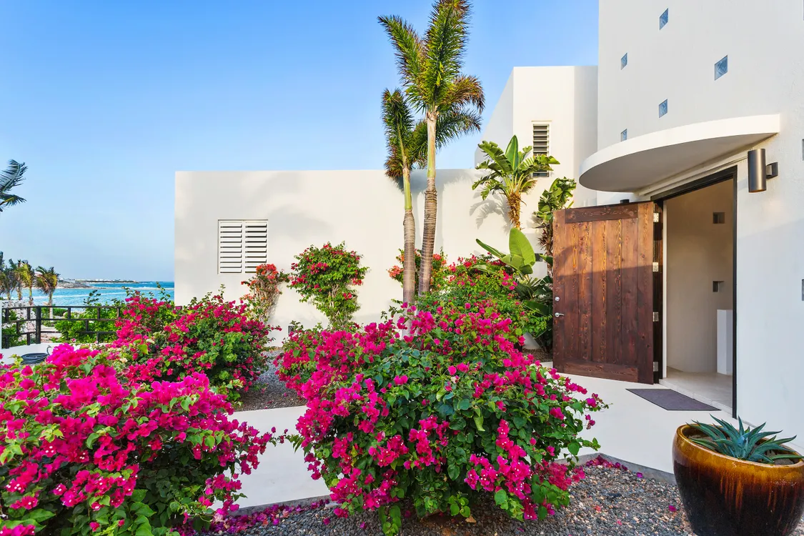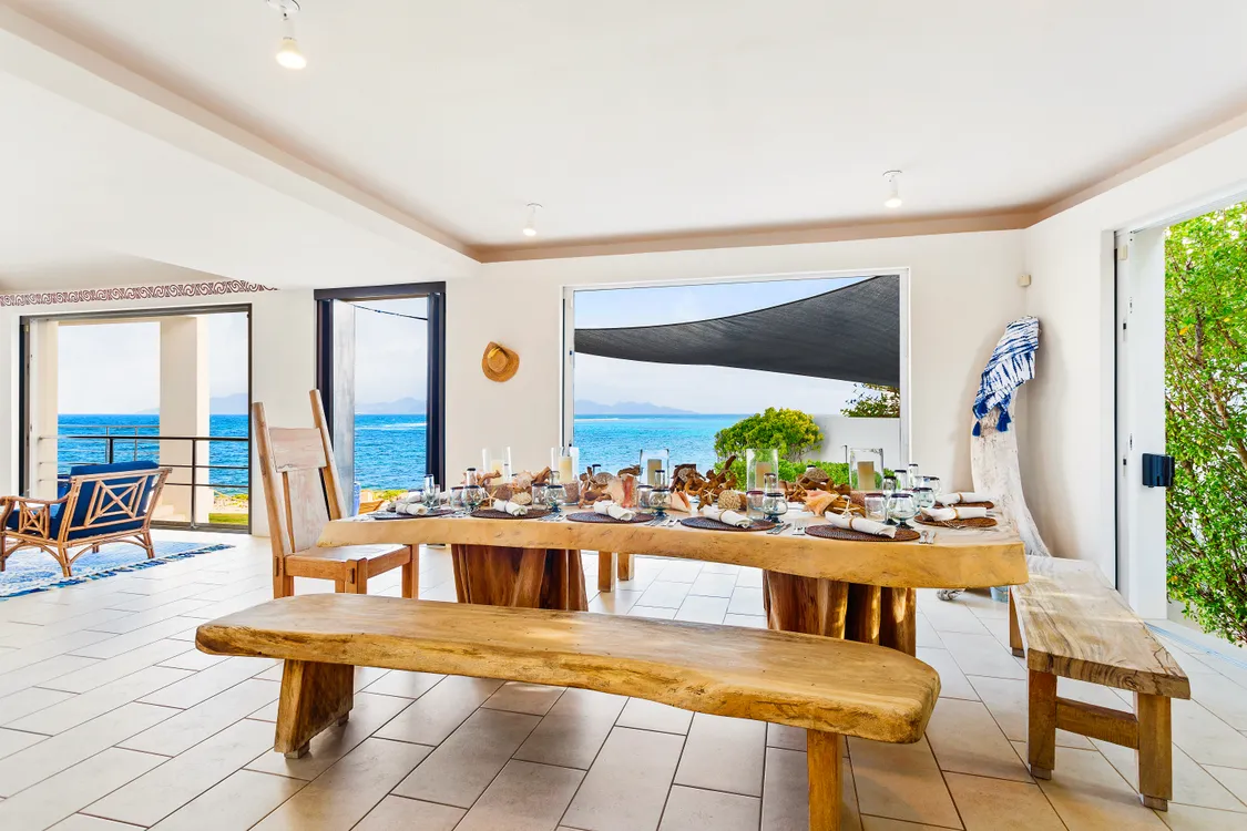 The grand modern entrance, adorned with bougainvillea and lush landscaping, provides an impressive welcome. Designed with clean, stark white lines—a hallmark of high-end Anguilla villas—Limin’ Da Coconut seamlessly integrates with its spectacular surroundings through expansive indoor and outdoor living spaces, vast windows, and a private pool. Large doors can be opened to let the gentle Caribbean breezes flow through.