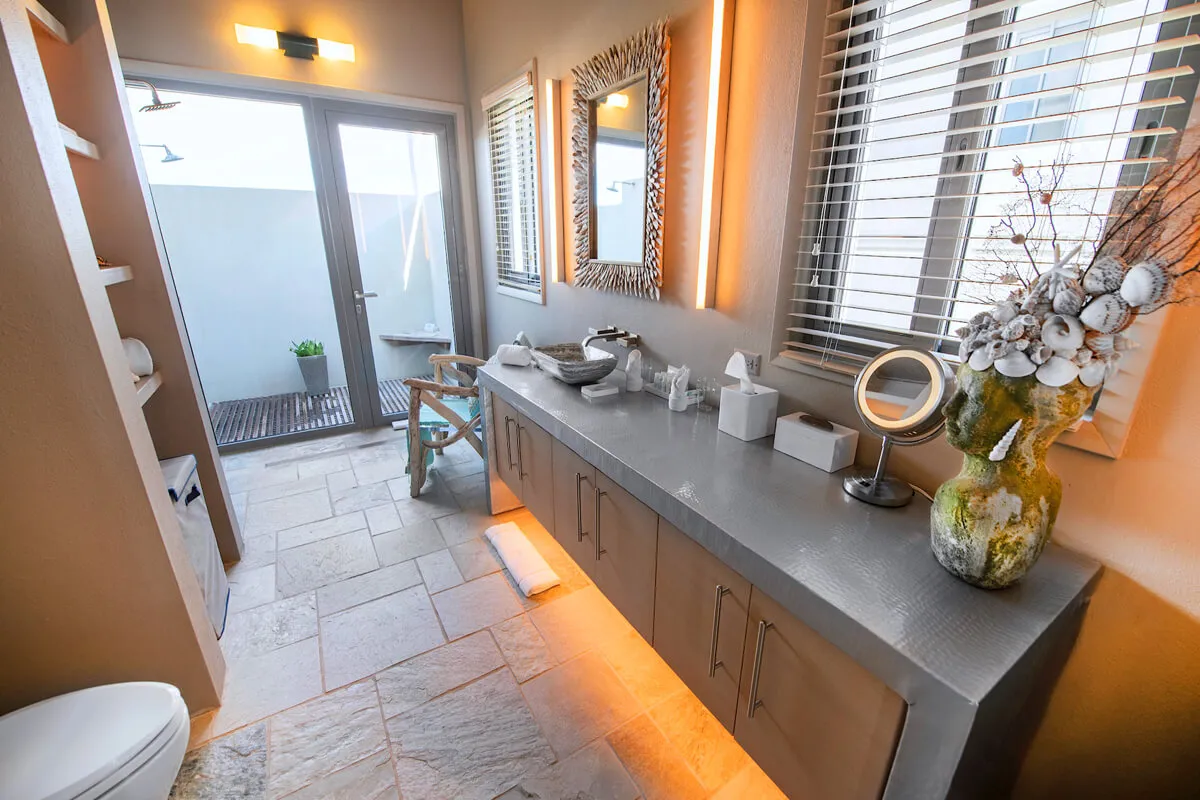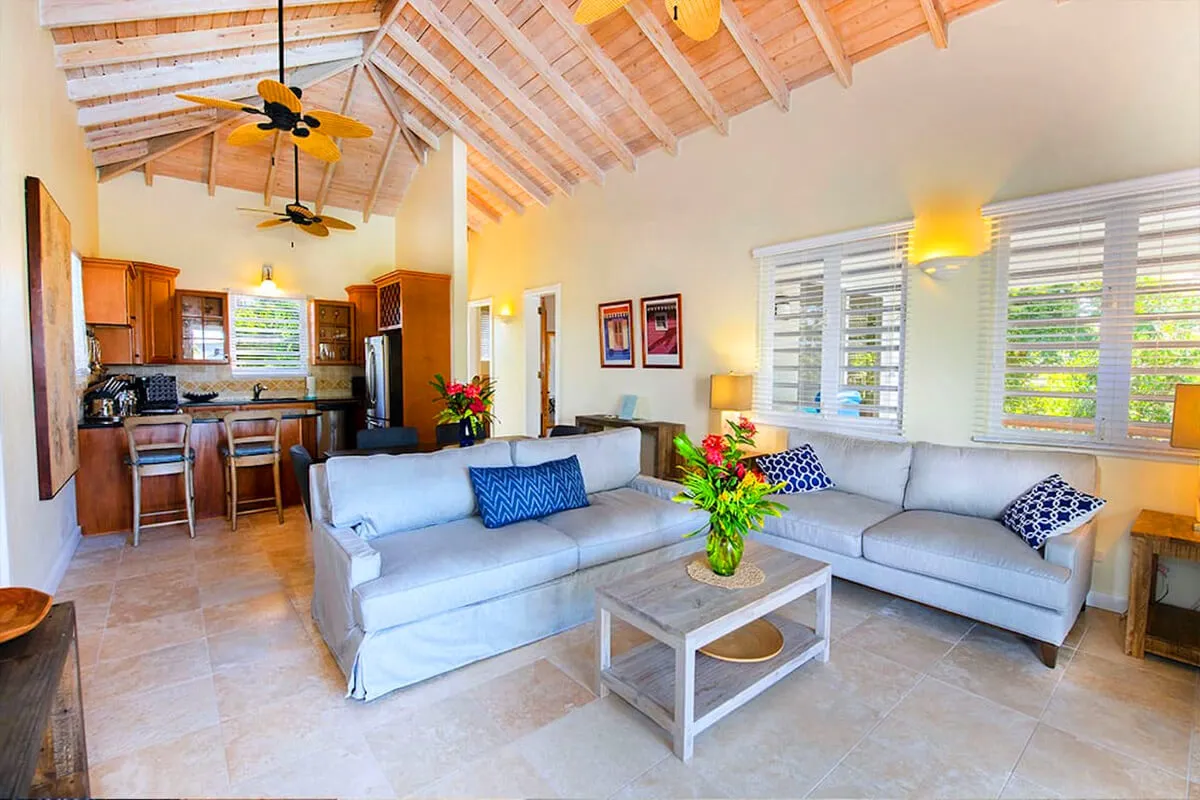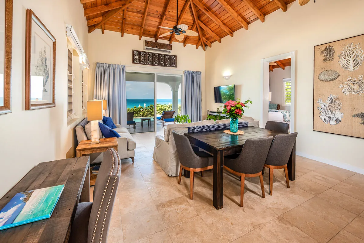 This villa has direct access to a stunning beach and turquoise waters, and it also has a private pool. Beach chairs, towels, and umbrellas let guests customize where and how they relax. The interior is so cozy and warm, it’s easy to forget that one of Anguilla’s most popular beaches is right outside. The living area and kitchen are united under vaulted ceilings with exposed beams. The living room has a flatscreen TV, a DVD player, and access to the pool, while the kitchen has dining space, stainless steel appliances, a blender, wine storage, and a coffeemaker. WiFi runs throughout the villa. Both bedrooms open to the pool deck and have an ensuite bathroom and air-conditioning. One suite has a king bed and the other has two twins that can be made up as a king. There’s also a half bath in the common area.