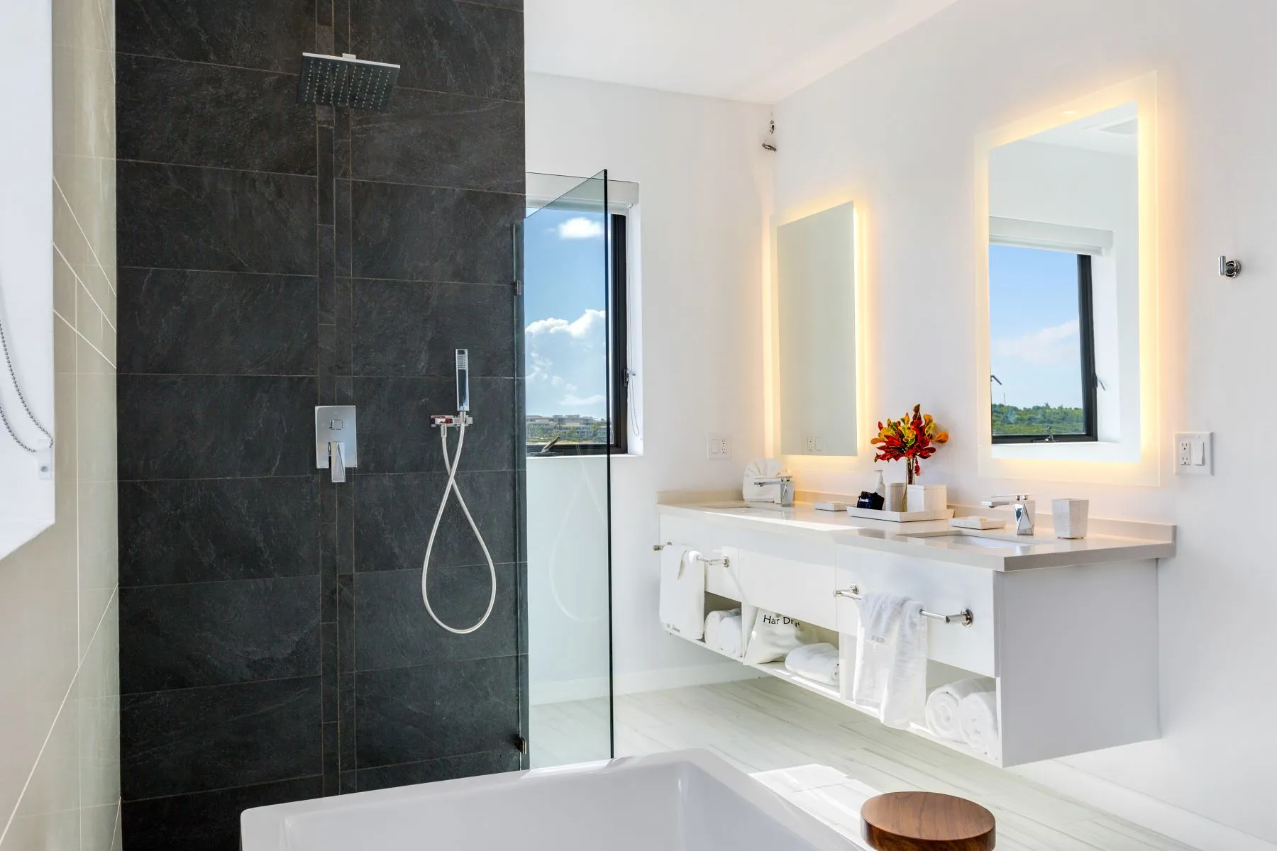 Building A is beachfront with the most spectacular views of Meads Bay on the beach. Building B is behind Building A and Building C is behind Building B and condos in B and C also have beautiful ocean or side ocean/garden views. And thanks to a convenient breezeway, no matter which condo you choose for your own, you can be at the water in seconds. All residences have outdoor terraces with private hot/cold tubs, full kitchens and in-unit washers and dryers.