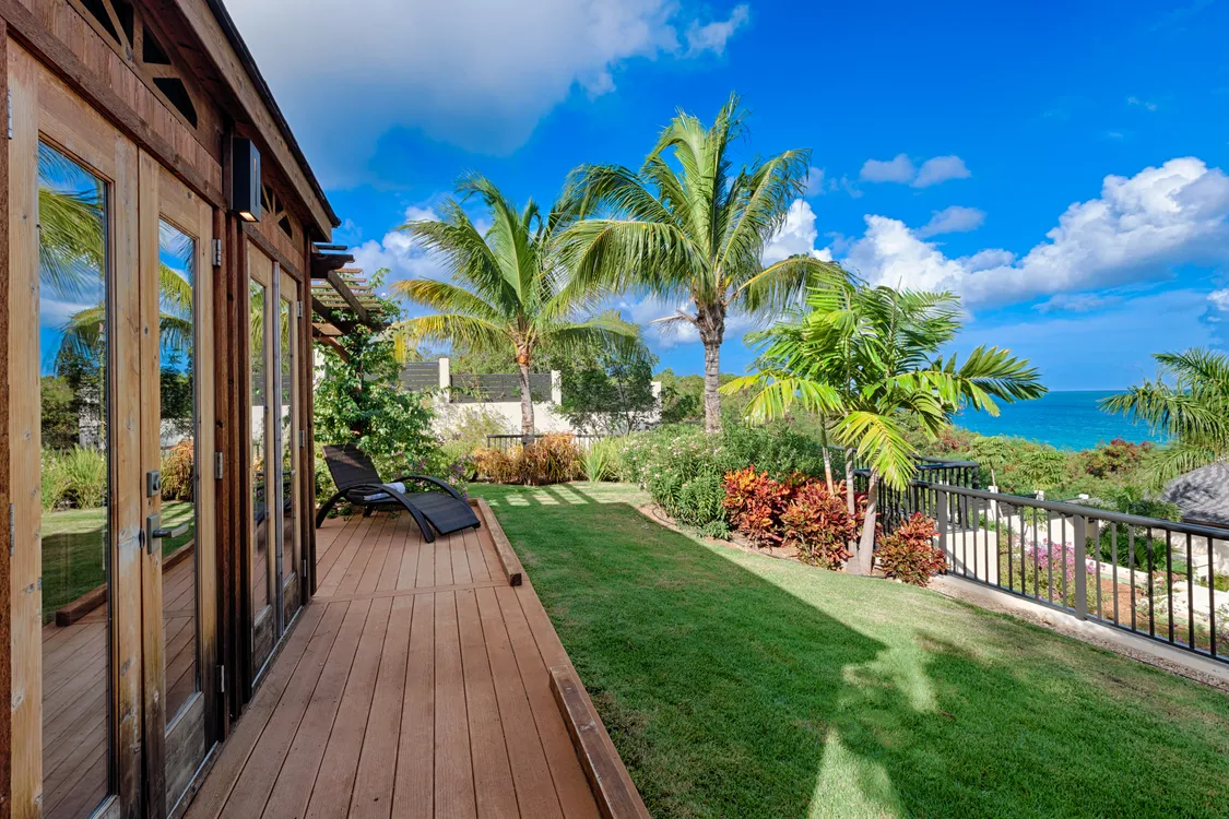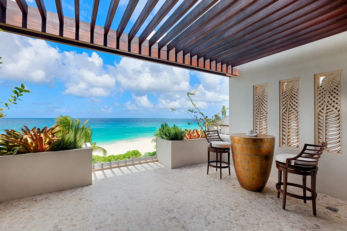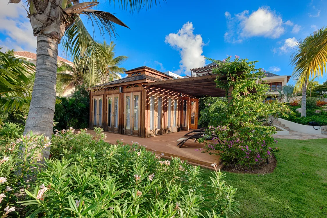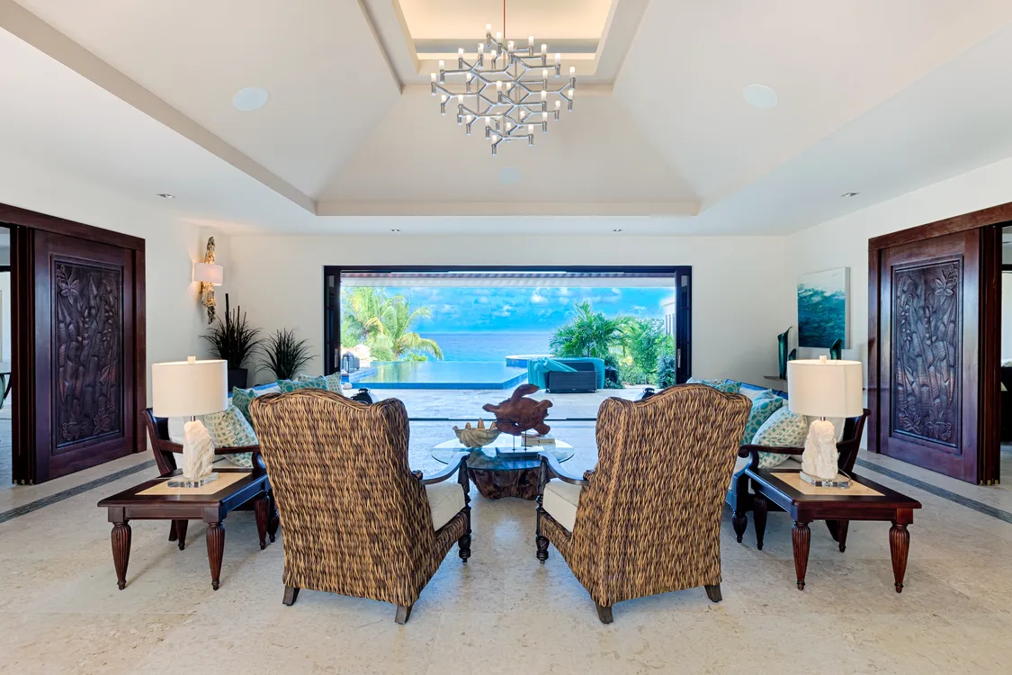 The estate is delineated with masterful elegance, uniting crafty Balinese furnishings with the natural beauty of Long Bay. The result is a harmonious sanctuary where indoor and outdoor living coalesce into one. The spacious great room offers splendid views of the swimming pool and the ocean eternally extending into the horizon, while a cozy media lounge and a gourmet eat-in kitchen, complete with terrace dining, flow with gusto between repose and entertainment.
