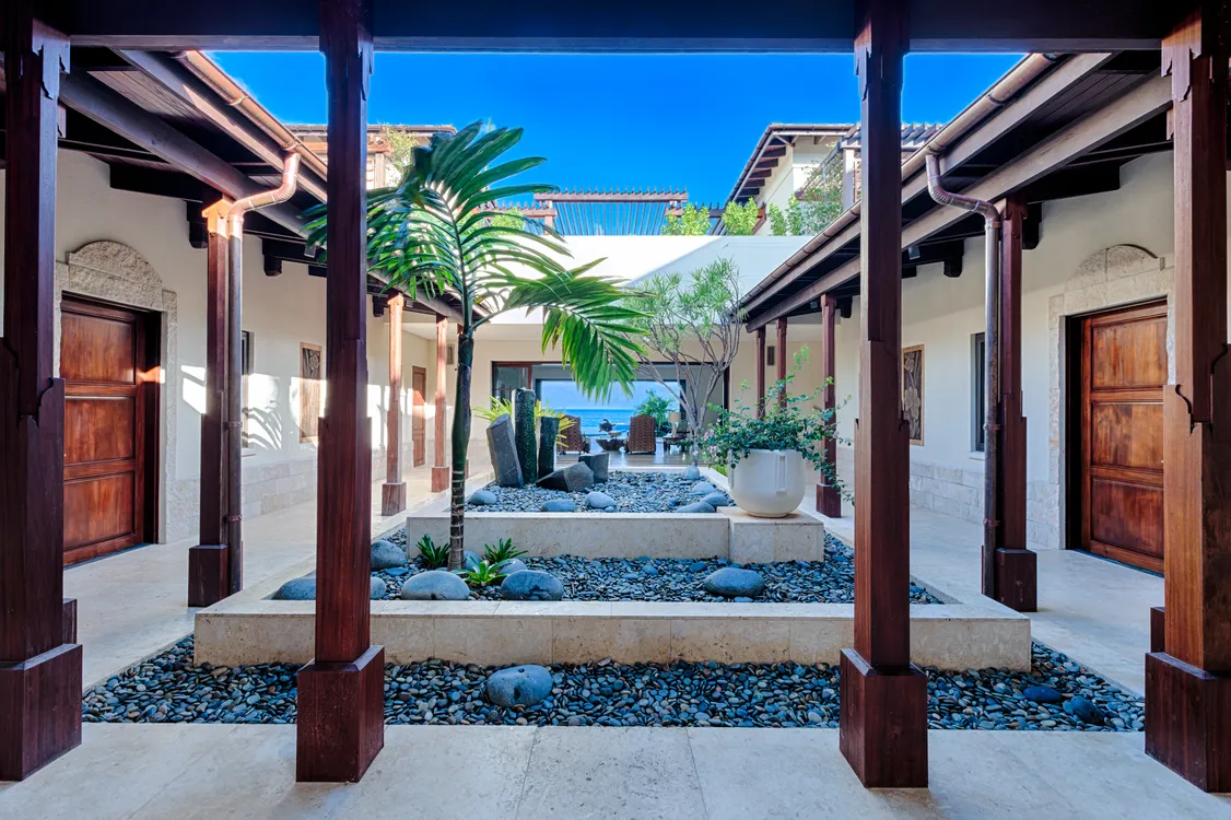 With 6,600 square feet of meticulously designed interior space, Nevaeh Villa provides vast room for relaxation, secrecy, and indulgence. The estate’s beautiful setting is elevated by a quiet Japanese courtyard, a central feature accessible through antique Balinese temple doors and adorned with intricately carved wood details that connect all the villa’s living spaces.