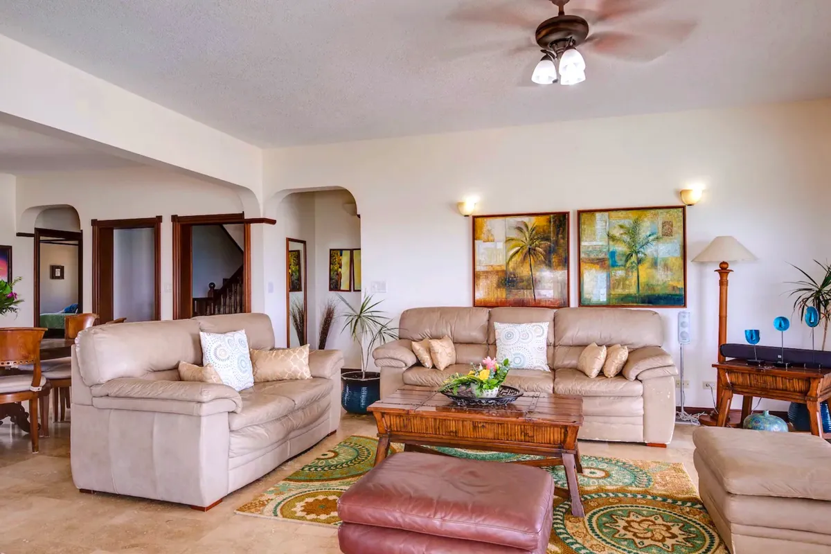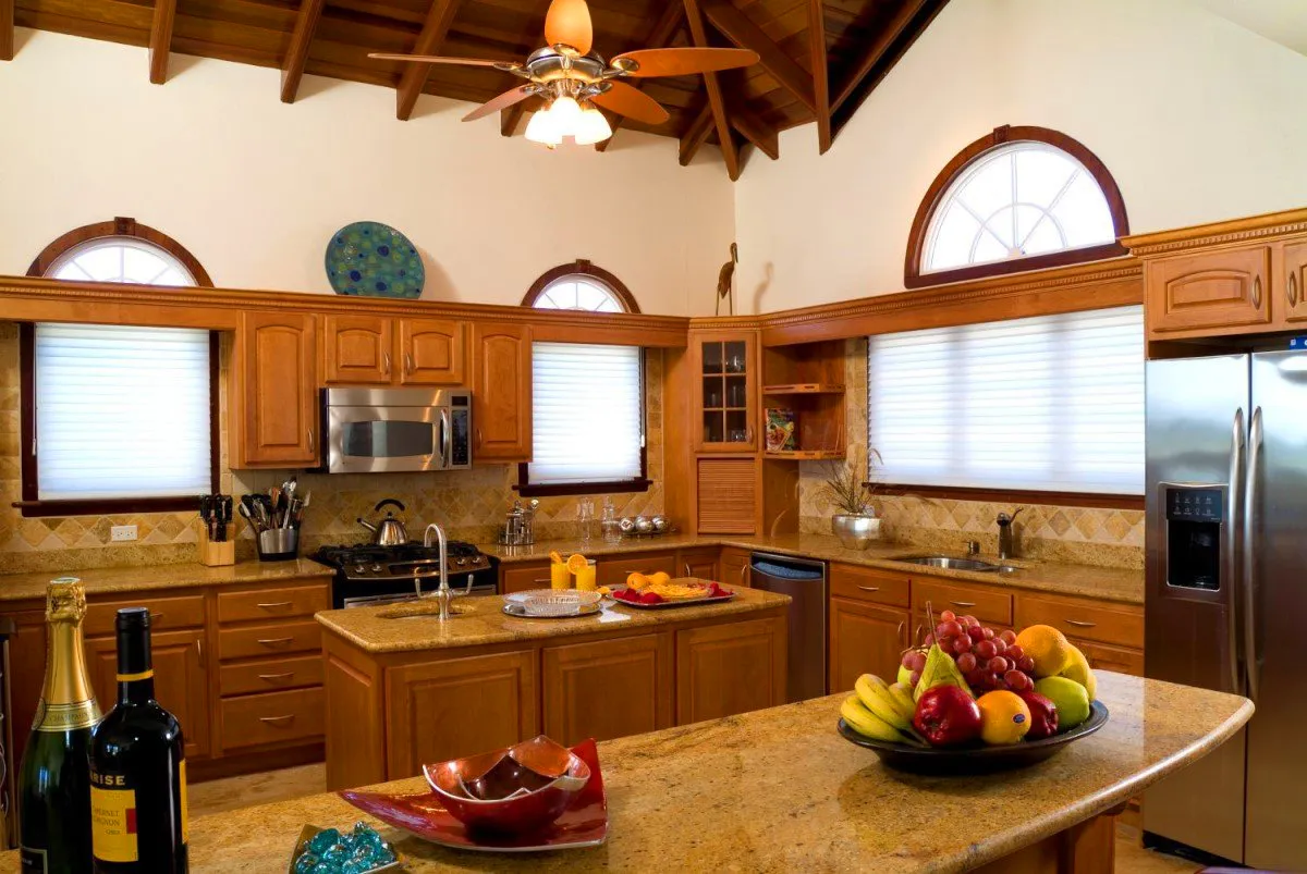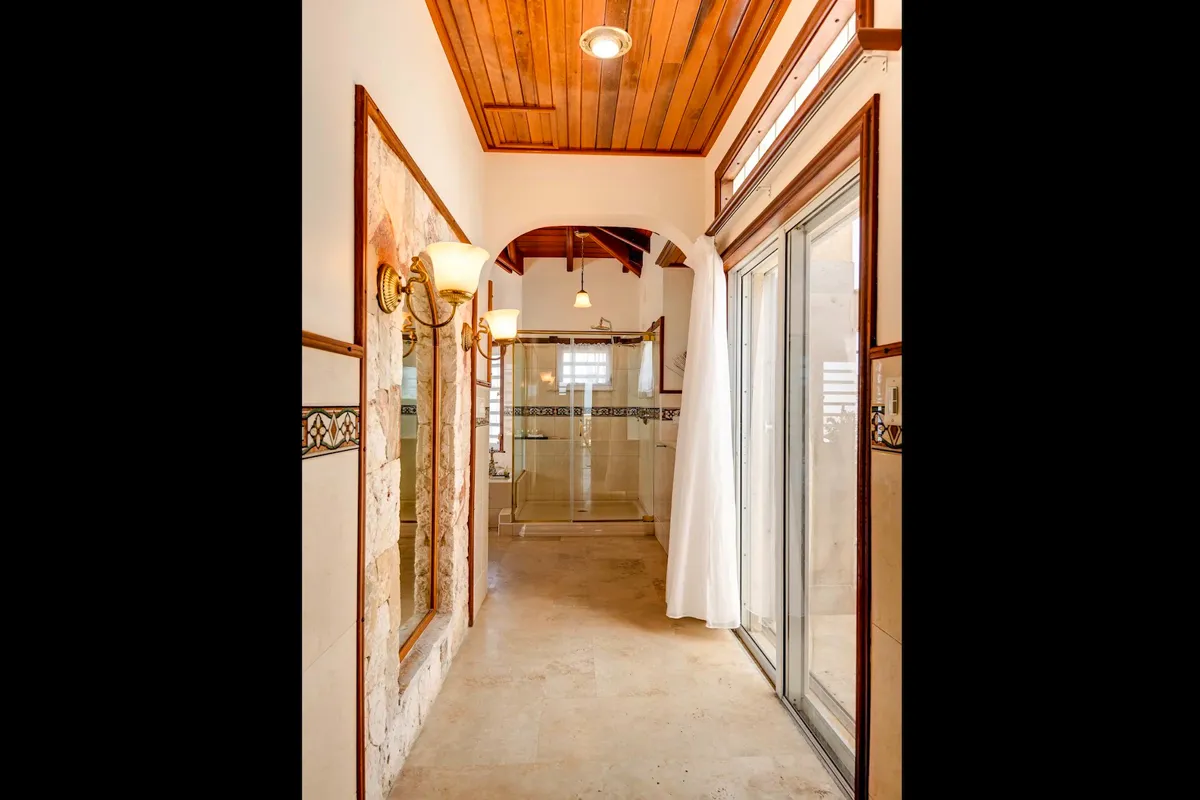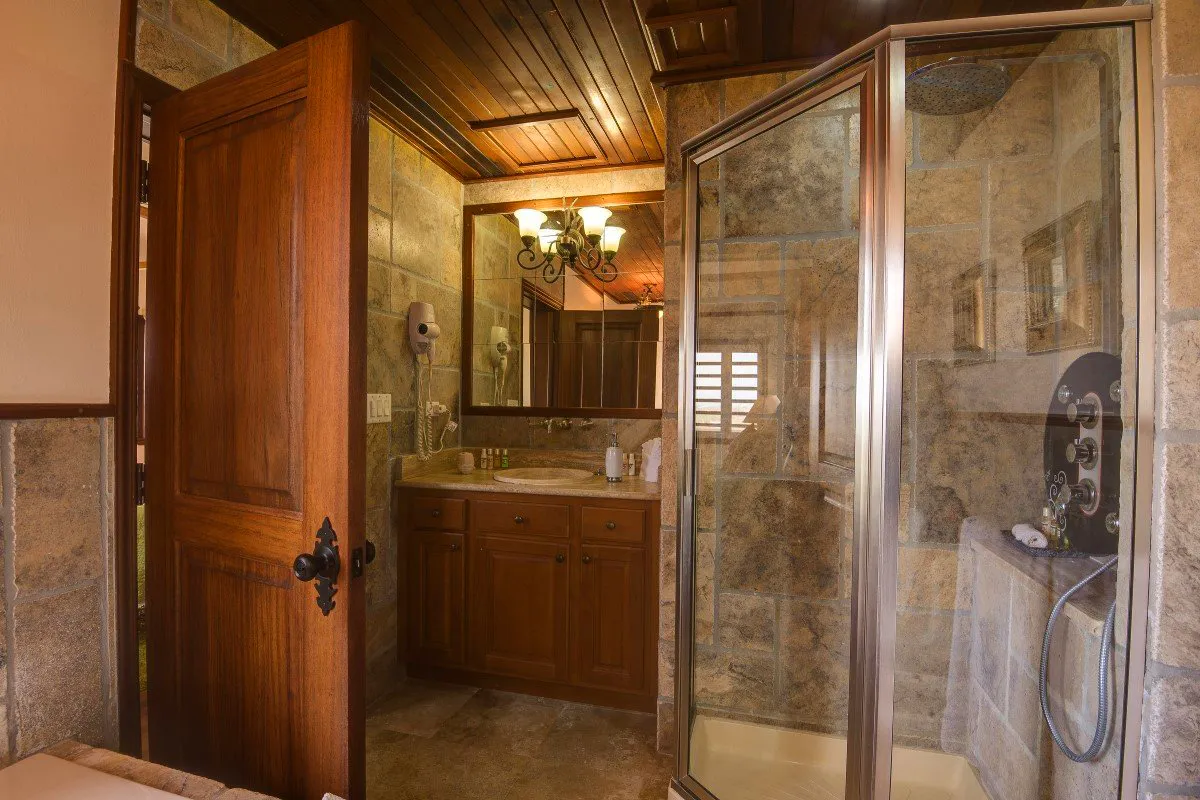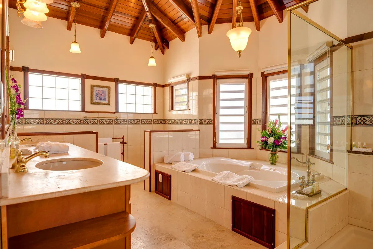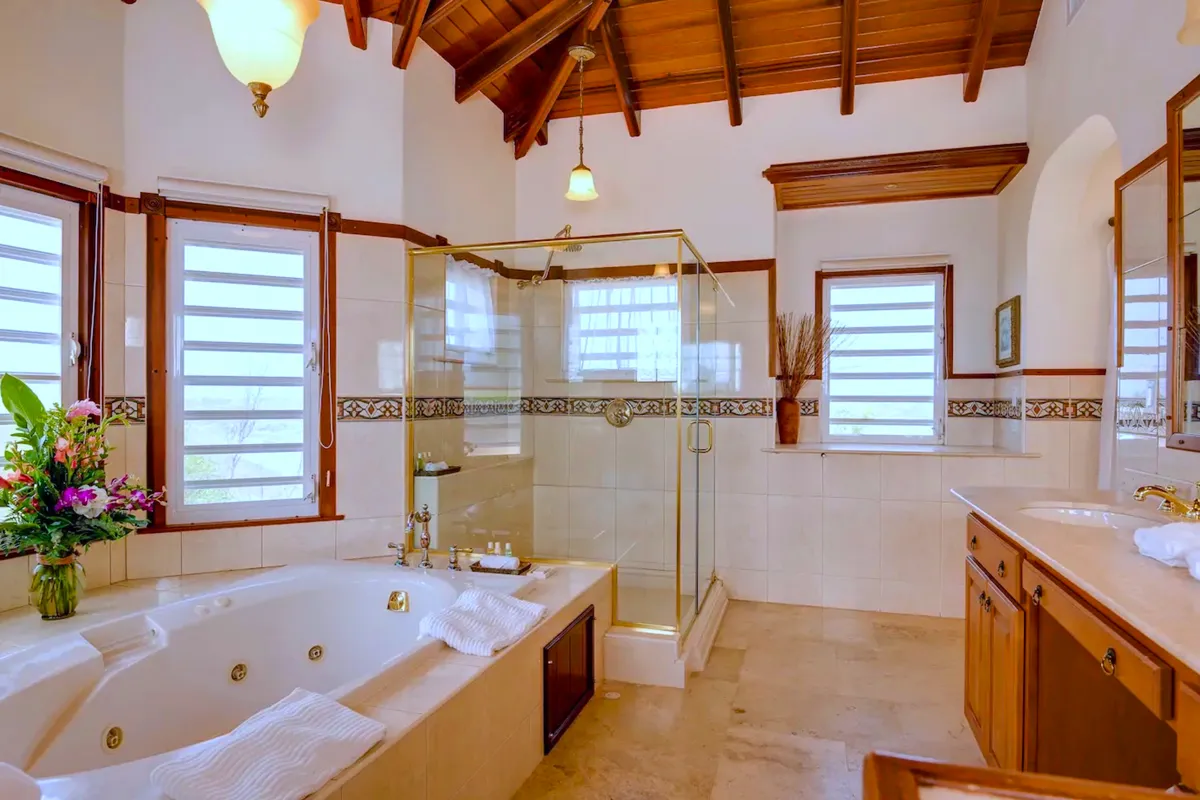 Nirvana’s spacious living room has soft leather sofas, a 42″ plasma TV, a sound system, a desk, and access to the pool deck. Off the living room, there’s a kitchen that’s fully equipped with stainless steel GE Profile appliances, a wine fridge, and an ice maker. All four of Nirvana’s bedrooms have air-conditioning and an ensuite bathroom. The master suite is located on the upper level with private galleries on two sides. Its four-poster king bed faces a flatscreen TV that’s hidden in a custom made cabinet at the foot of the bed. The spacious master bath has a Jacuzzi tub and top of the line fixtures. Two bedrooms are on the main level: one has a queen bed and the other has two twin beds that can be made into a king. Both of the ensuite bathrooms has a Jacuzzi tub, rain shower, and travertine marble flooring. The fourth bedroom is located on the lower level, and has a sitting area, a TV, a king bed, an ensuite bathroom with a walk-in shower and tub, and a small kitchen.