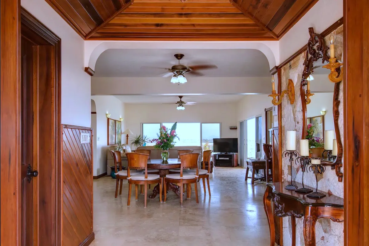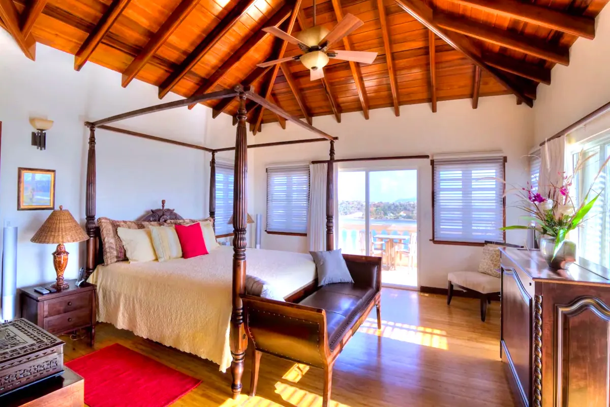The villa has a nicely landscaped garden with iron gates, a security alarm, and plenty of parking. Guests can watch ships sail in and out of the harbor from the expansive terrace and balconies. The main level terrace features gorgeous views from the sunny pool, loungers, and the dining table. There’s more dining space on the upper level balcony, as well as a Jacuzzi tub. A private gym with treadmills and resistance equipment is located on the lower level. Sandy Ground’s beach, harbor, and bars are a short drive away.
