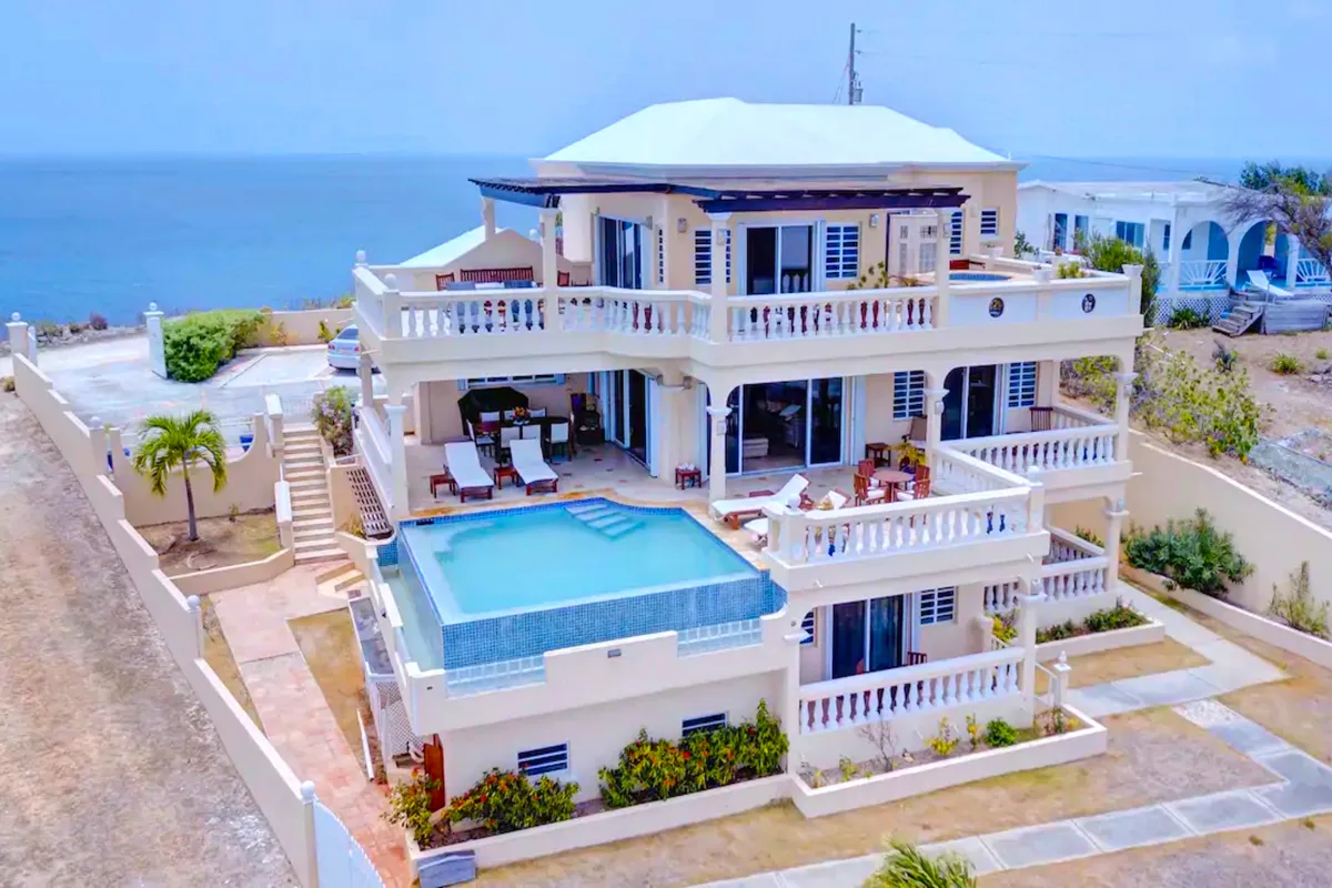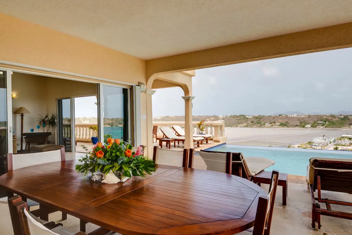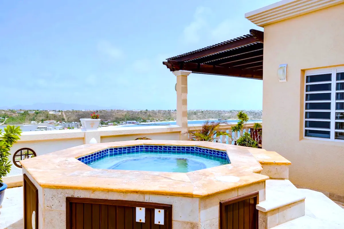 Nirvana has an enviable location at the northernmost tip of Sandy Ground. This four-bedroom villa overlooks the harbor and has 180º views of the sea, St. Maarten, and tropical sunsets.