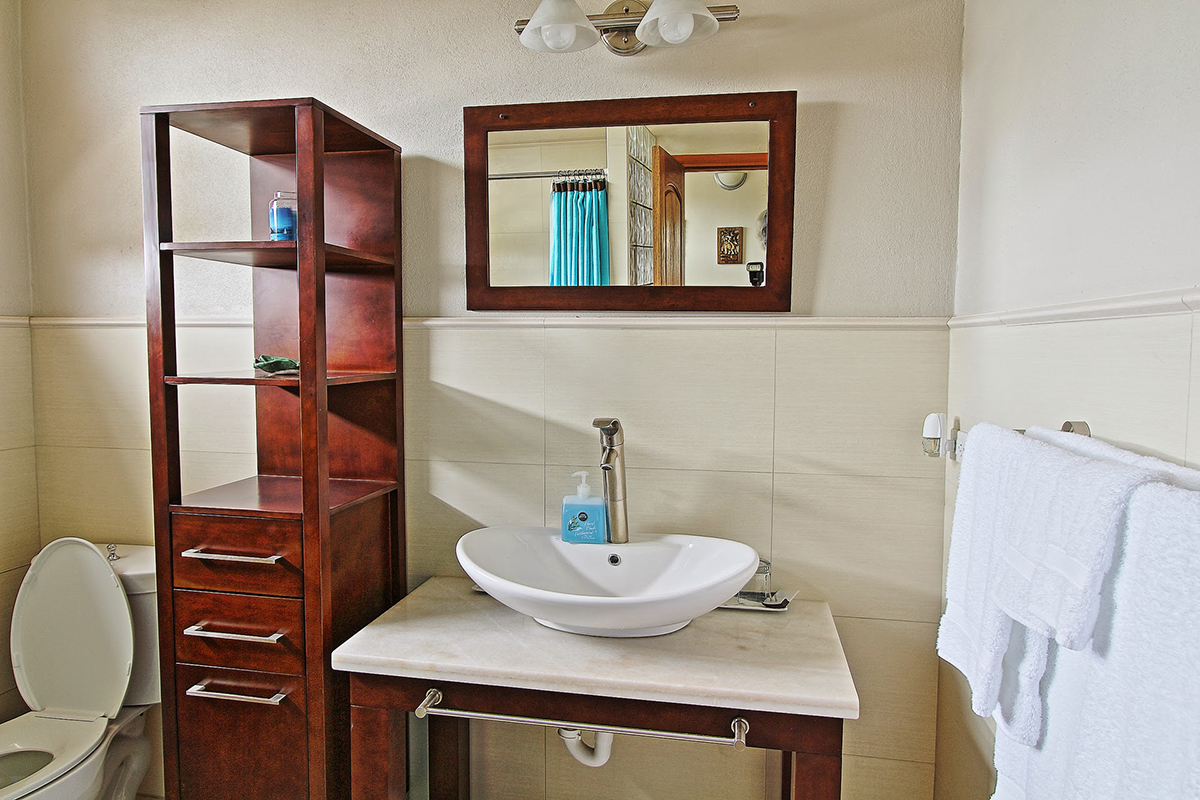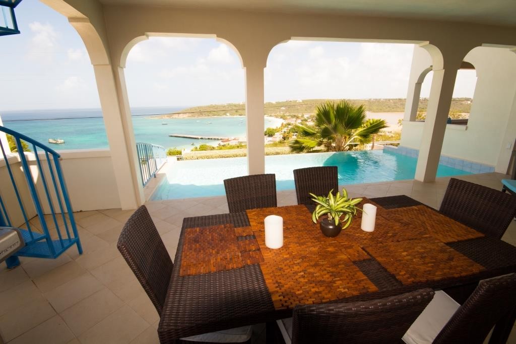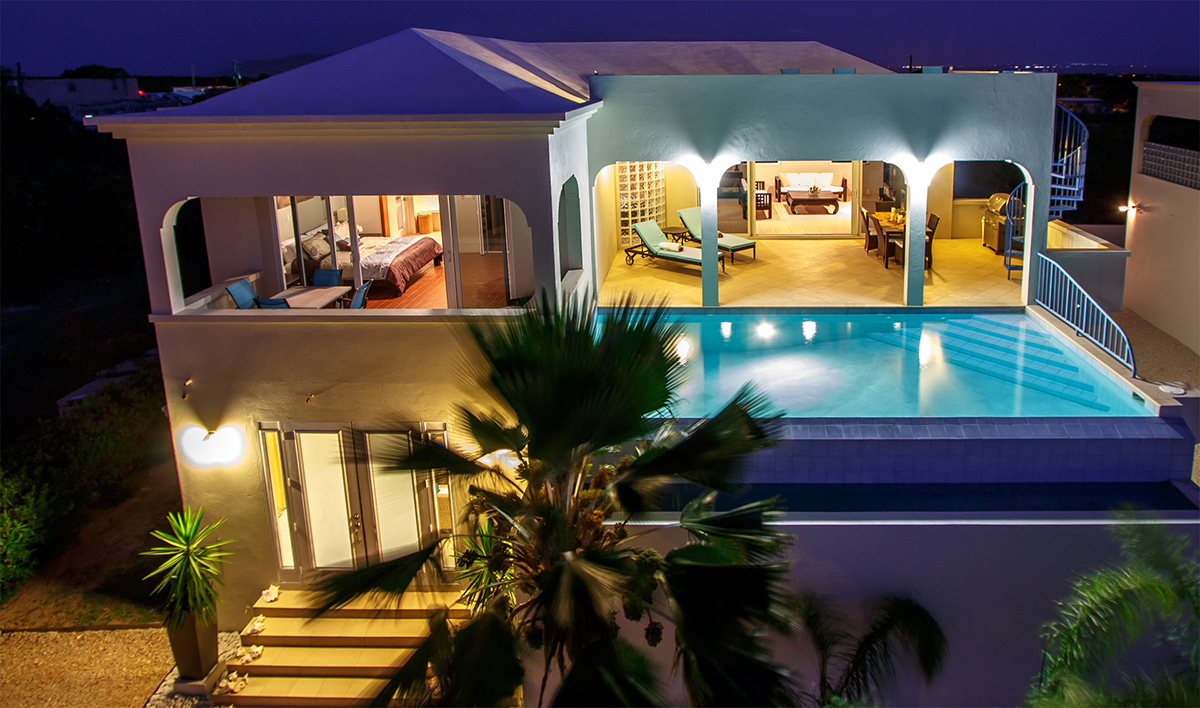 This modern 3BR/3.5 BA resort home features breathtaking 360 degree views and a spacious upper level lounge which rolls seamlessly into the pool deck and infinity pool that appears to melt into the sky above and Sandy Ground Bay below. Take the winding spiral staircase to the third level observation deck, perfect for private sunbathing and watching the sunset over the calm waters.