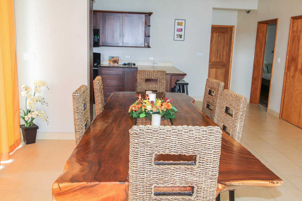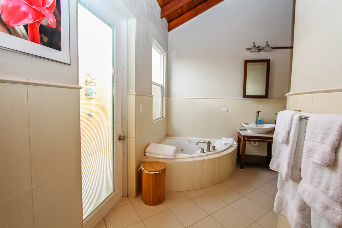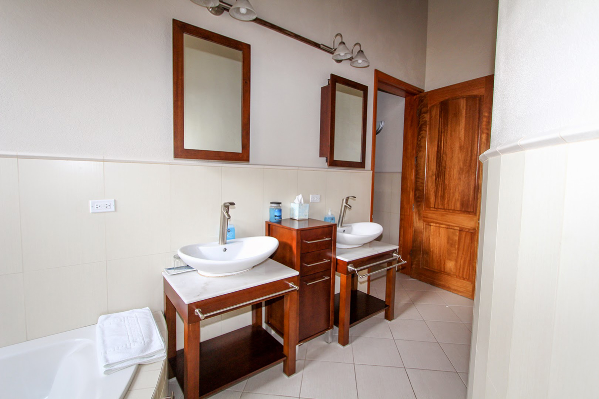 The lower level of the villa has 2 bedrooms, each with their own ensuite bathroom, open layout kitchen featuring custom cabinetry, and a living/dining room area that includes a desk. The upper level features an entertainment lounge which opens onto the pool deck and infinity pool, and a large MBR suite with an outdoor seating area and bathroom featuring a whirlpool tub and private outdoor shower.