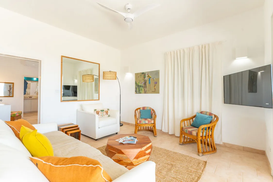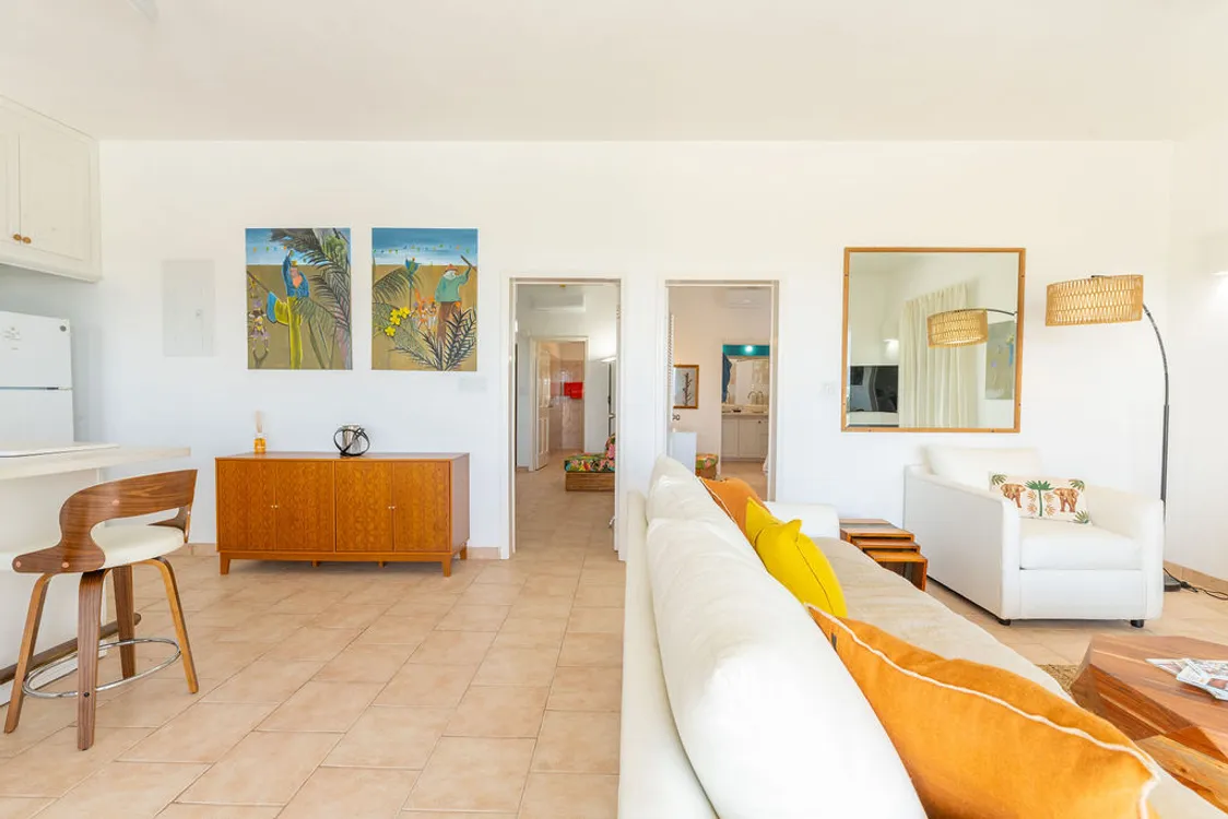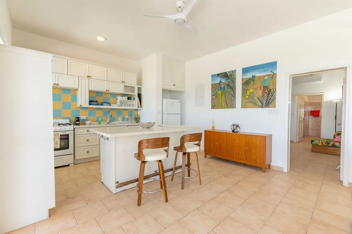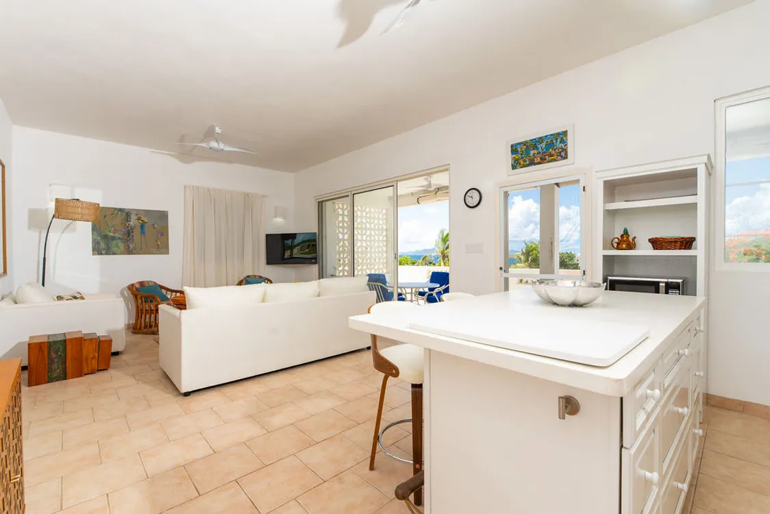 The open-plan kitchen, dining, and living areas flow together, creating a spacious feel. This unit benefits from year-round trade winds that flow pleasantly through all the rooms. There are two large en-suite bedrooms with updated furniture and air conditioning, as well as a comfortable outdoor terrace with sea views and shaded seating. This area also accommodates the washer and a spare deep freezer.