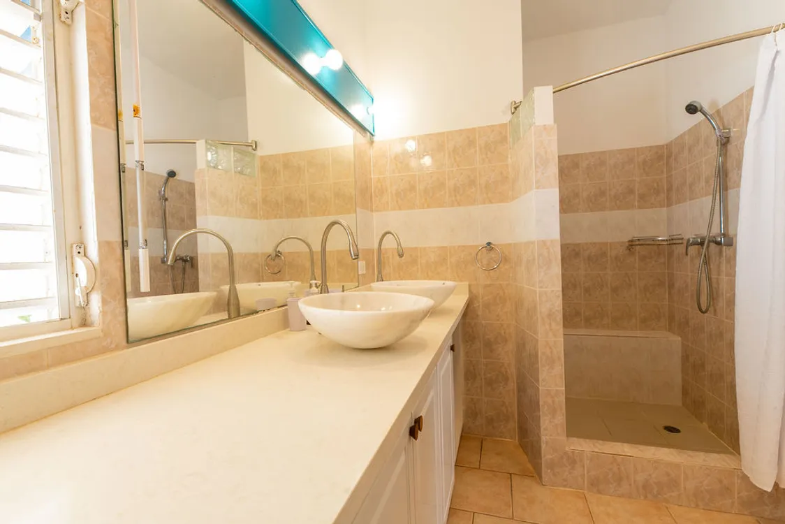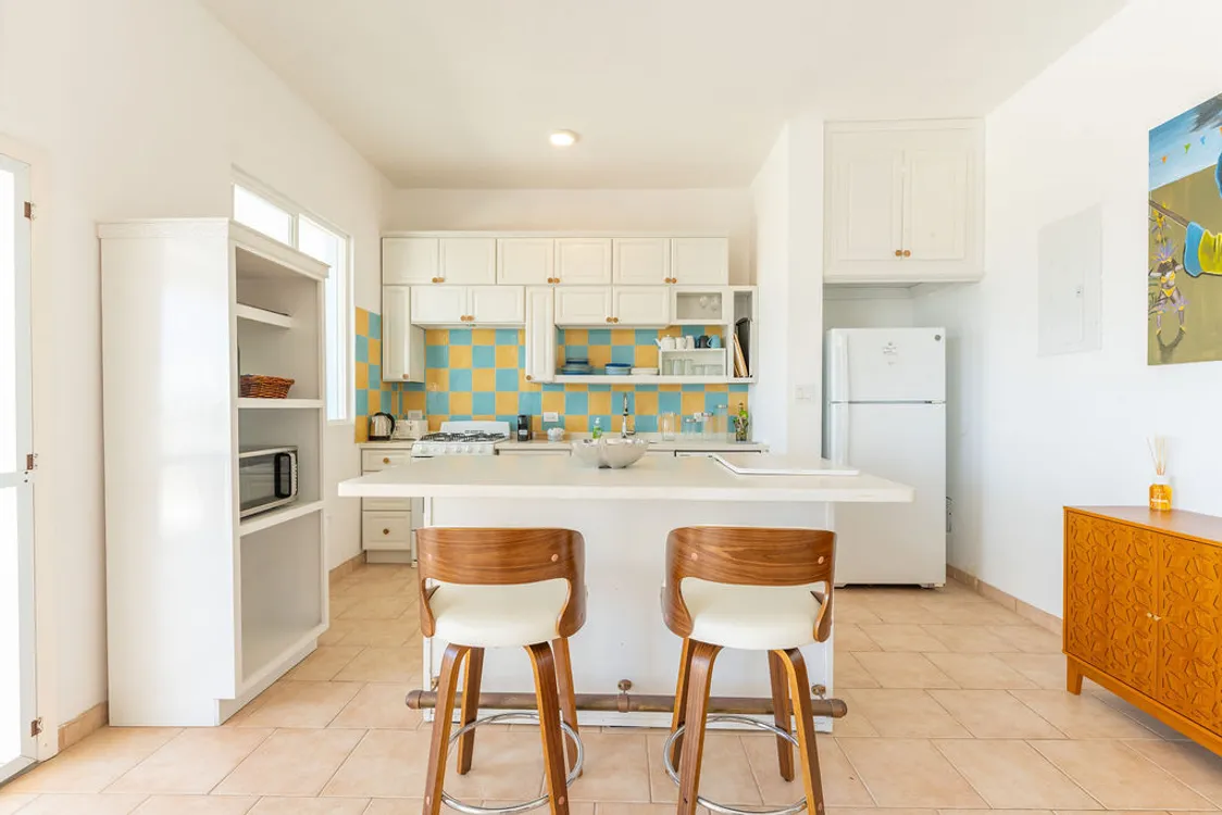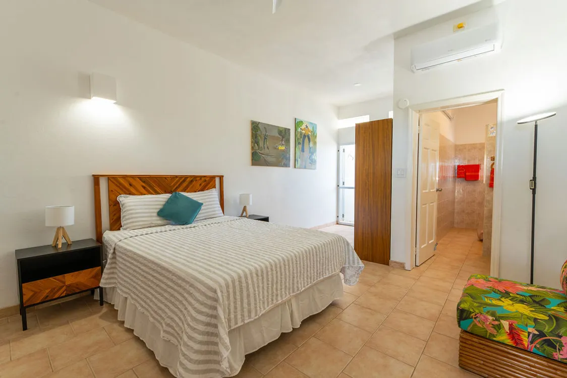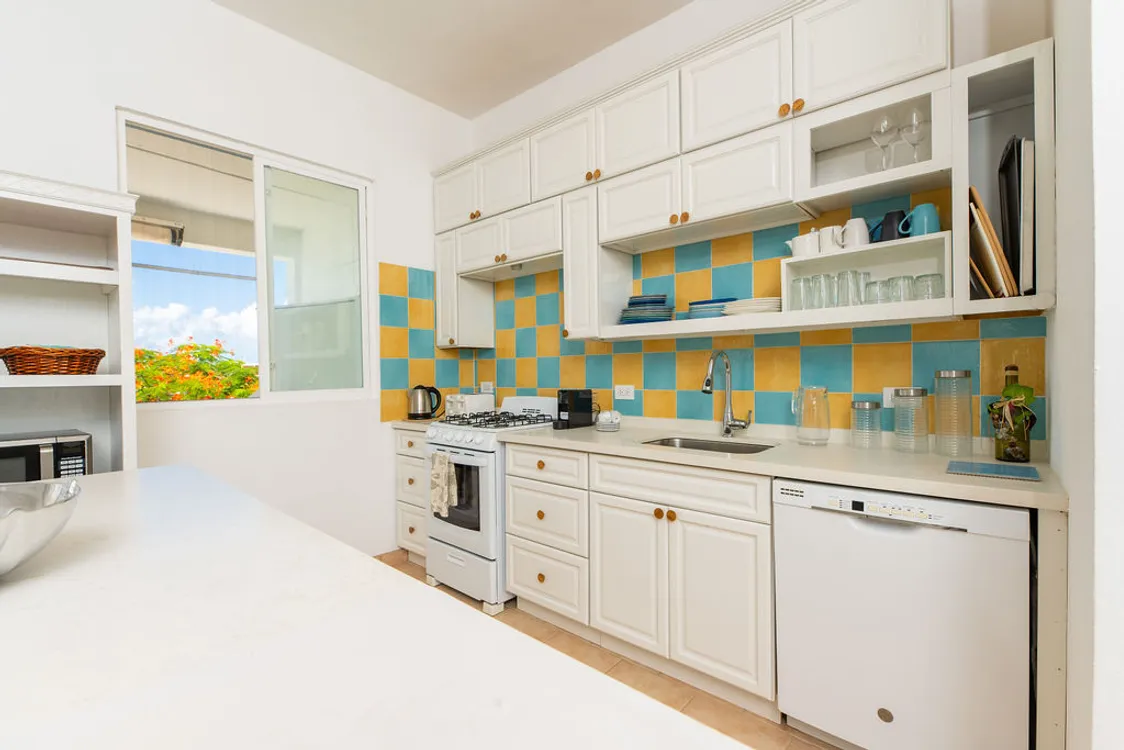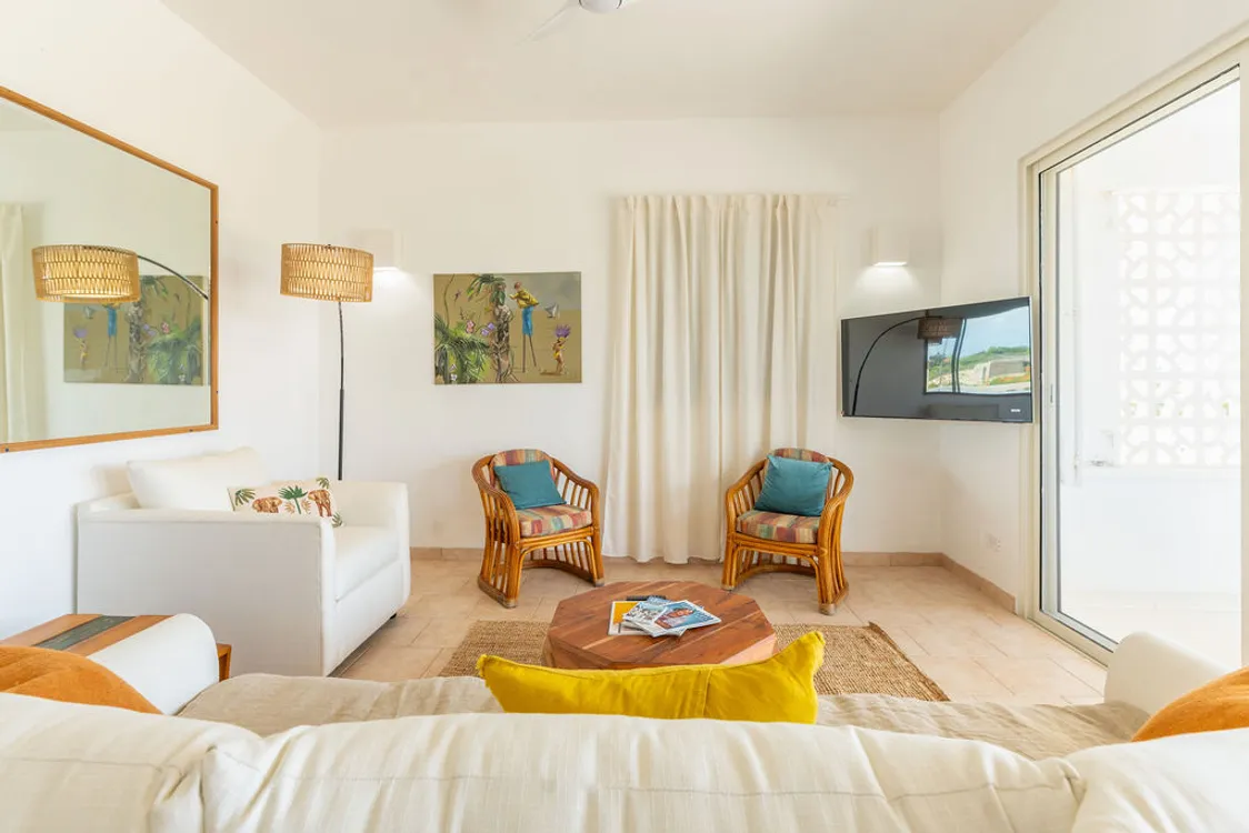 The open-plan kitchen, dining, and living areas flow together, creating a spacious feel. This unit benefits from year-round trade winds that flow pleasantly through all the rooms. There are two large en-suite bedrooms with updated furniture and air conditioning, as well as a comfortable outdoor terrace with sea views and shaded seating. This area also accommodates the washer and a spare deep freezer.