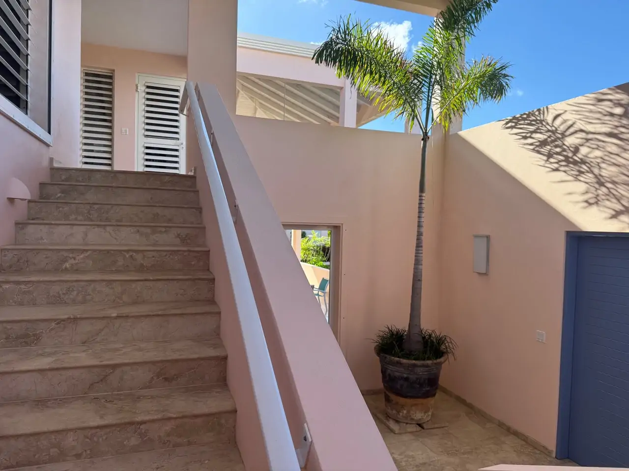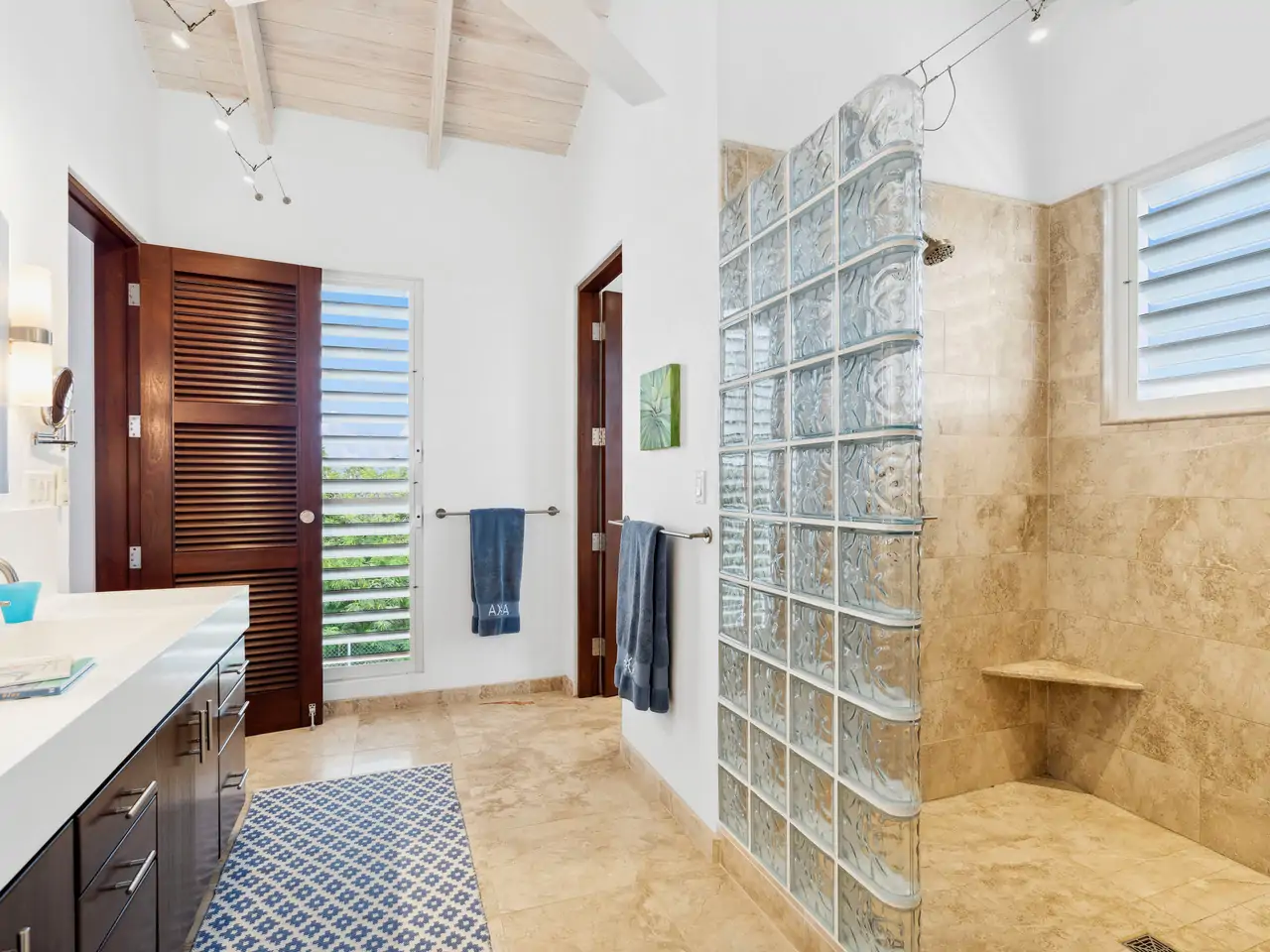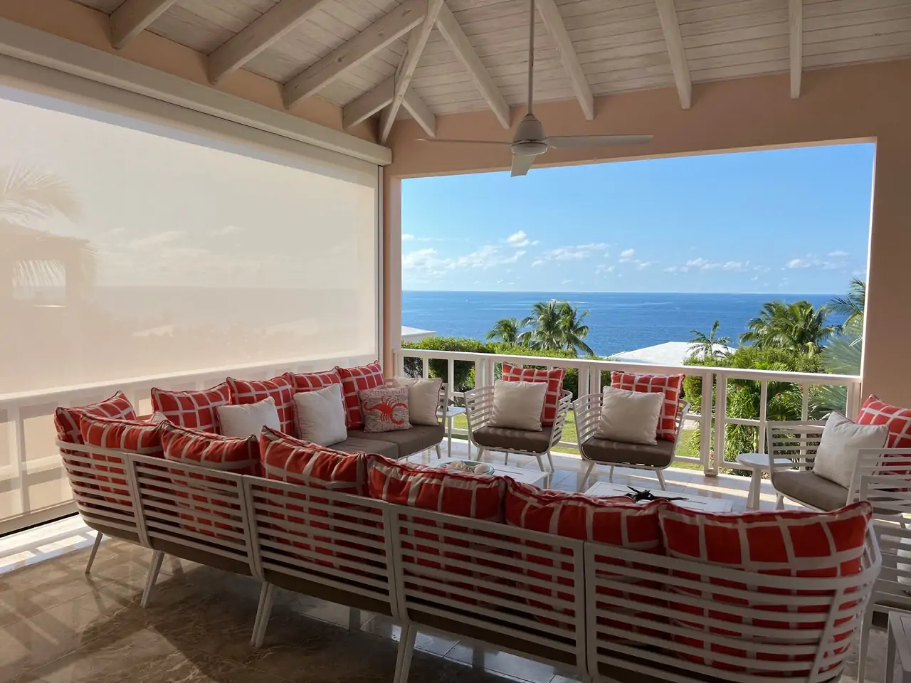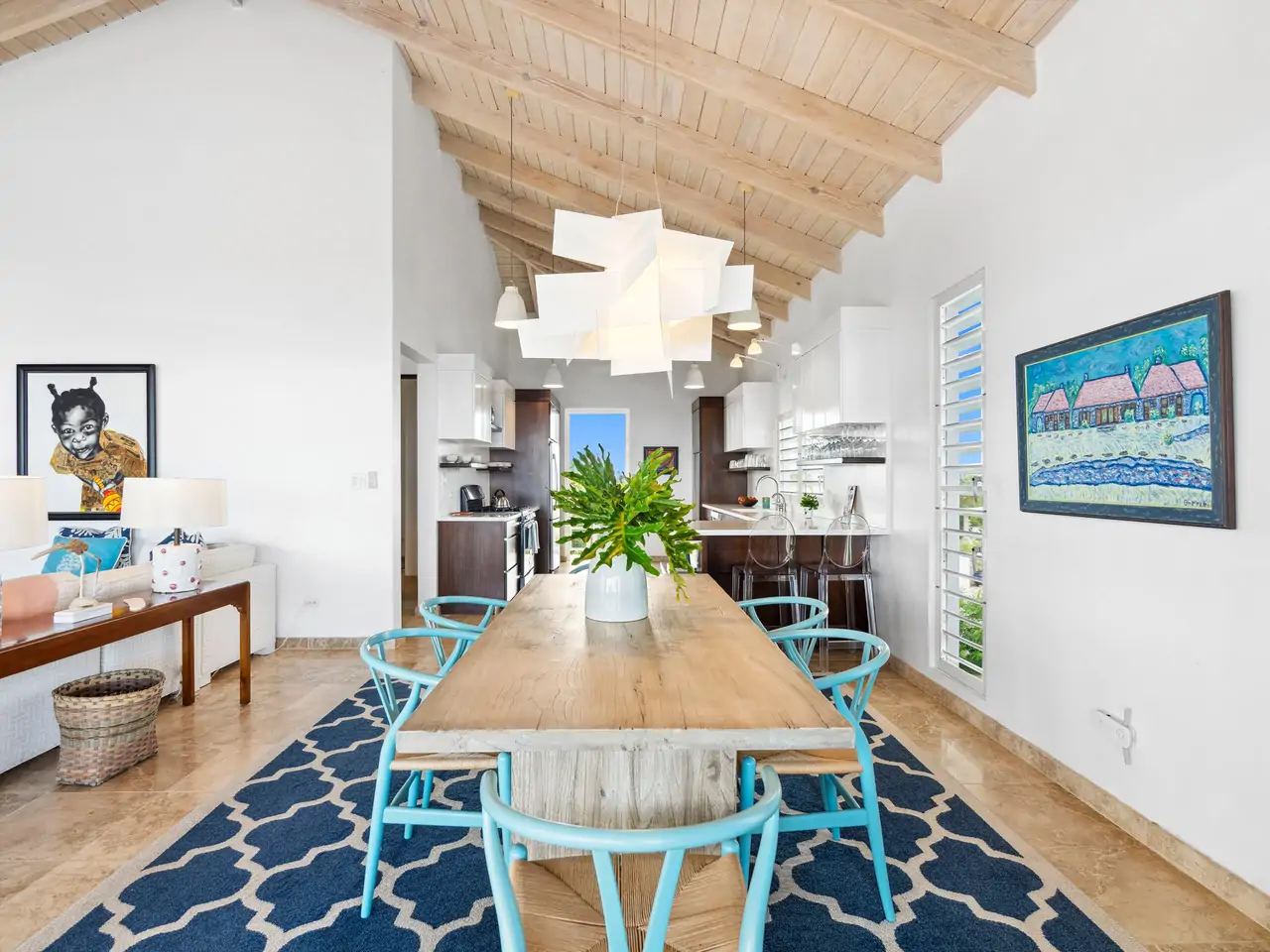 The beautiful primary living area has an open concept living room, dining room, kitchen and wine bar. The expansive covered deck boasts an outdoor dining area with a built-in bar that overlooks the ocean due north and the hills of Saint Martin in the opposite direction. The layout of the upper level also features a large air-conditioned primary suite with bathroom and walk-in closet and a secondary bedroom with its en-suite bathroom.