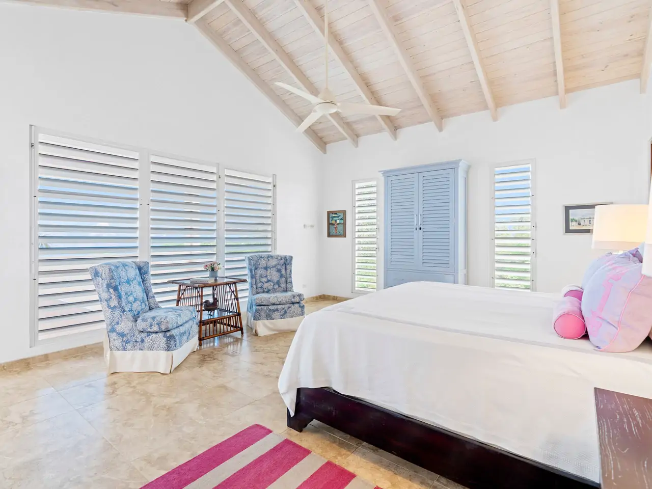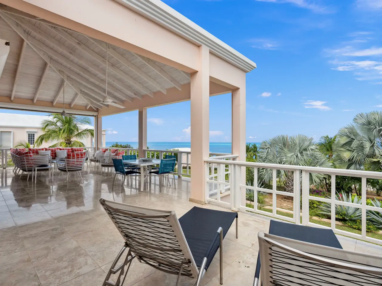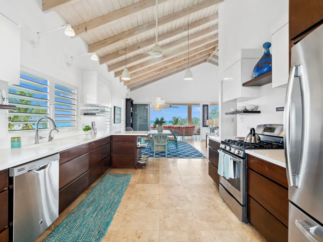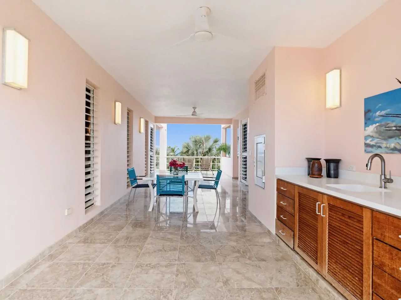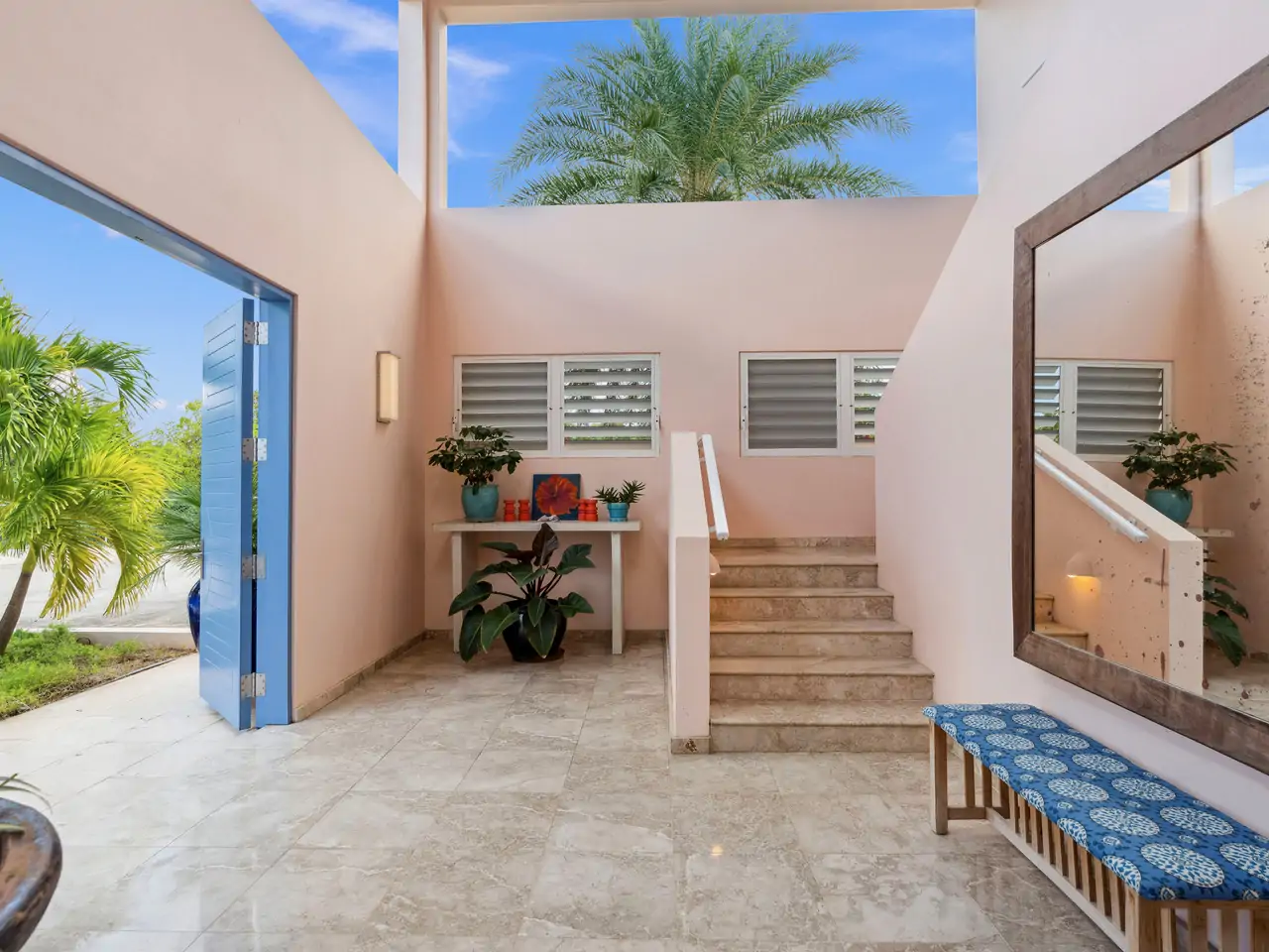 The beautiful primary living area has an open concept living room, dining room, kitchen and wine bar. The expansive covered deck boasts an outdoor dining area with a built-in bar that overlooks the ocean due north and the hills of Saint Martin in the opposite direction. The layout of the upper level also features a large air-conditioned primary suite with bathroom and walk-in closet and a secondary bedroom with its en-suite bathroom.