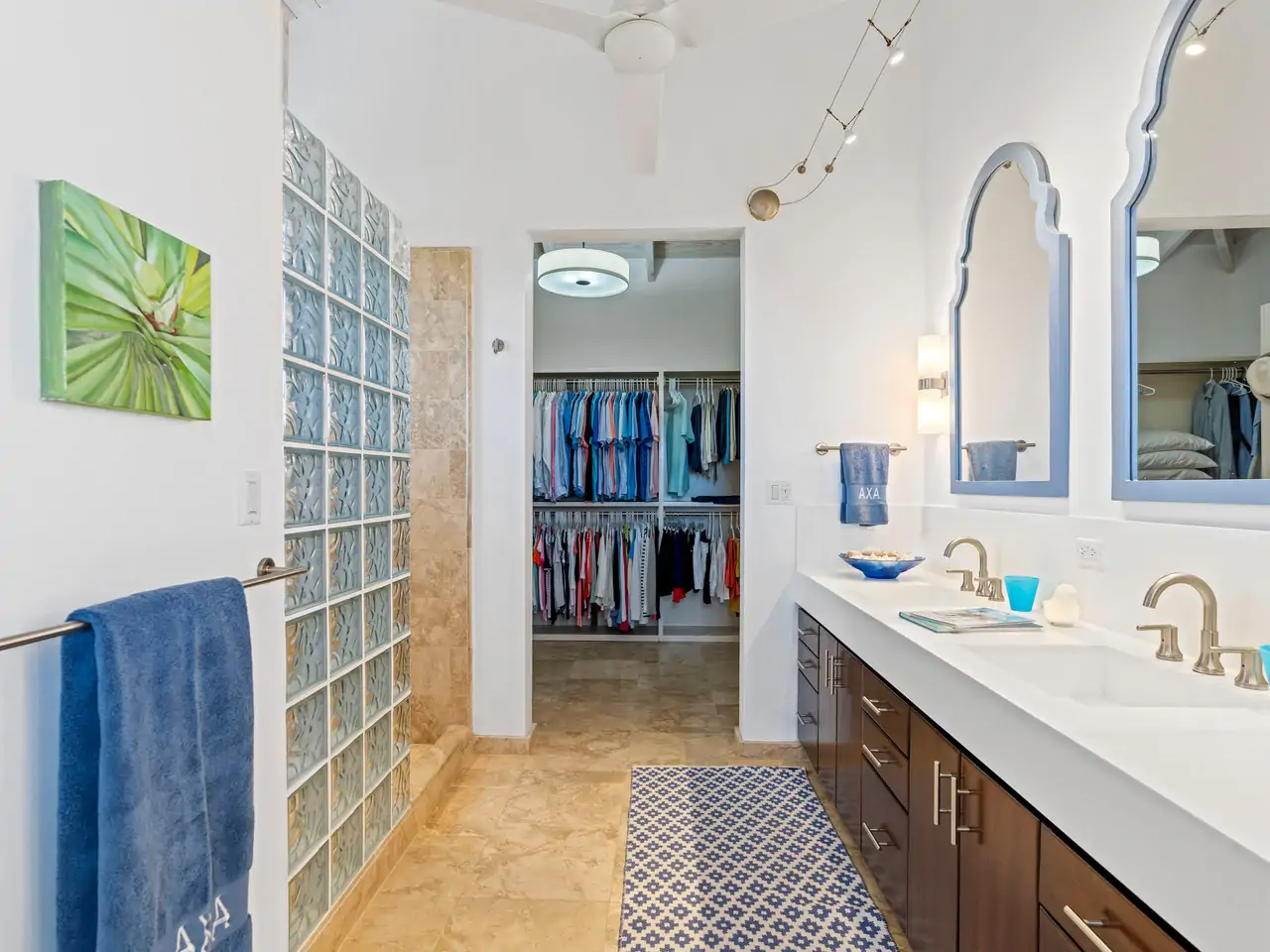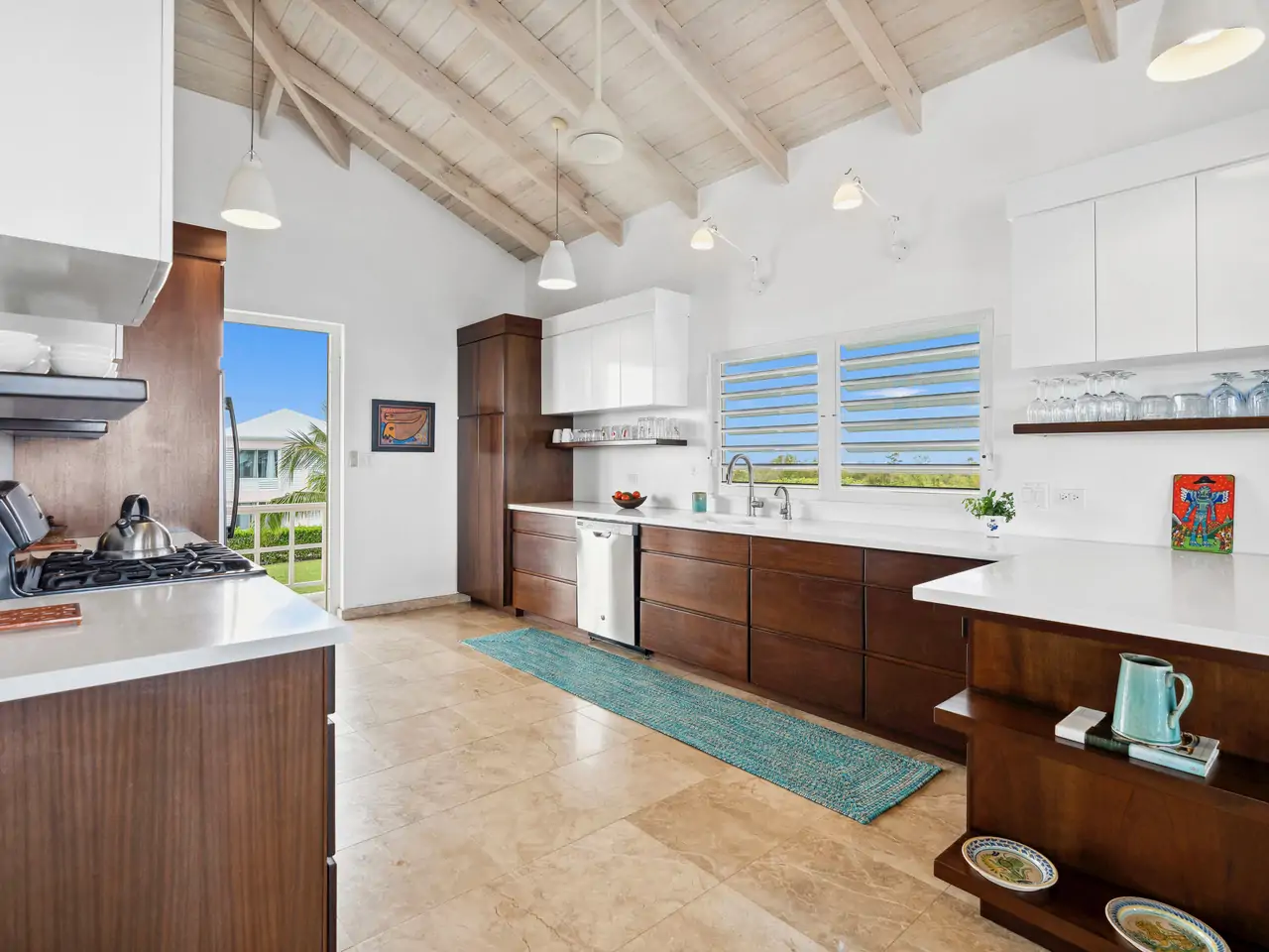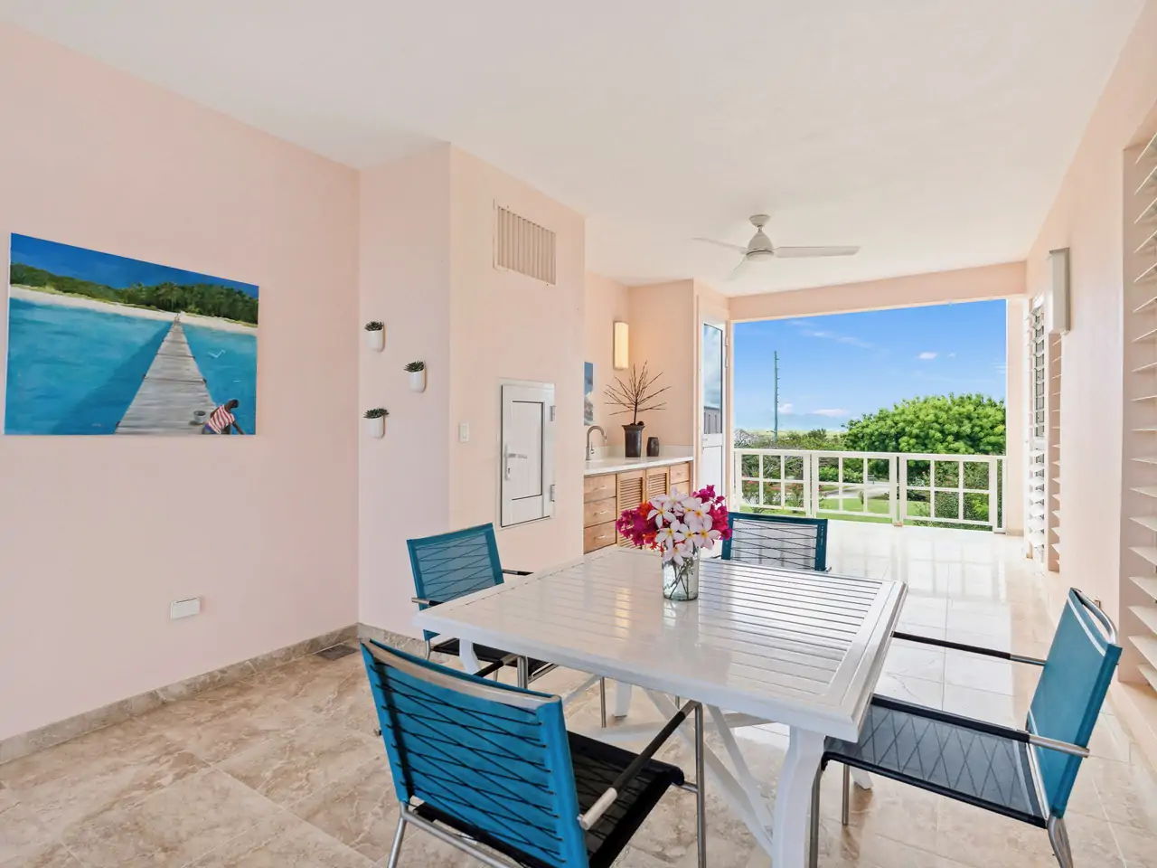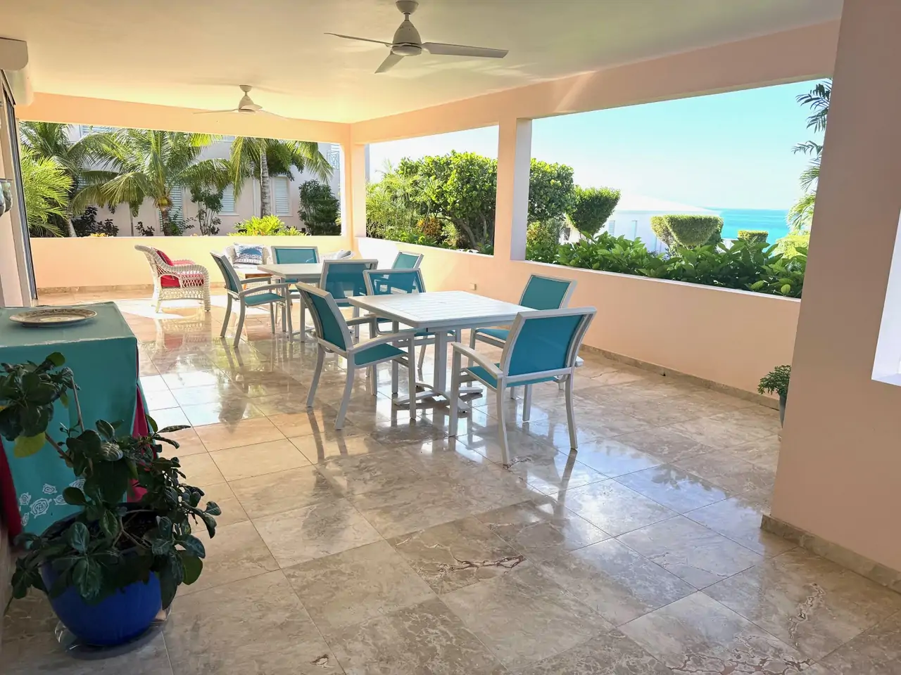 The beautiful primary living area has an open concept living room, dining room, kitchen and wine bar. The expansive covered deck boasts an outdoor dining area with a built-in bar that overlooks the ocean due north and the hills of Saint Martin in the opposite direction. The layout of the upper level also features a large air-conditioned primary suite with bathroom and walk-in closet and a secondary bedroom with its en-suite bathroom.