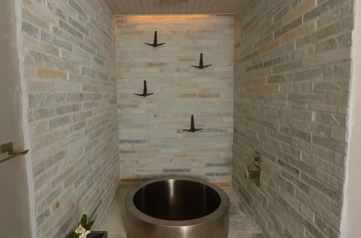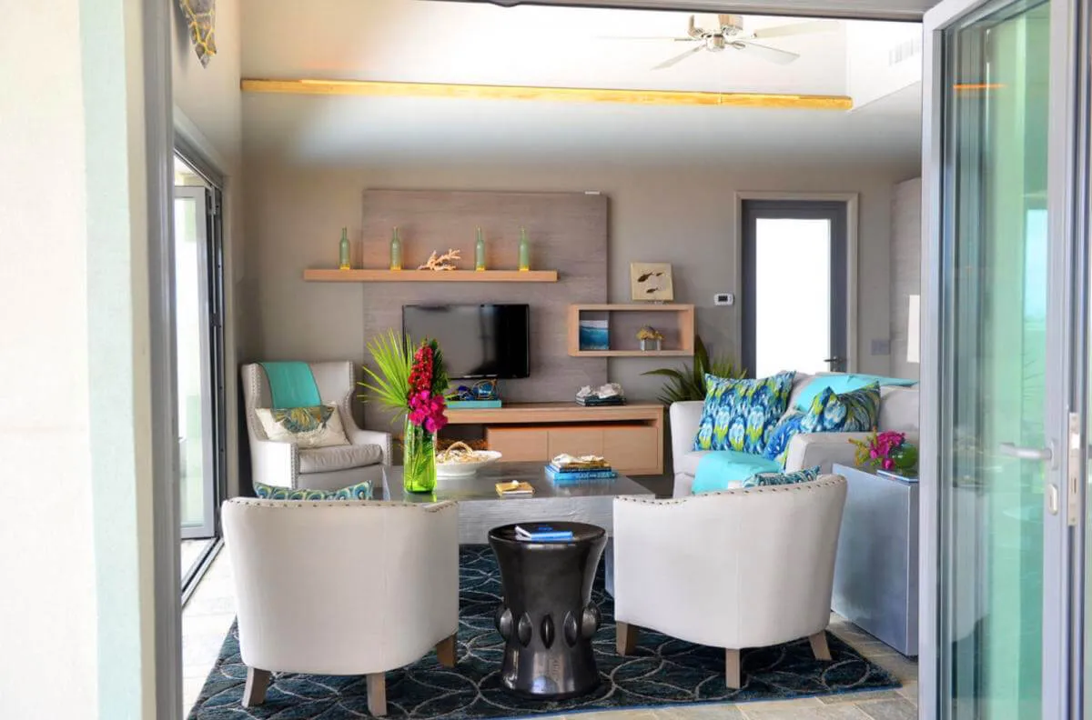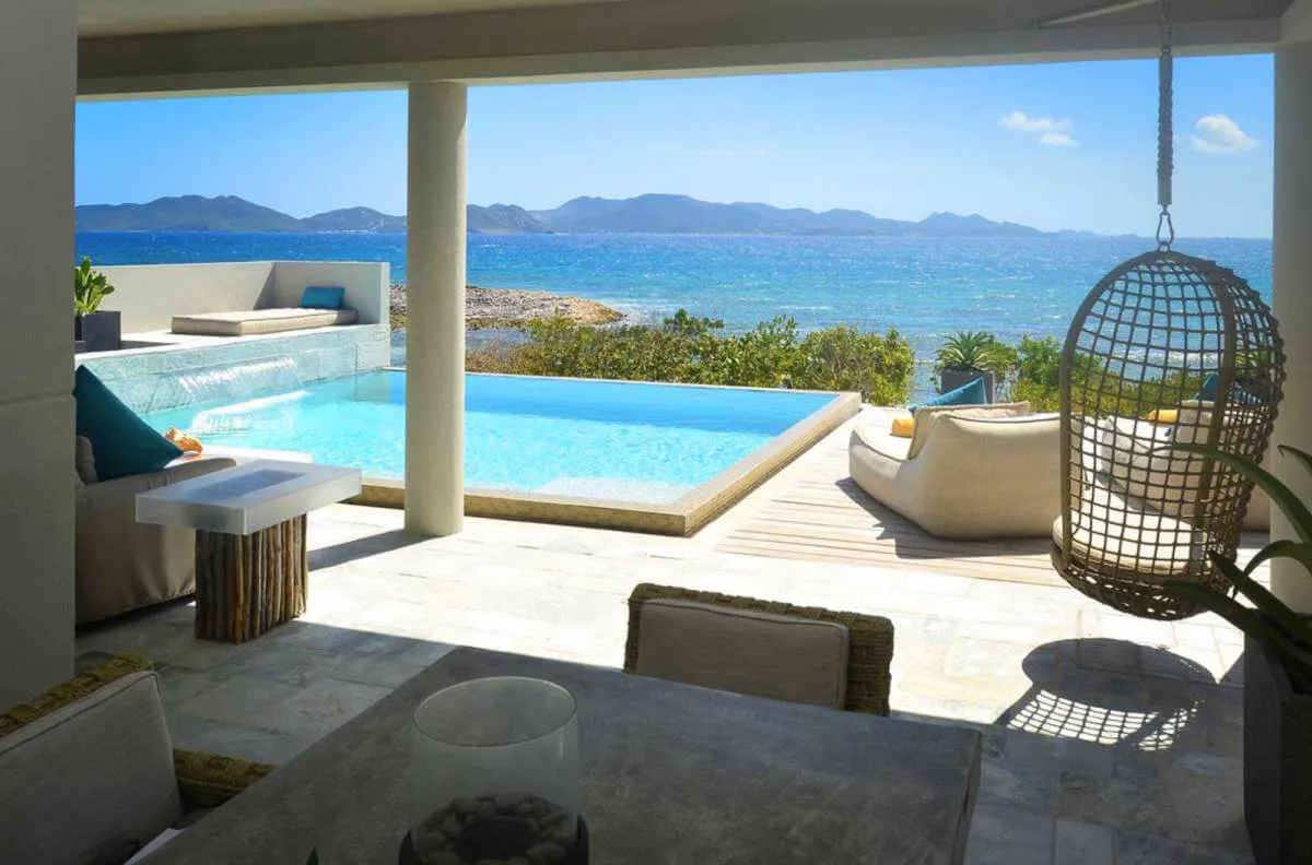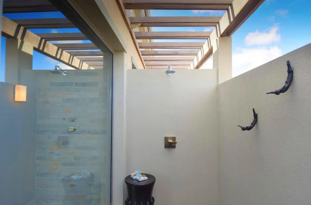 Pelican Bay Reef is a few steps away from the villa, and the beach is exclusive to Solaire guests. Jump into the pool to soak up the sun, and gaze at the ocean beyond the trees. The pool’s waterfall and wading area add luxury, and the adjacent veranda provides space to lounge and dine in the shade. A swinging chair, dining table, and comfy couches furnish the veranda and pool deck, and there are two outdoor showers for rinsing off the sand and sea.
