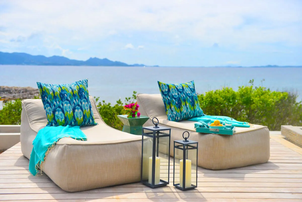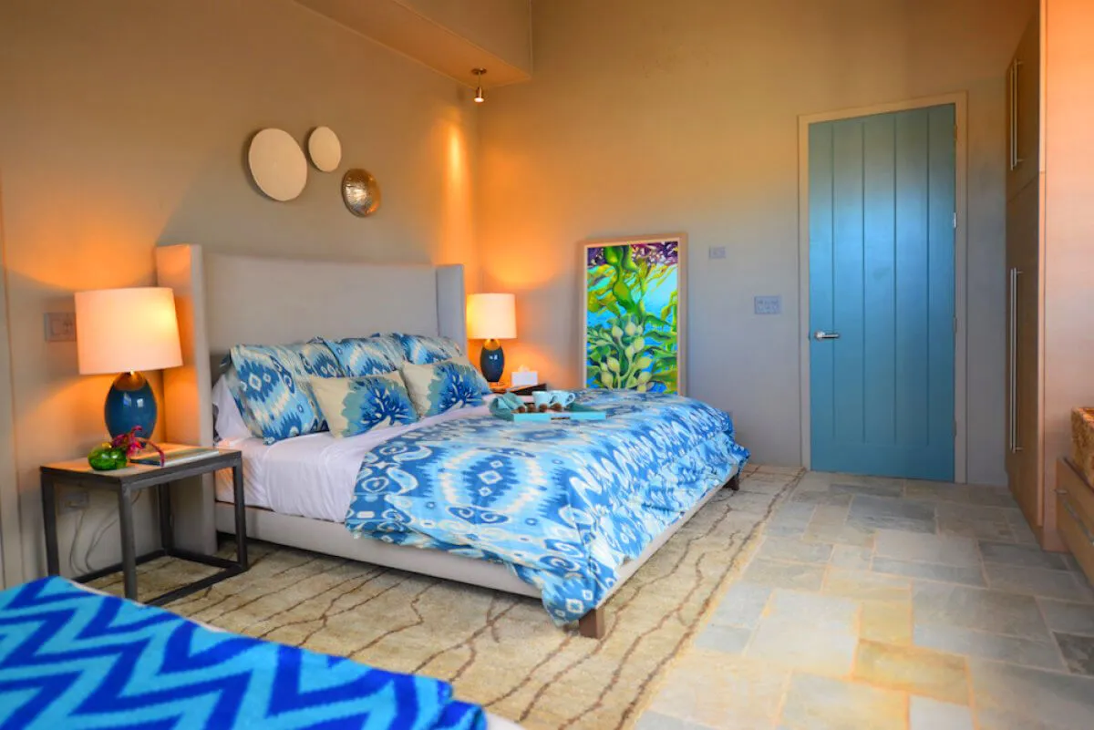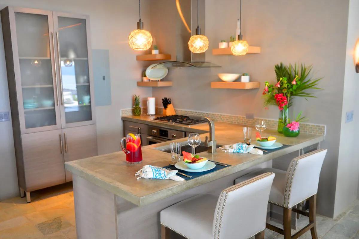 Sustainable design runs throughout the villa via natural lighting, local artwork, and clean lines. Daily housekeeping and rum punch upon arrival guarantee a relaxing vacation. Solaire’s living area opens to the veranda and blends into the kitchen. Guests can watch movies on the flatscreen TV, cook on stainless steel appliances, or enjoy coffee at the breakfast bar without missing one second of the ocean view. Each bedroom has an ensuite bathroom, but one has a king bed and the other has two twin beds that can be turned into a king.