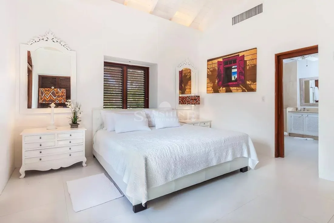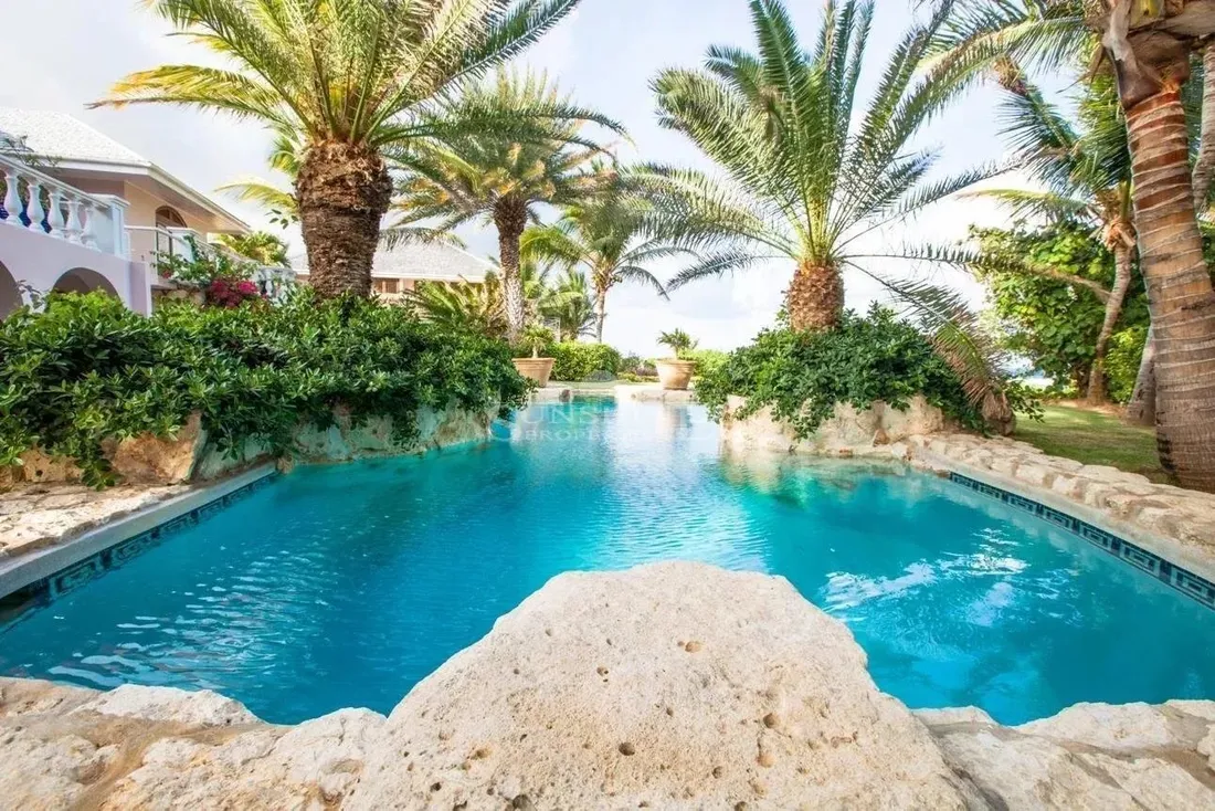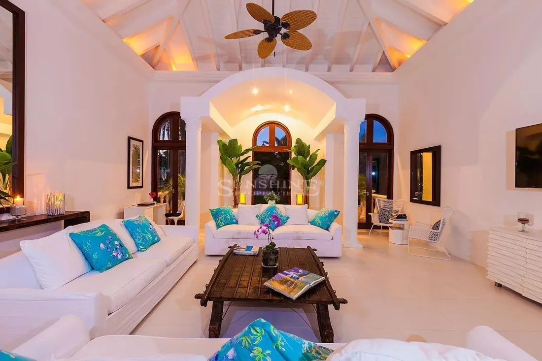 The villa is surrounded by lush, meticulously cultivated gardens filled with palm trees, hibiscus and bougainvillea and features a spectacular freeform stone swimming pool. The standard bearer for cool Caribbean elegance. The uniquely designed main lounge opens up onto to a large patio overlooking the pool, gardens and views of the Caribbean Sea.
