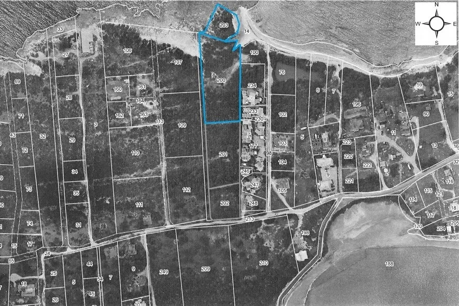 The property comprises two lots: the rear one (#200), a lovely lip of 1.57 acres leading to the beach, much of which sits on dry and solid ground (about half of the lot is partly swamped); and a front parcel (#203) of 0.81 acres, which traces the irregular shape of a breathtaking promontory embroidered with hard rock.