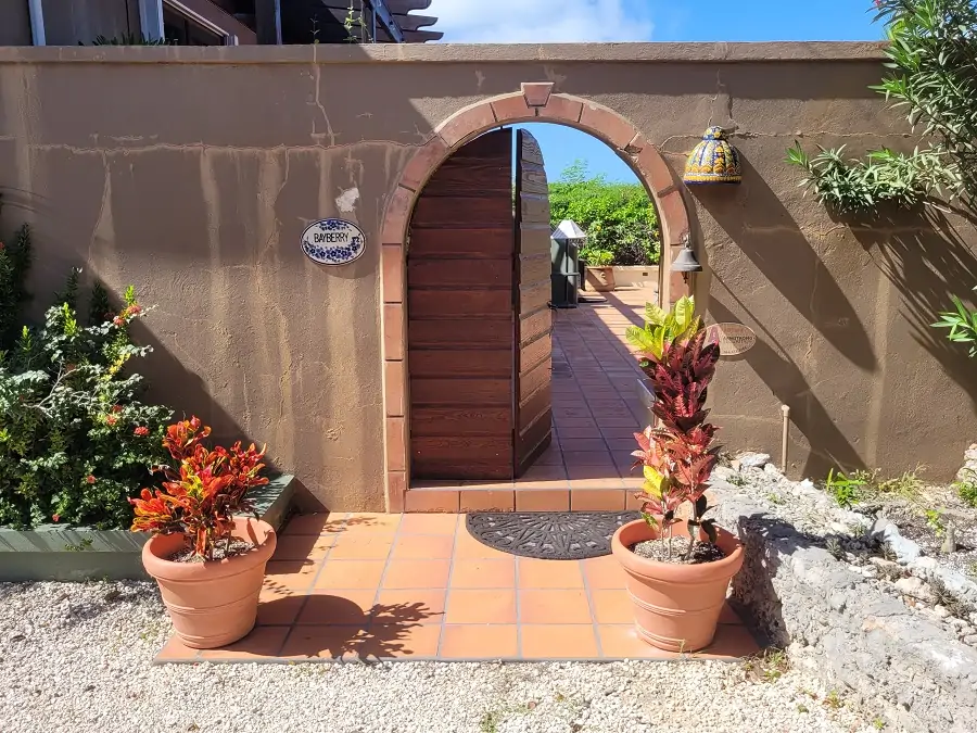 The main house, Bayberry on the south side, has a master suite with attractive wooden floors across both the bedroom and the bathroom (which features a lovely bath tub). The guest bedroom at the rear with the adjacent bathroom and the open plan kitchen-living room are tiled in Italian terracotta, as is the sprawling front-end terrace.