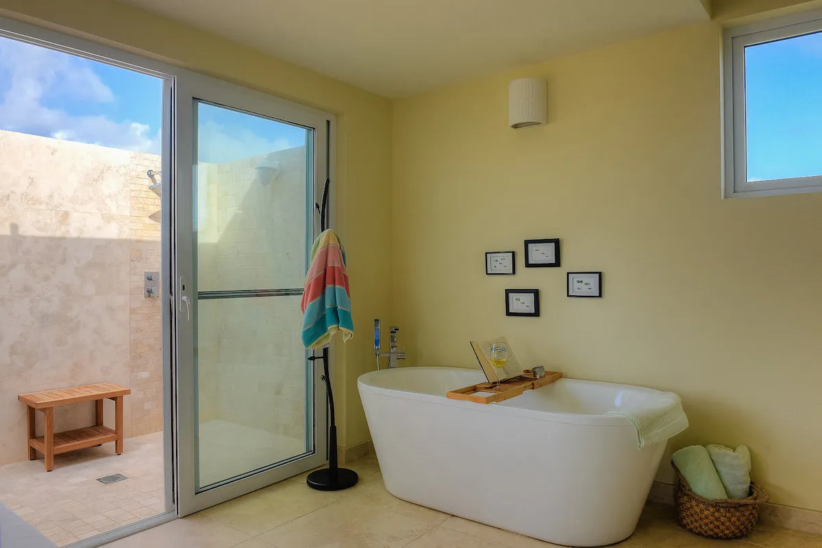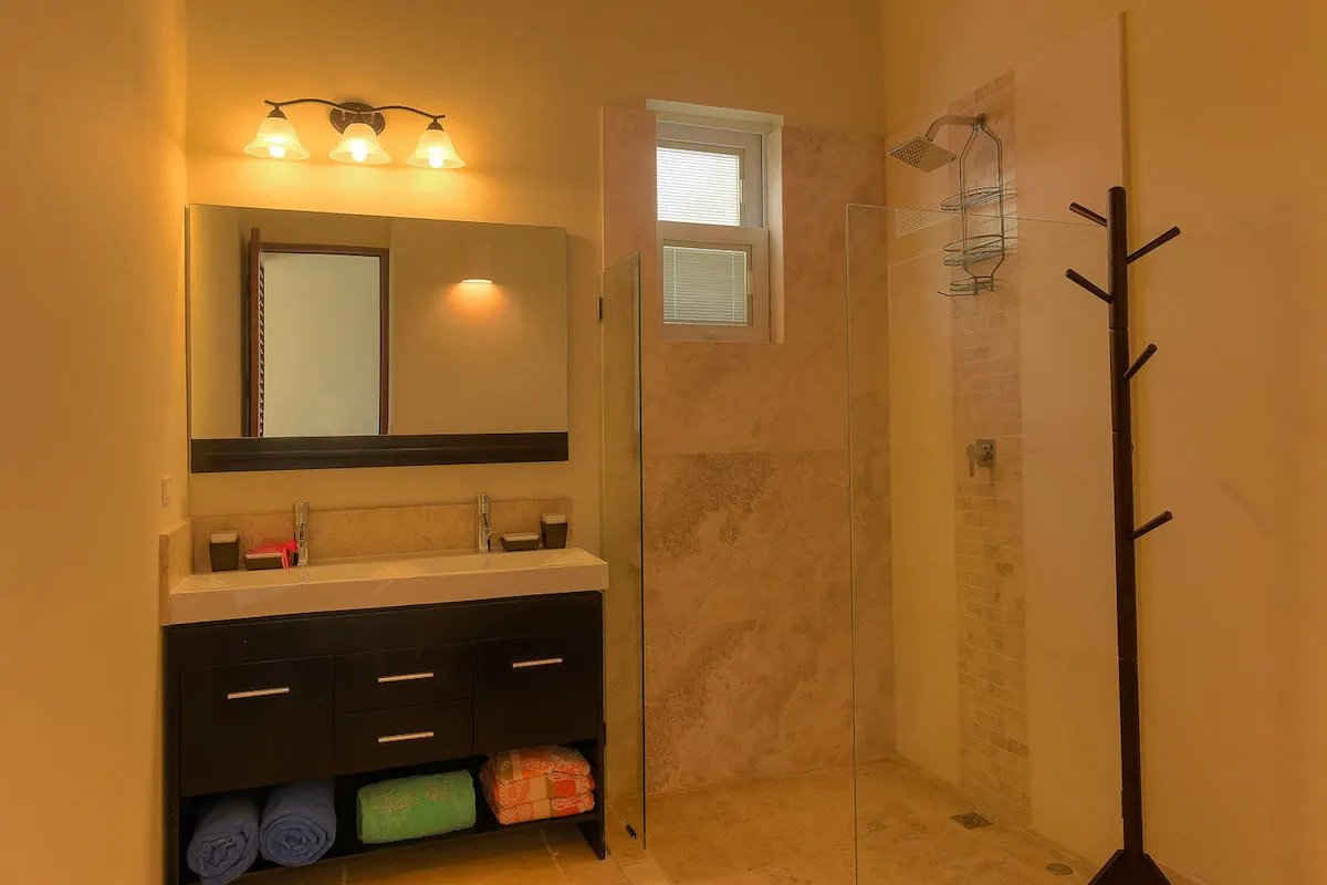 The outdoor living space includes a shaded dining area and plentiful lounge furniture for relaxing around the pool. The living area faces the view, and there are loungers around the pool if guest want to sunbathe or snooze. The terrace wraps around the back side of the villa, so there’s several places to relax and take in the view. The Great Room is huge, and sits in the middle of the villa with bedrooms on either side. The living room sits closest to the deck, and has a flat screen TV with cable, a sitting area, desk, and dining table. The kitchen is on the opposite side of the space, with a coffeemaker, breakfast nook, and basic appliances. The Master Bedroom and laundry room are on the left side of the Great Room. The Master Bedroom has a king-sized bed, terrace access, walk-in closet, and ensuite bathroom. The bathroom is oversized, and has a soaking tub and outdoor shower. On the opposite side of the Great Room, two bedrooms are connected via the patio. One has a king-sized bed, and one has two twin beds that can be converted into a king. Both ensuite bathrooms have walk-in showers.