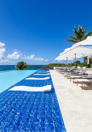 Villa Paradise features a stunning 28’ x 69’ infinity edge pool spilling over to the Caribbean Sea and a private luxurious inground spa surrounded by an ivory stone deck with remarkable views. In addition, there are shaded outdoor areas featuring double hammocks.
