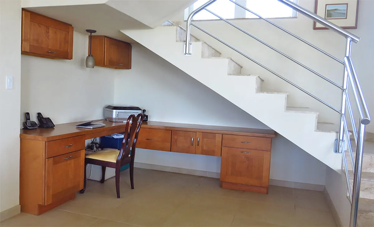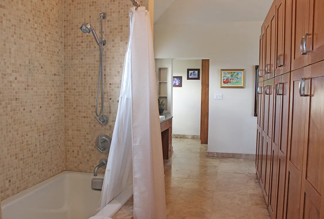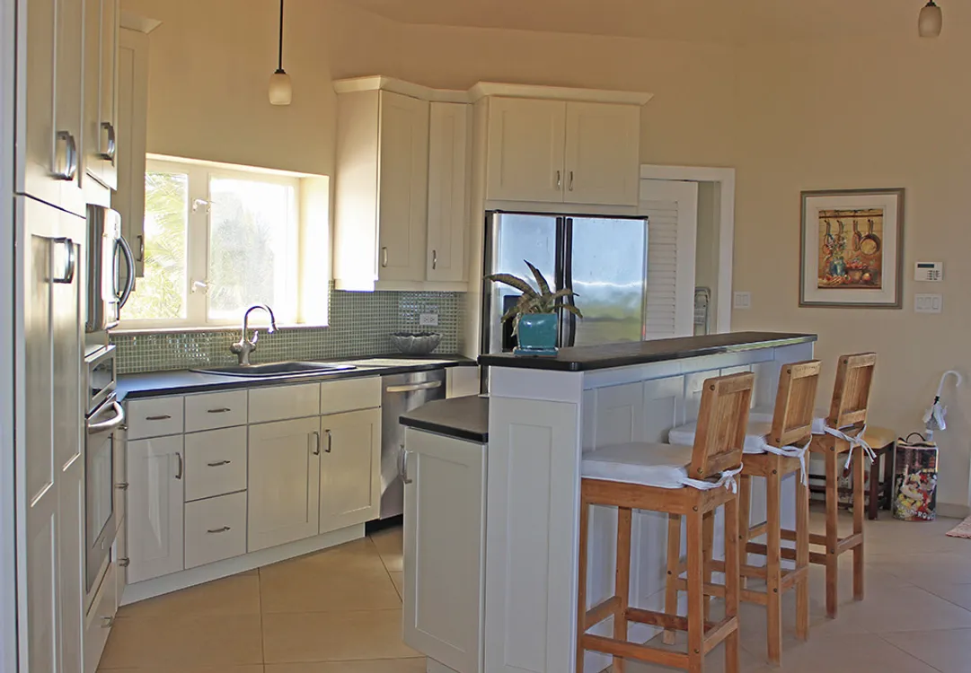 The floors are Anguillian natural stone as is the staircase which add a lovely touch to the bright and airy interiors. Kitchen is spacious and light, well outfired with granite counter tops and high quality appliances and opens into a large dining area. Each of the two bedrooms boasts top quality American made cabinetry and ensuite bathrooms with Travertine showers. The master is on the second level and has the addition of an outside shower, walk- through closet and 180 degree views.