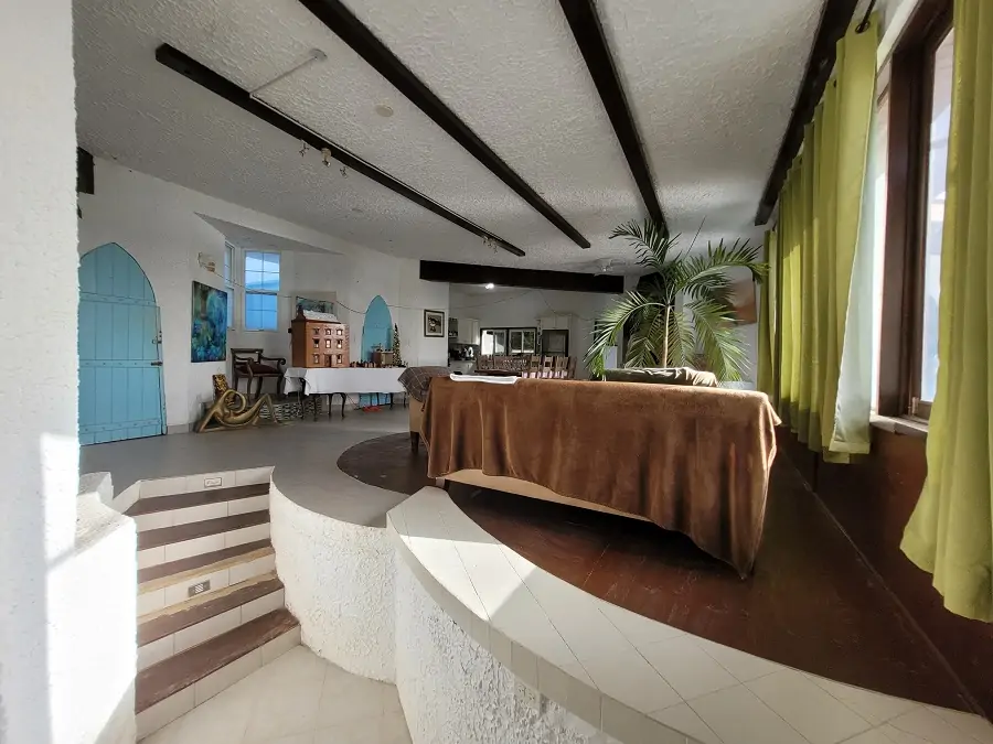 The neighbouring seafront villa, Adagio, is also available for purchase from the same sellers. Like Soto, Adagio sits on half an acre of land. While both villas are in need of extensive works, together they comprise an imposing full-acre property with the highest of ceilings.